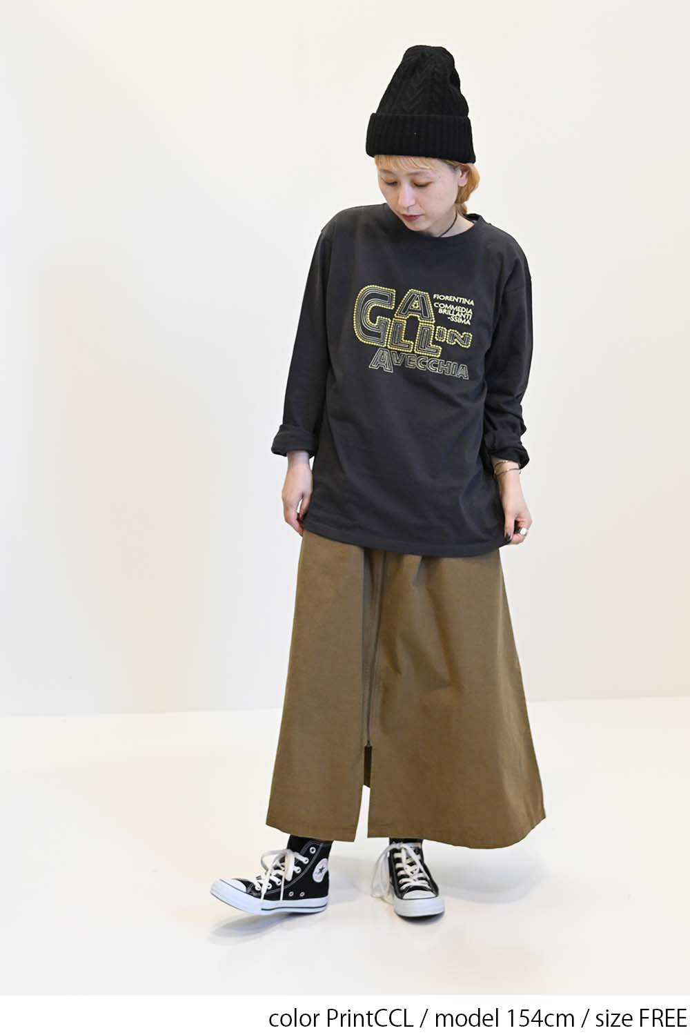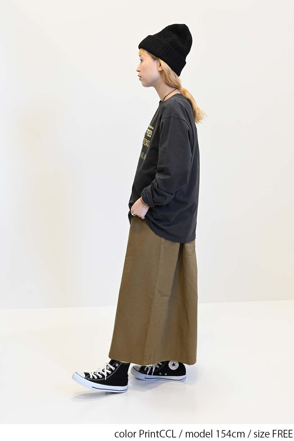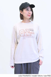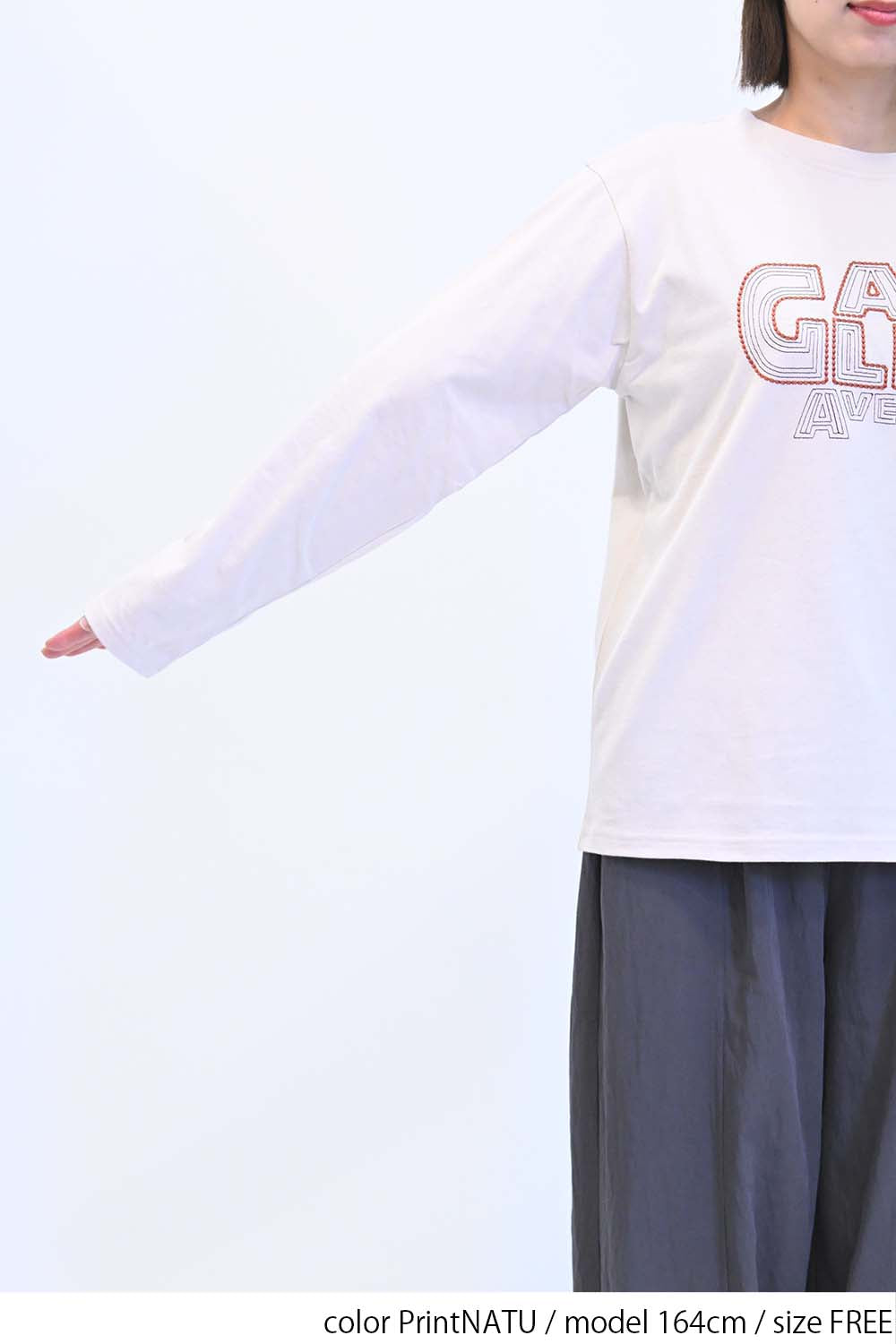 ストリート感あふれるロゴプリントが目を引くロングTシャツ。