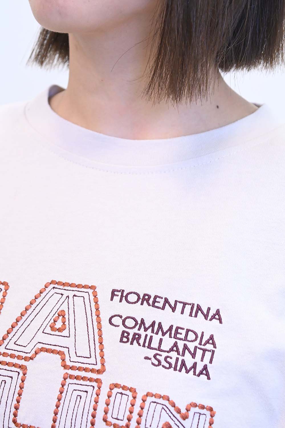 ステッチとドットを組み合わせた刺繍デザインが、シンプルながらも存在感を放ちます。