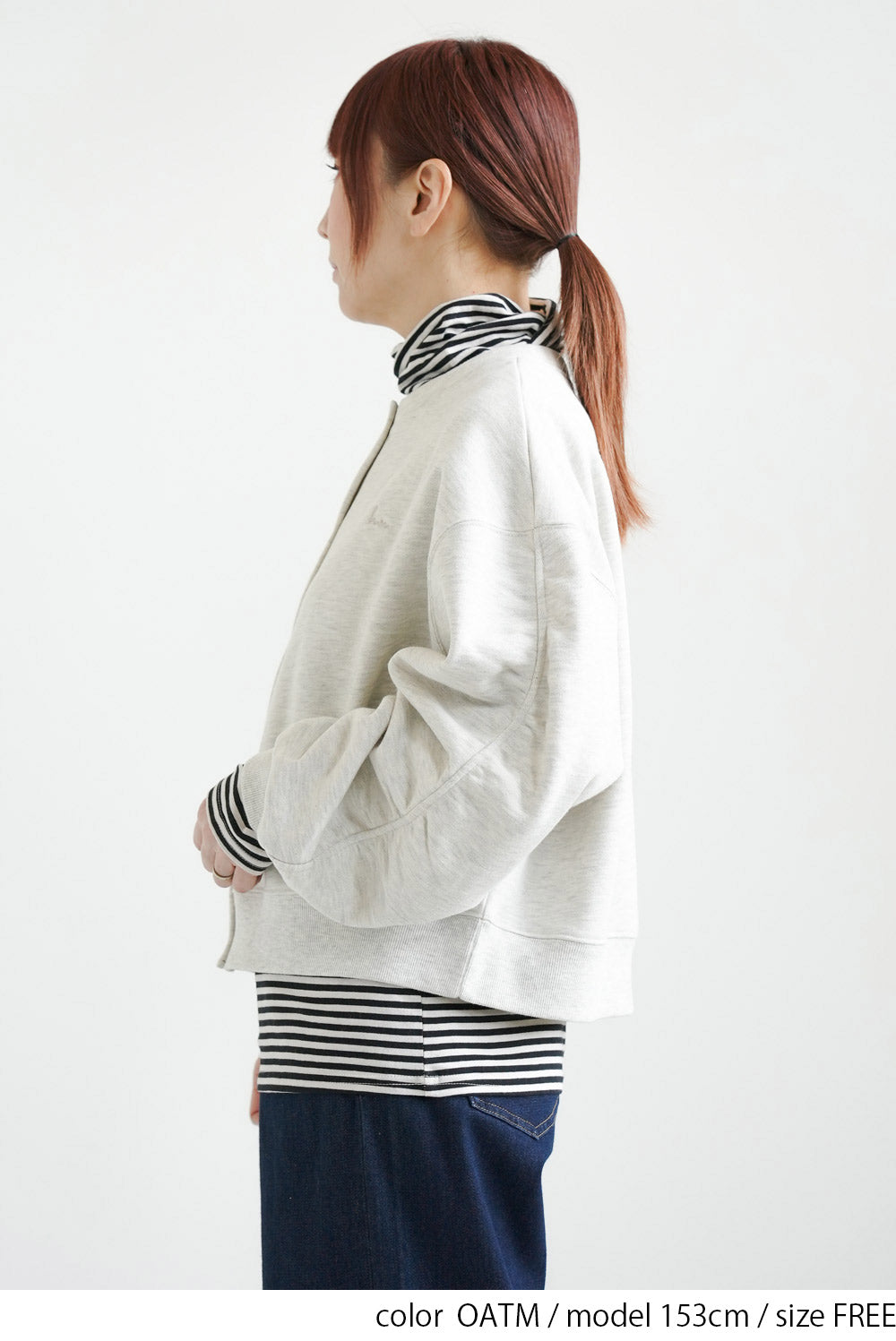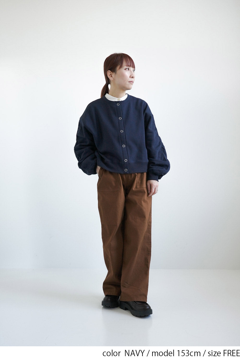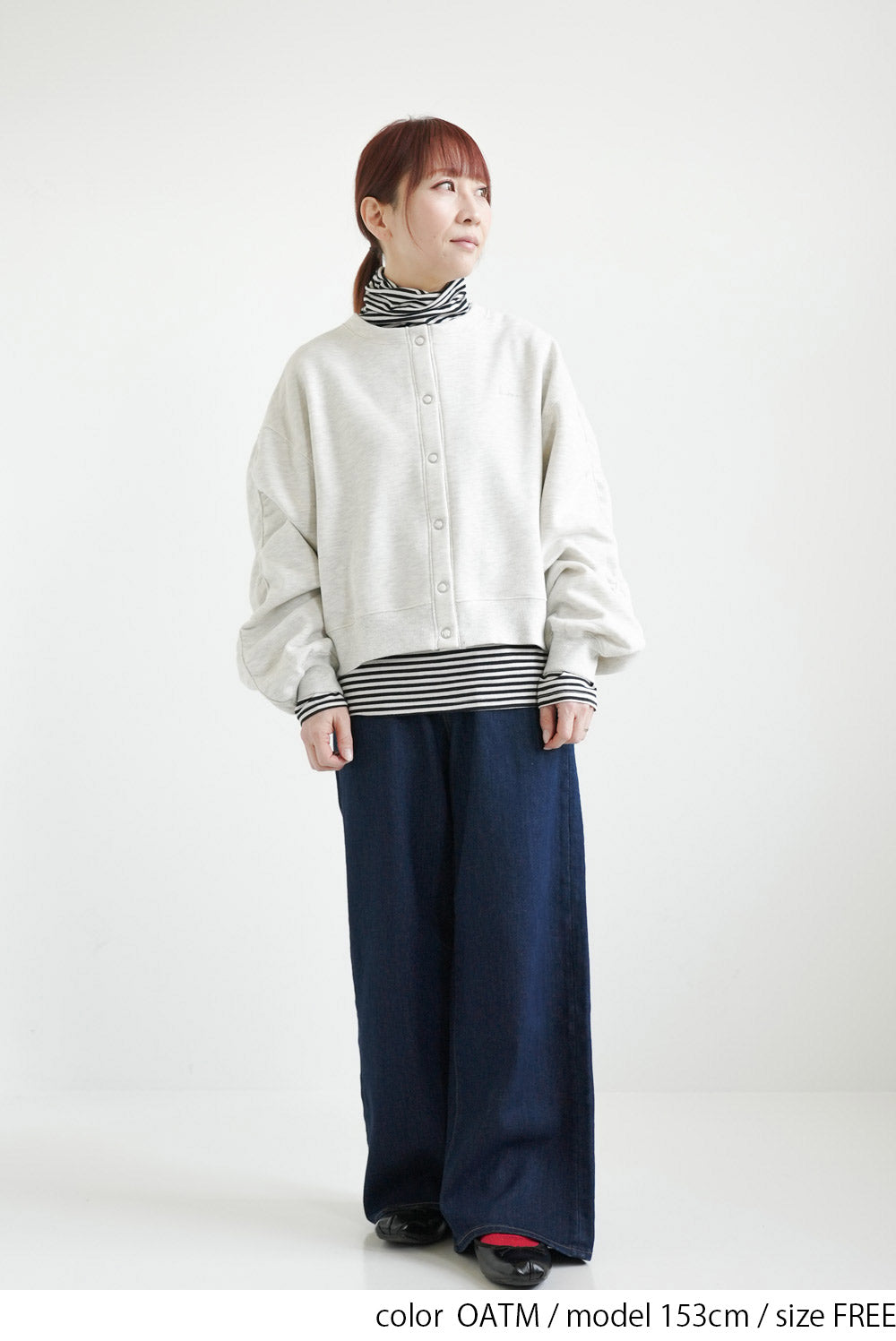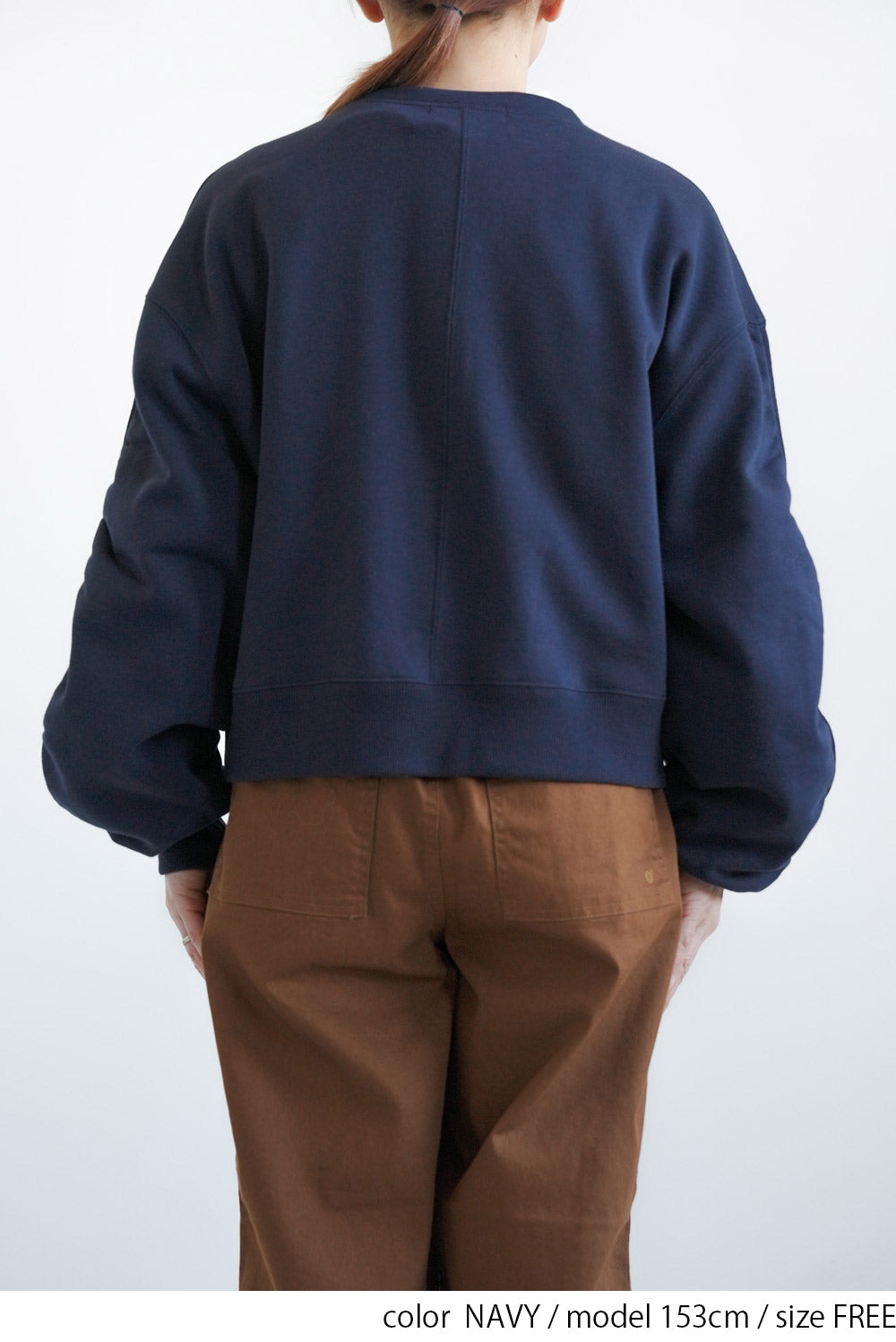 短め丈なので、ハイウエストパンツやフレアスカートと合わせるとバランス良く決まります。