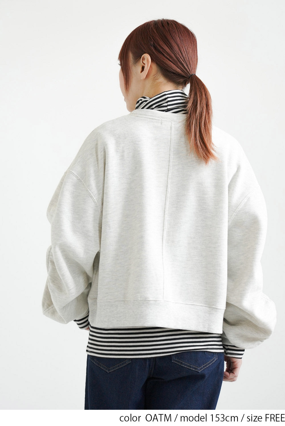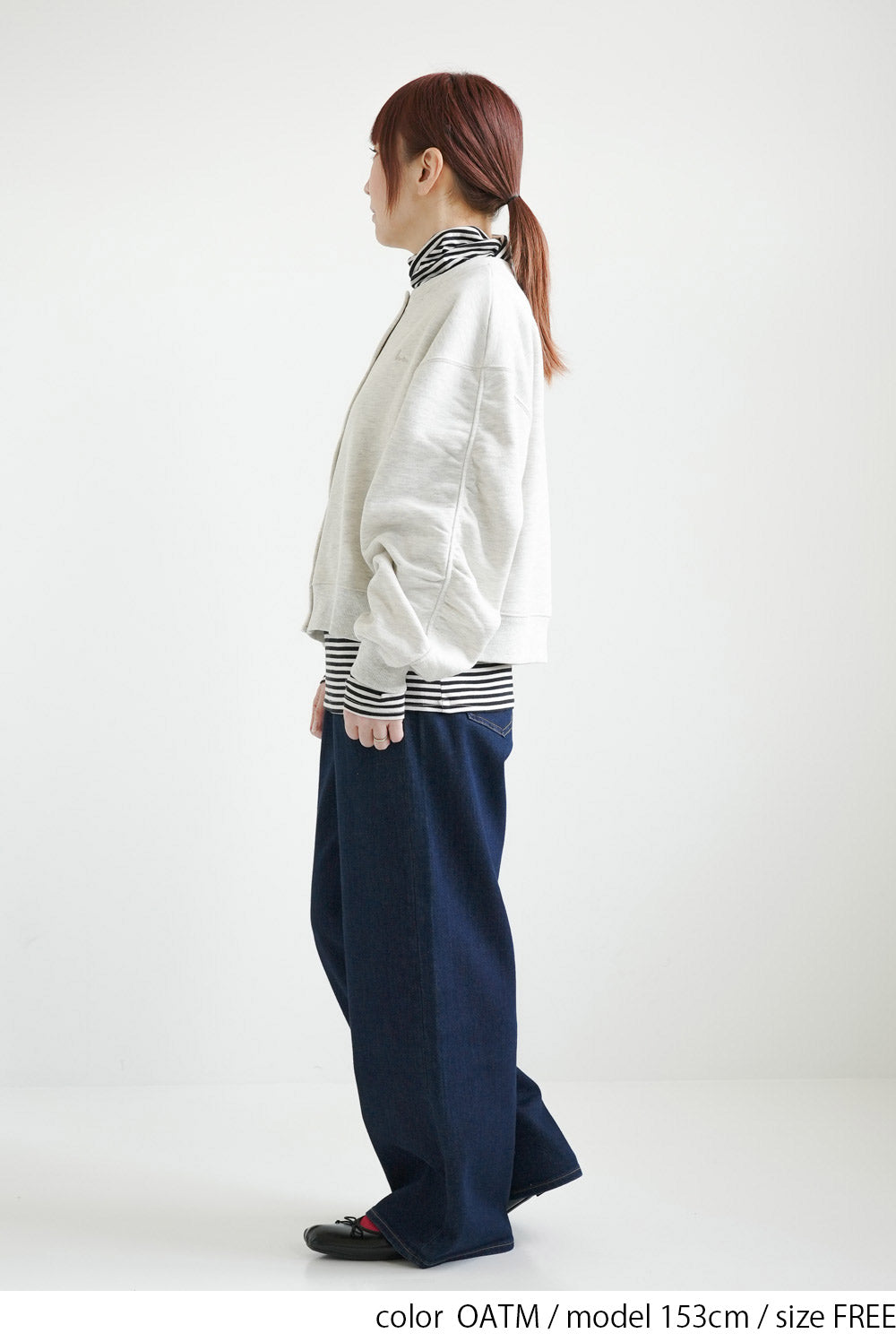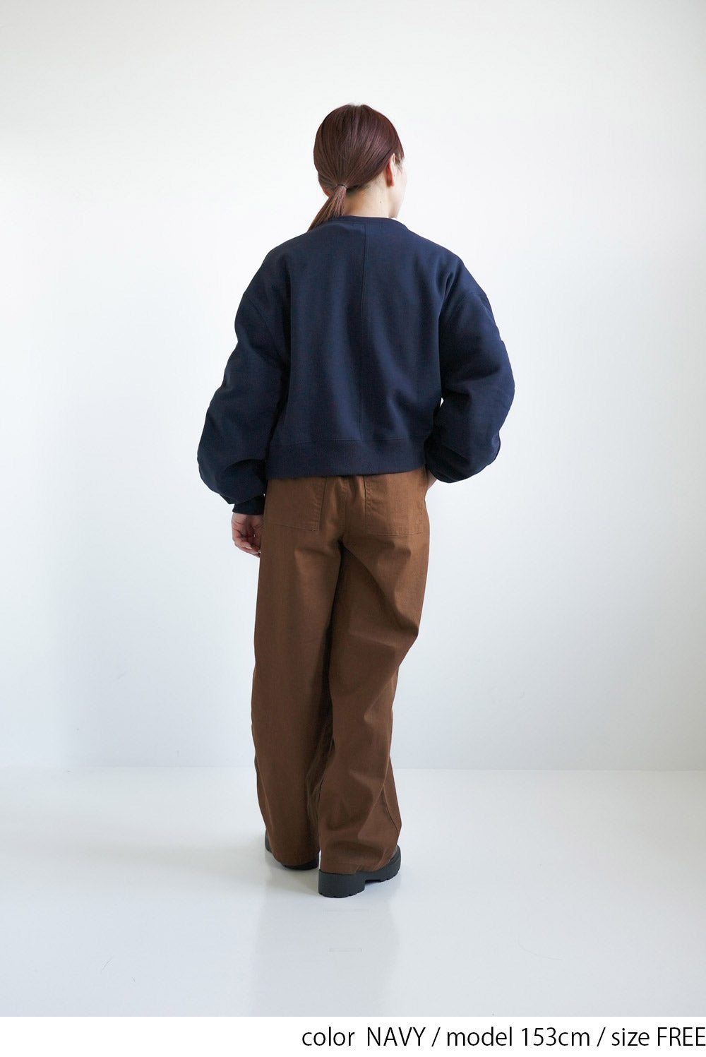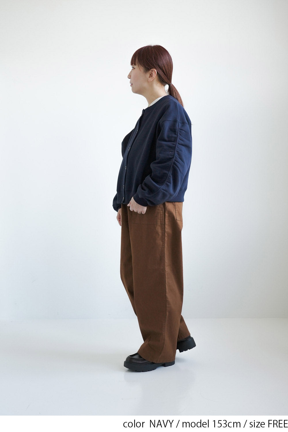 短め丈なので、ハイウエストパンツやフレアスカートと合わせるとバランス良く決まります。