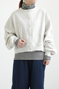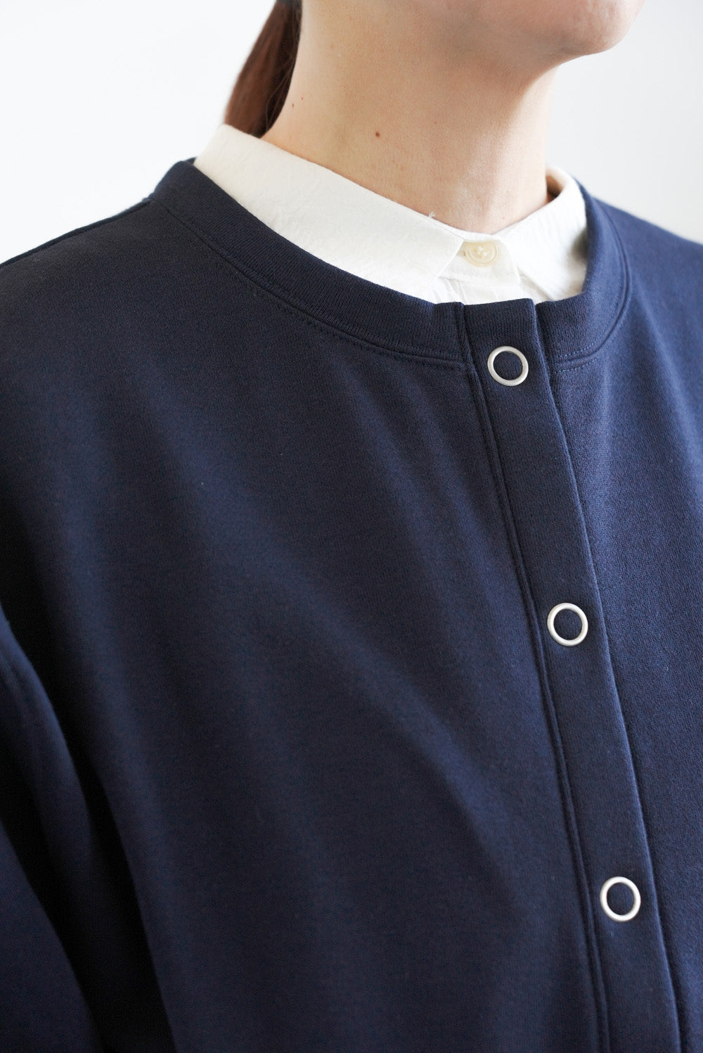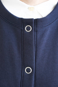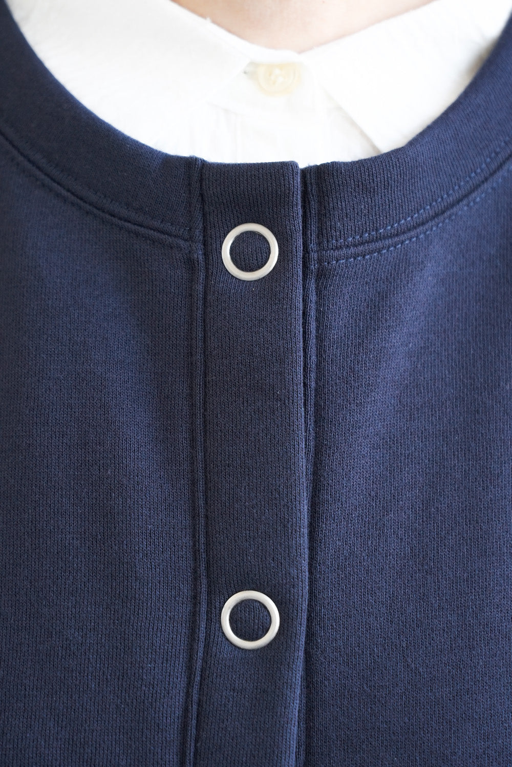 クルーネックのシンプルなデザインに、フロントは着脱しやすいリングドットボタン仕様。