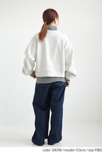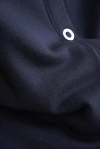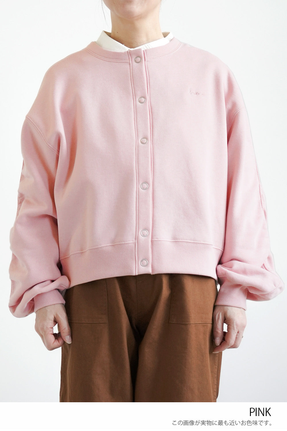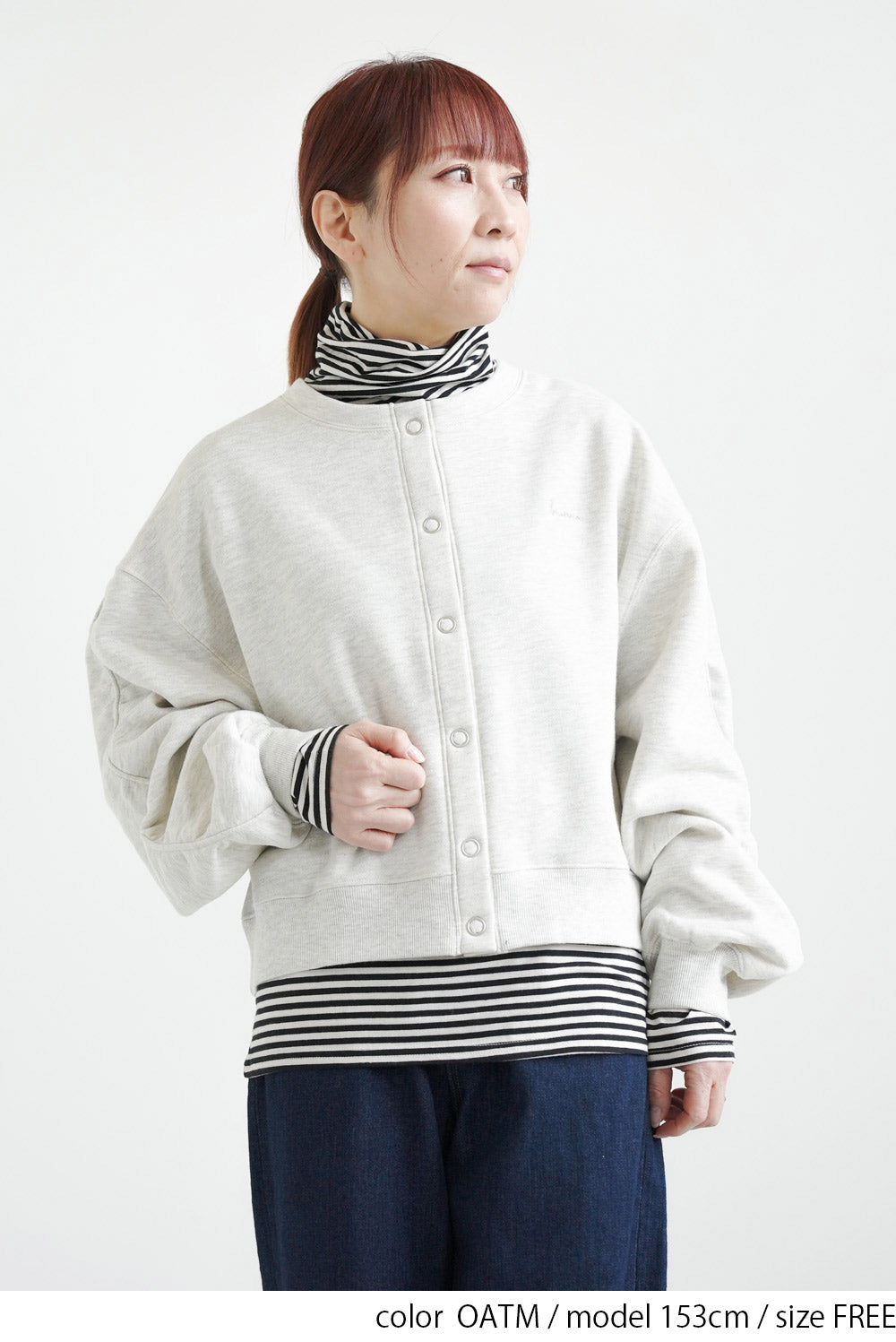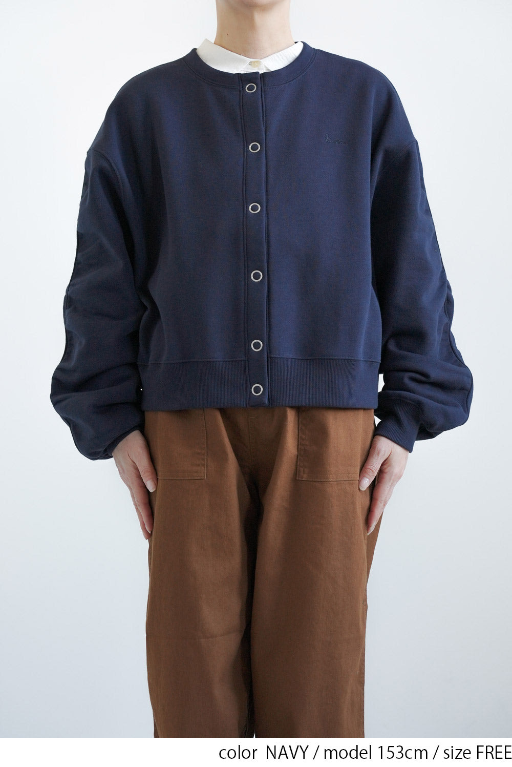 クルーネックのシンプルなデザインに、フロントは着脱しやすいリングドットボタン仕様。