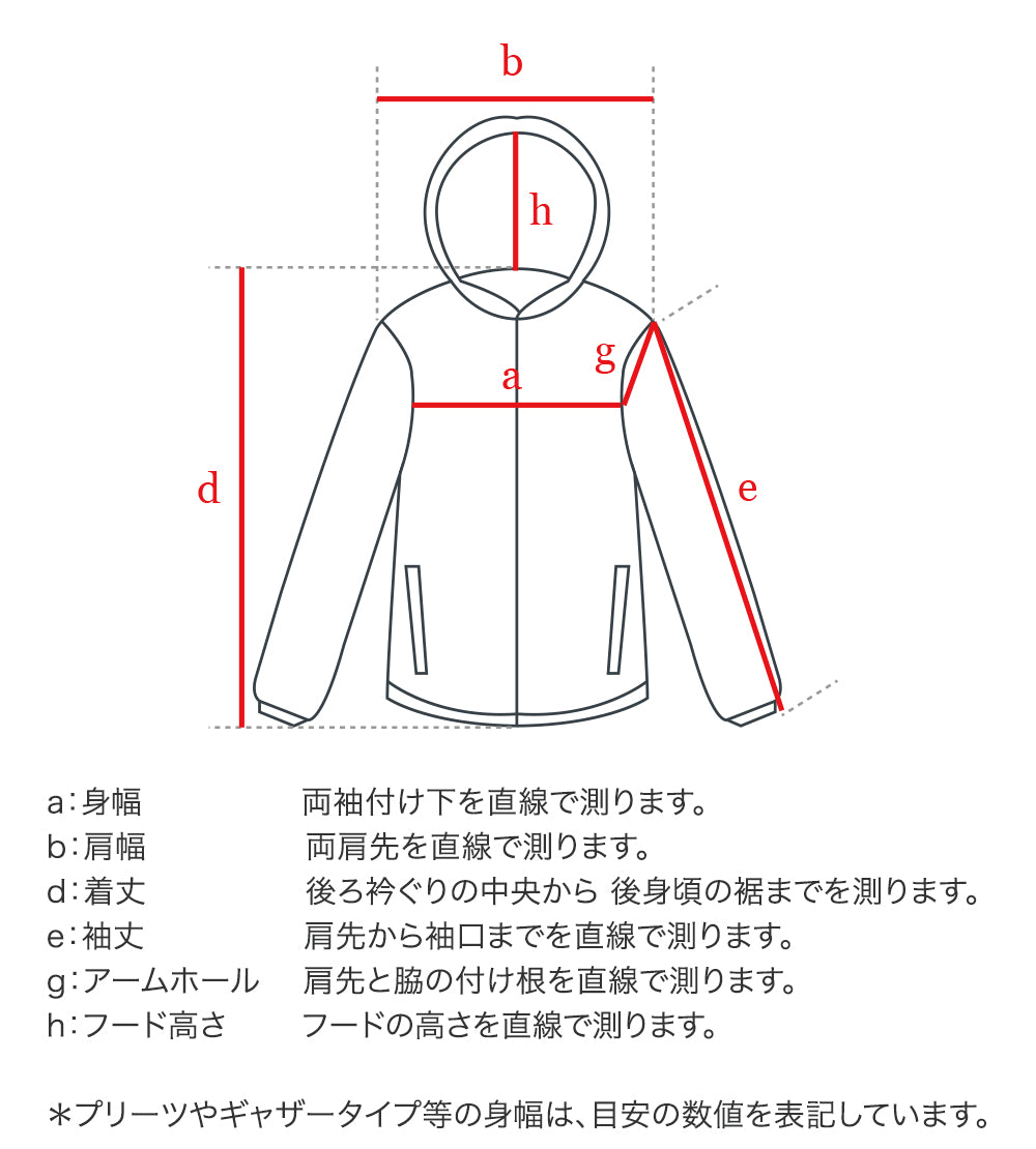 サイズ | 身幅 | 肩幅 | 着丈 | 袖丈 | アームホール | フードの高さ |