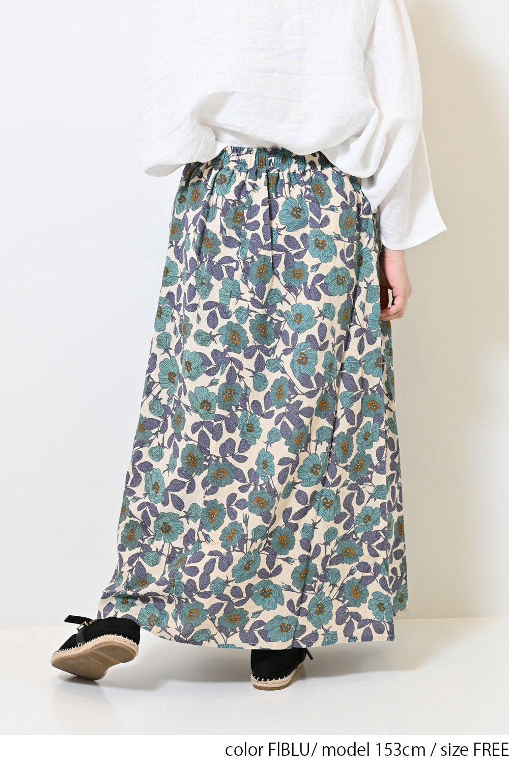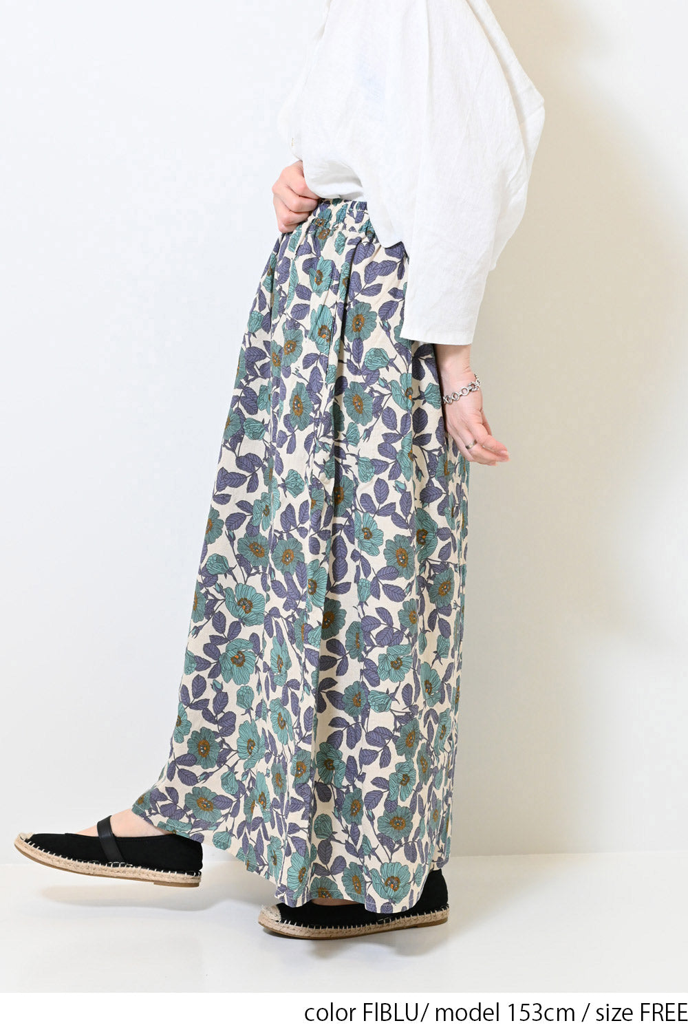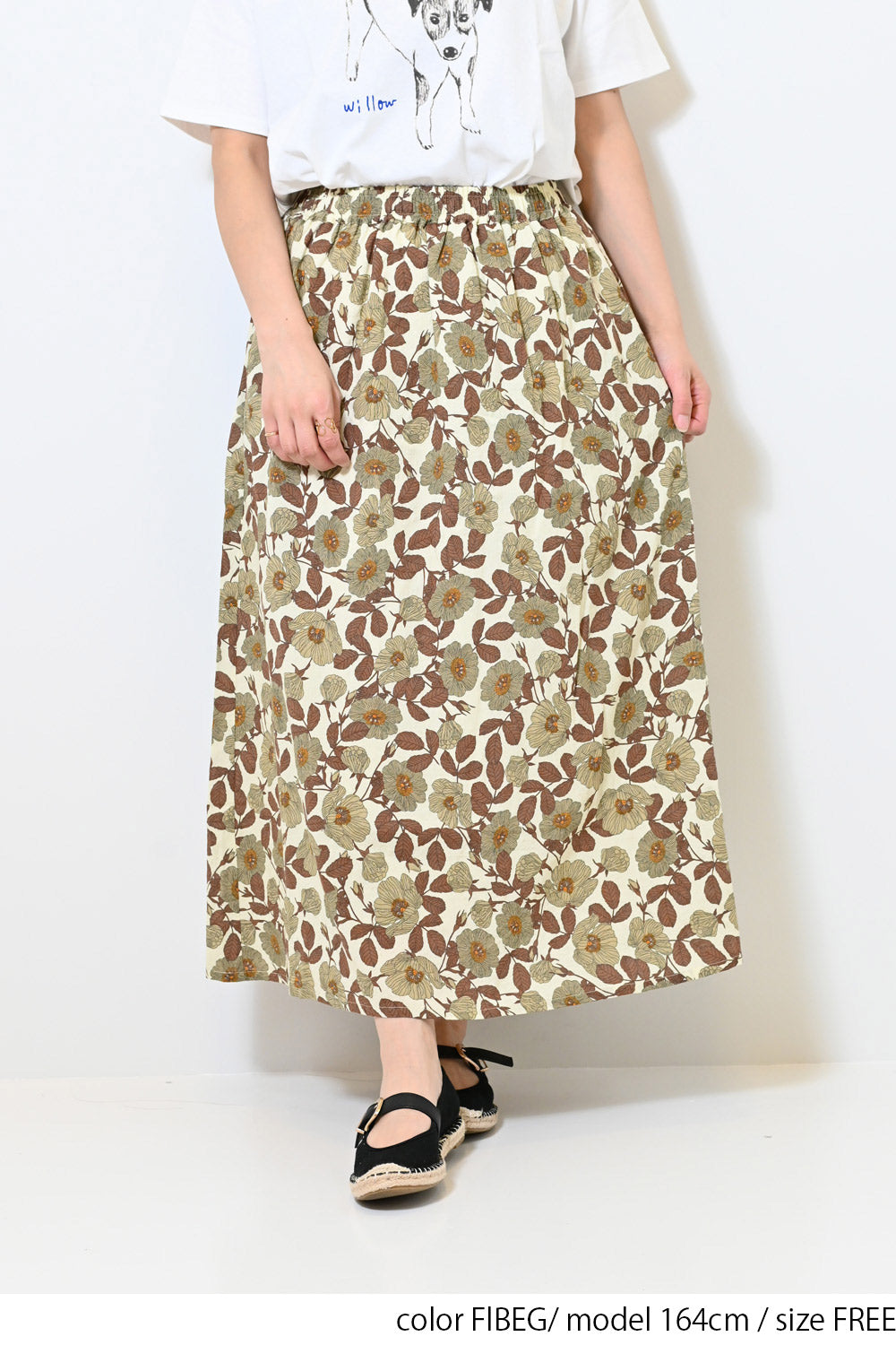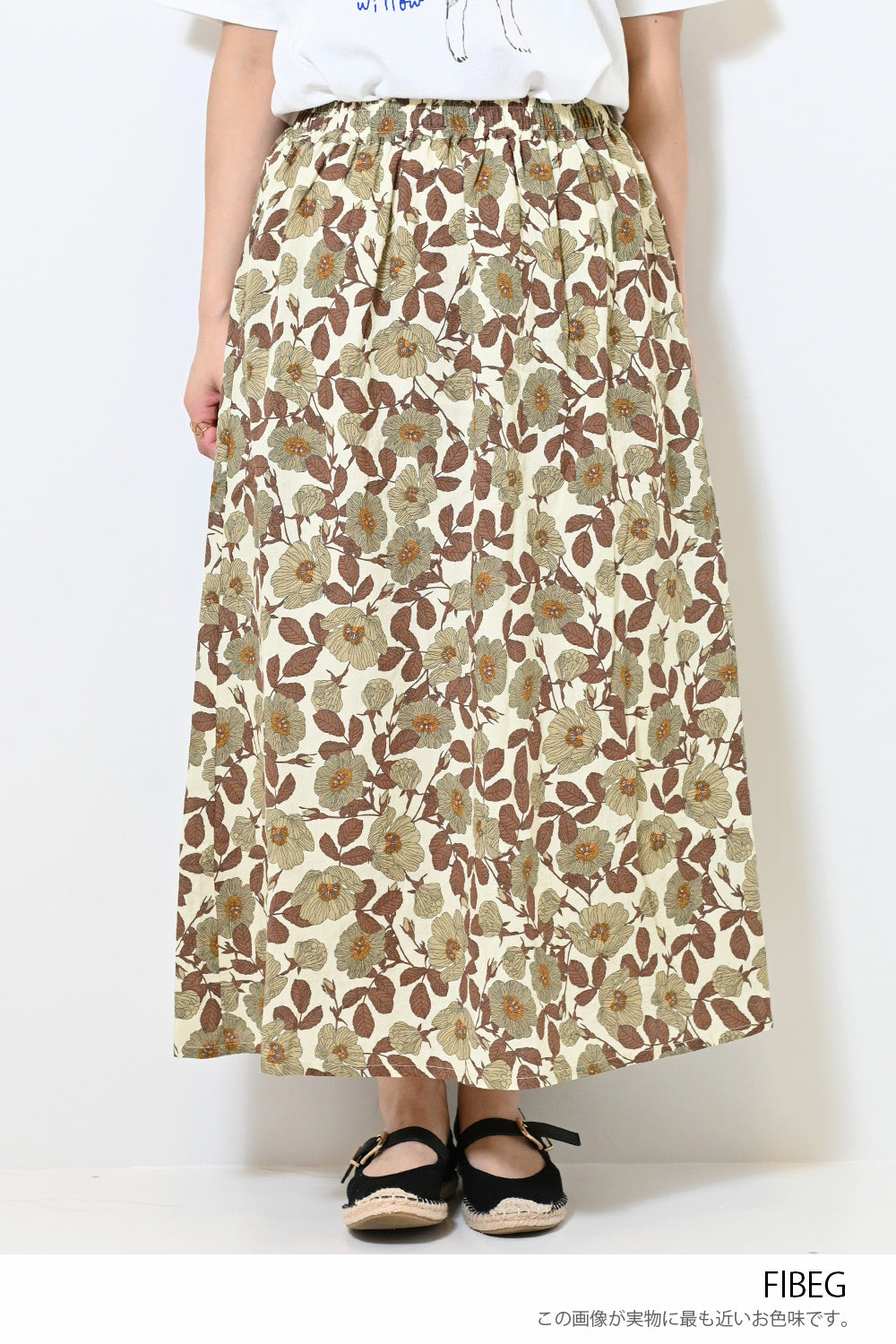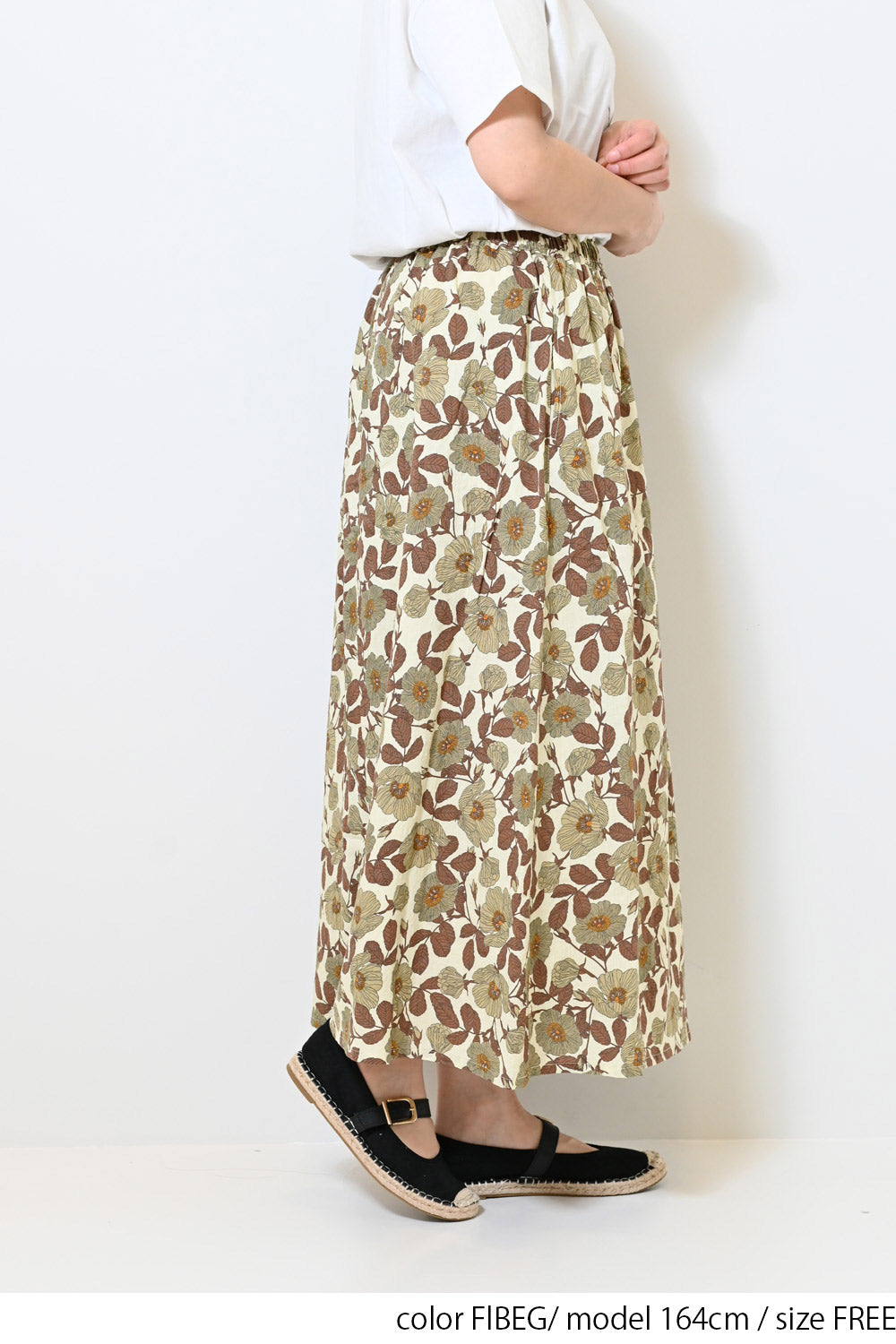 ふんわり軽やかな綿レーヨン素材に、大胆な大柄フラワーをのせた華やかなギャザースカート。
