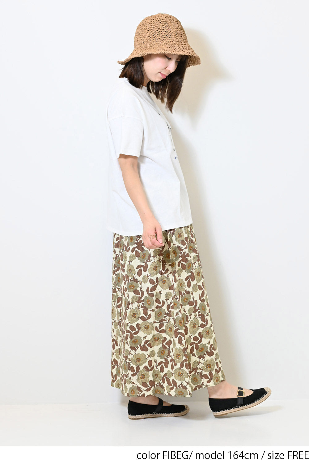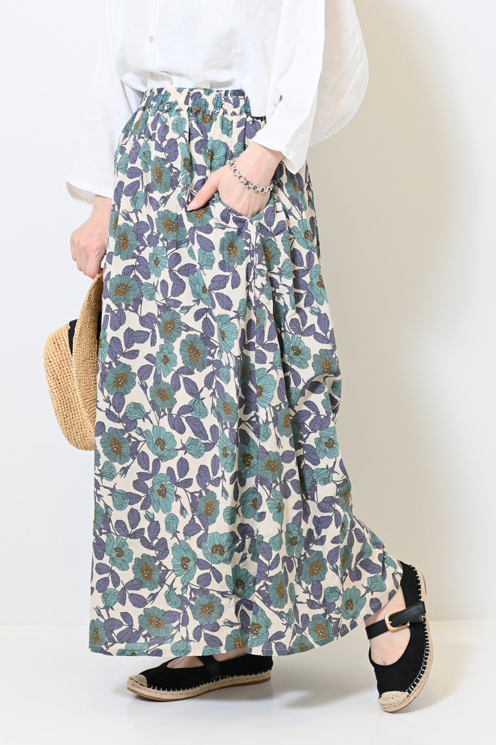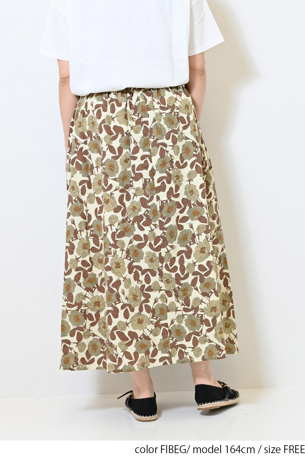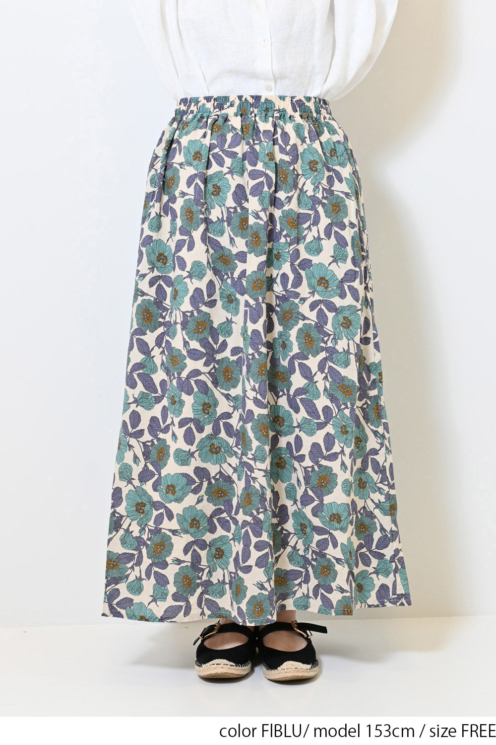 ふんわり軽やかな綿レーヨン素材に、大胆な大柄フラワーをのせた華やかなギャザースカート。