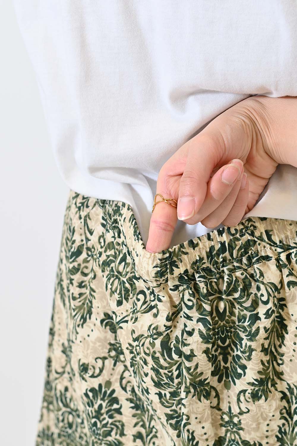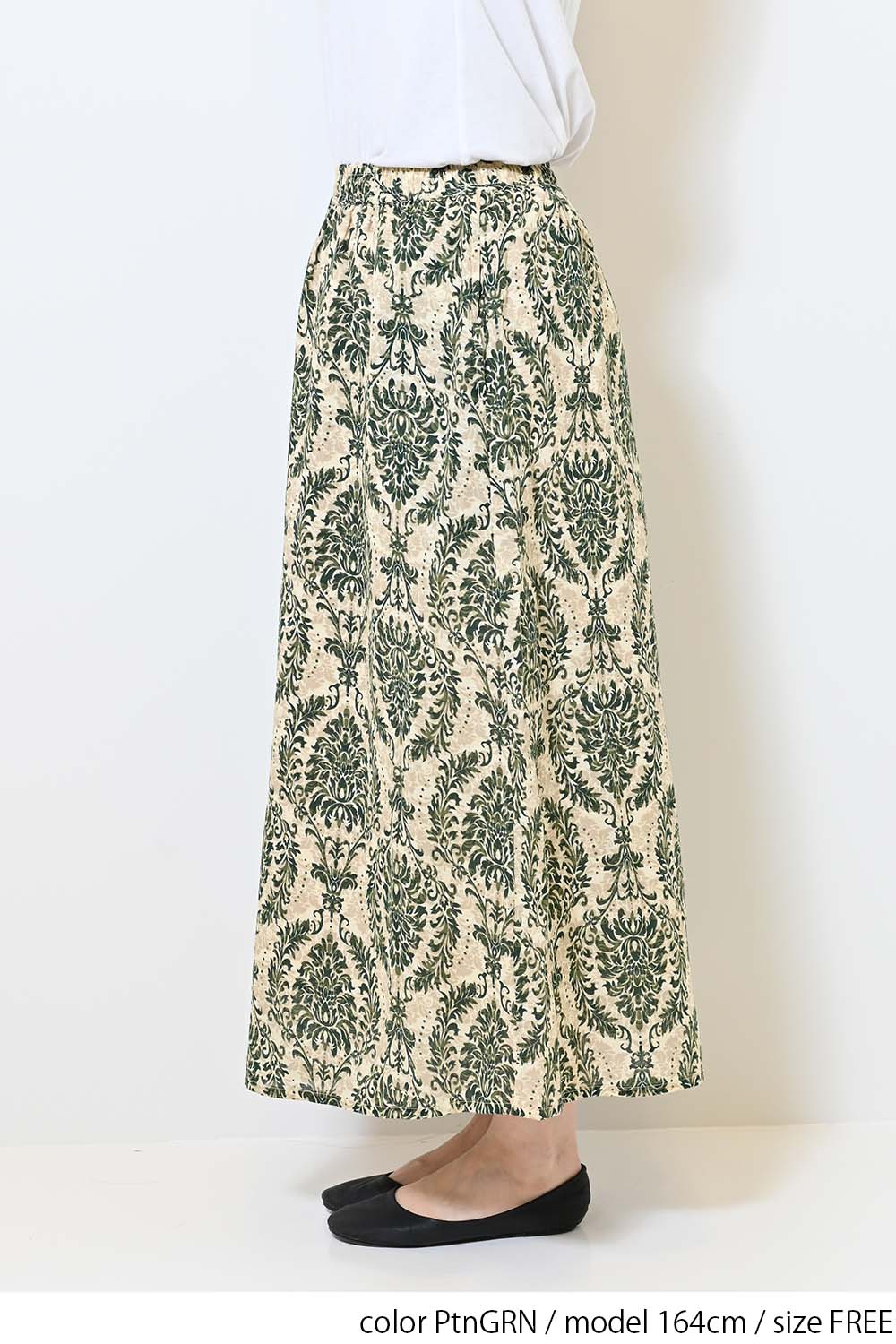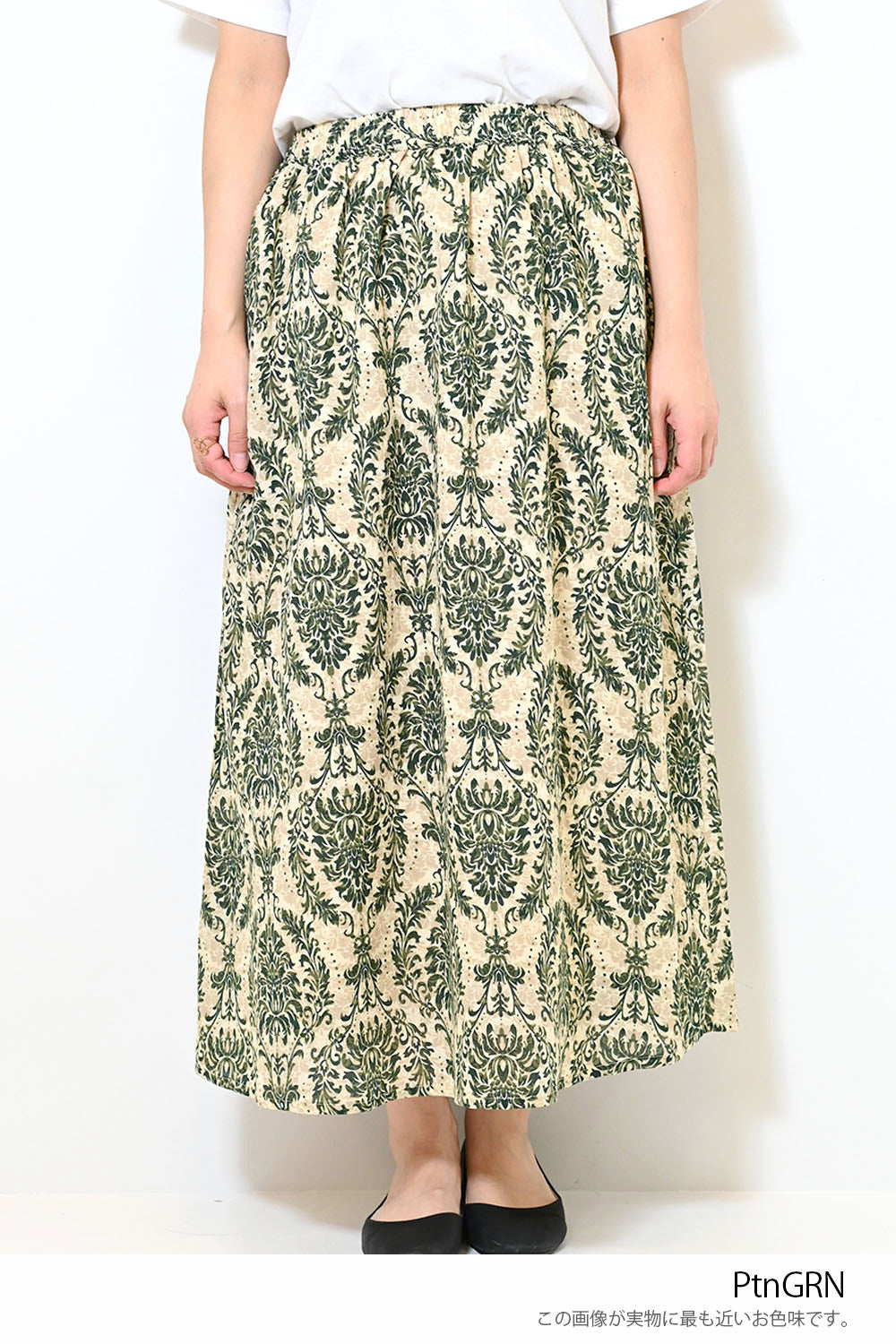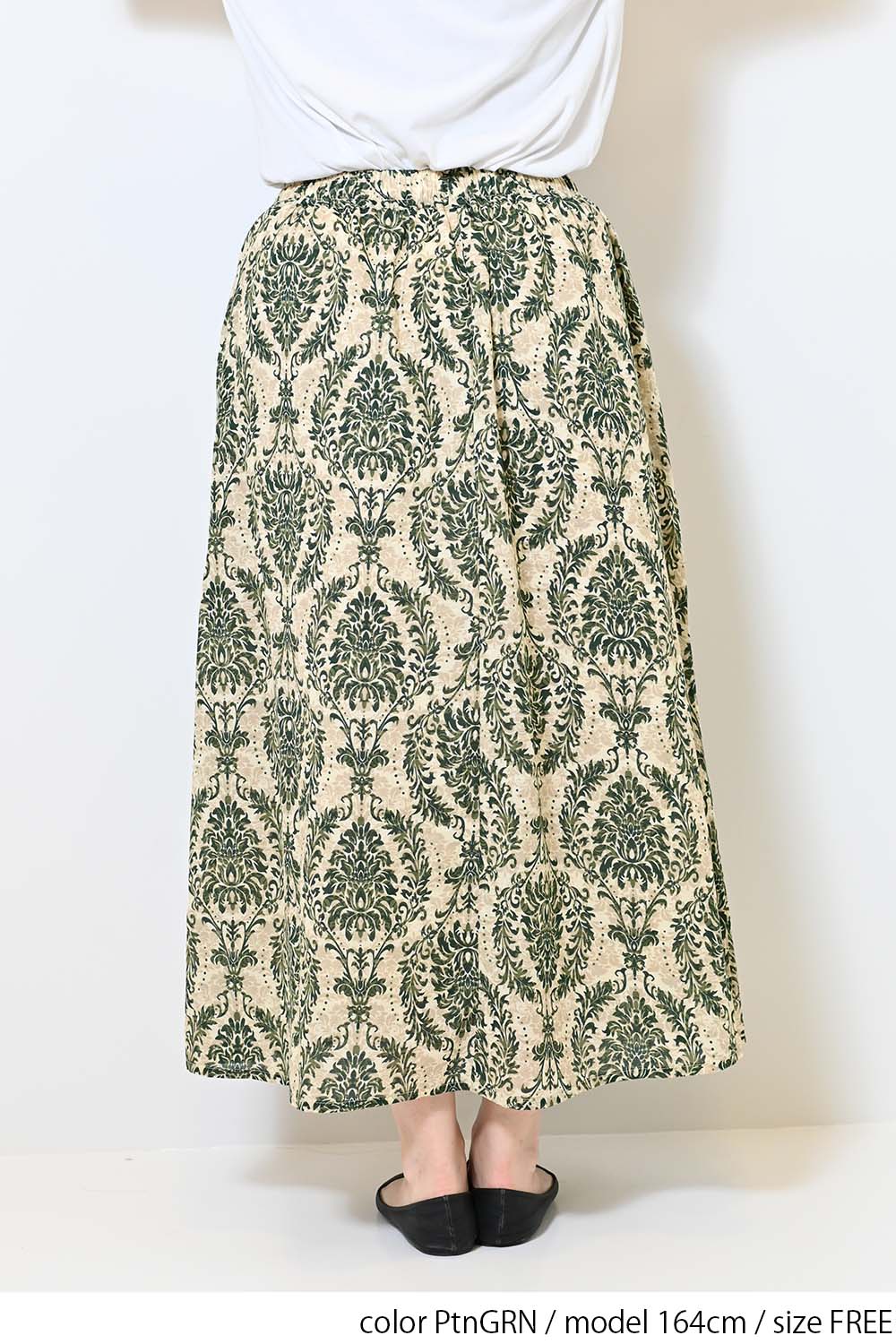 クラシカルなダマスク模様が目を引く、存在感たっぷりのギャザースカート。