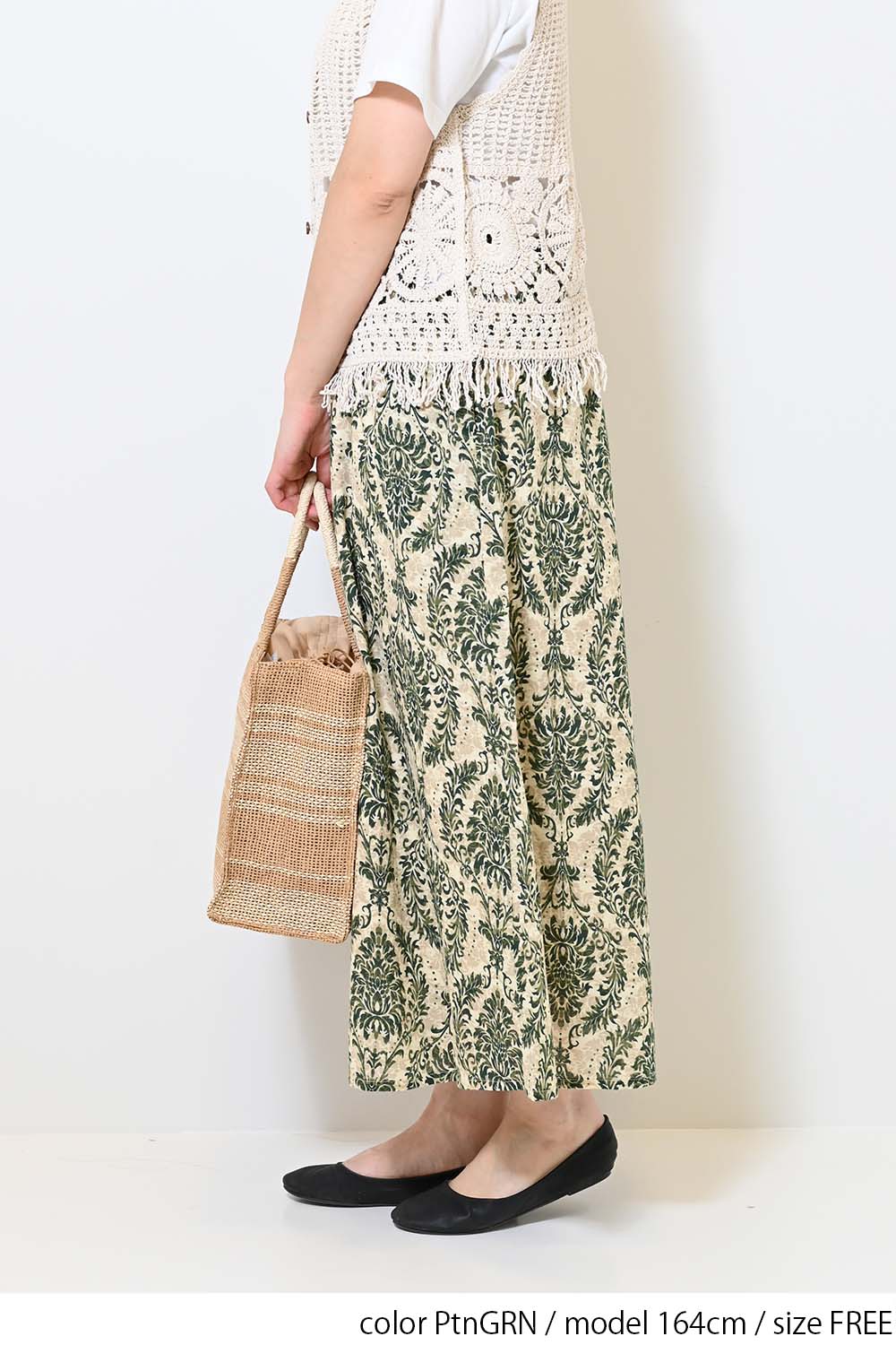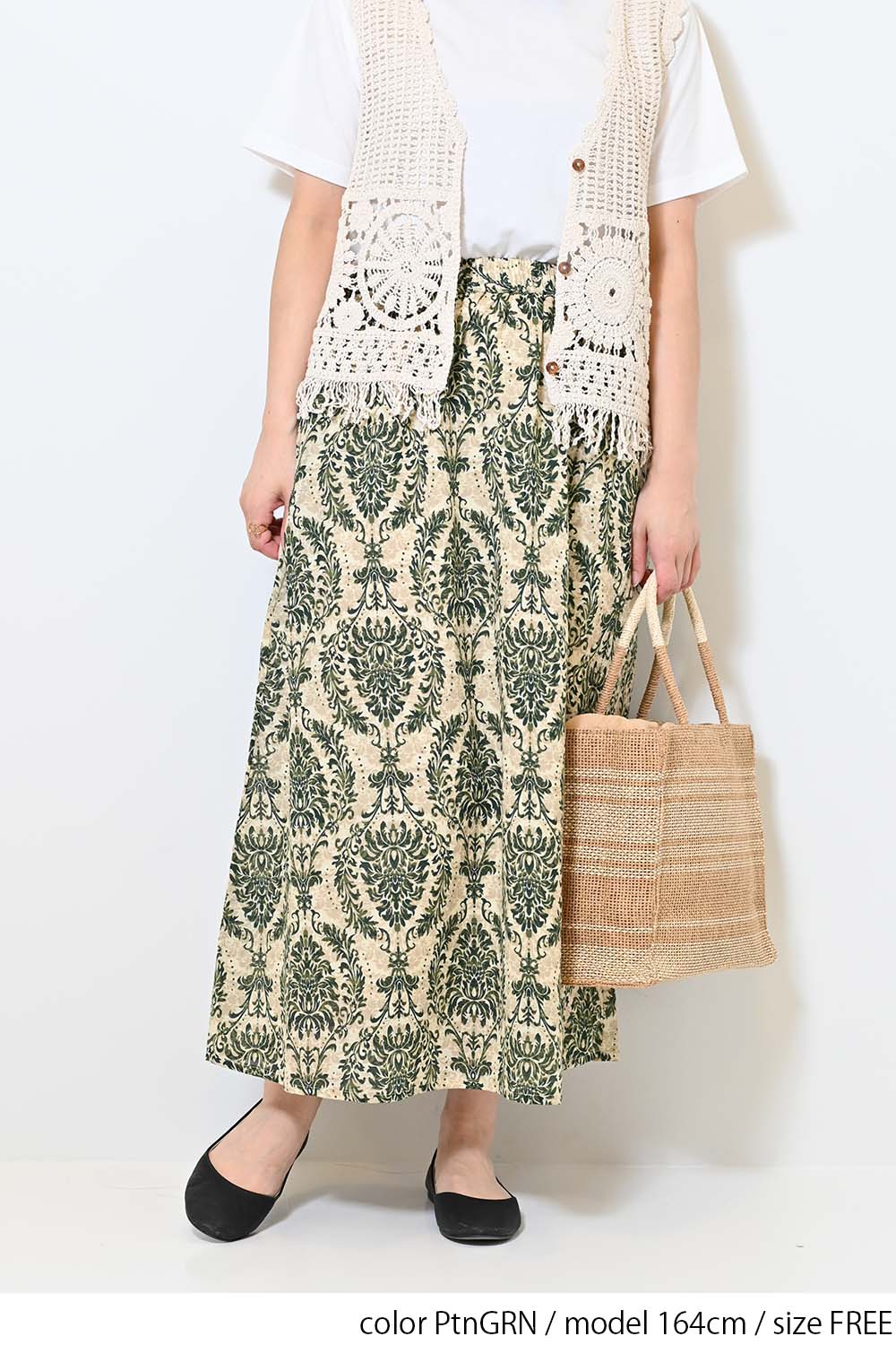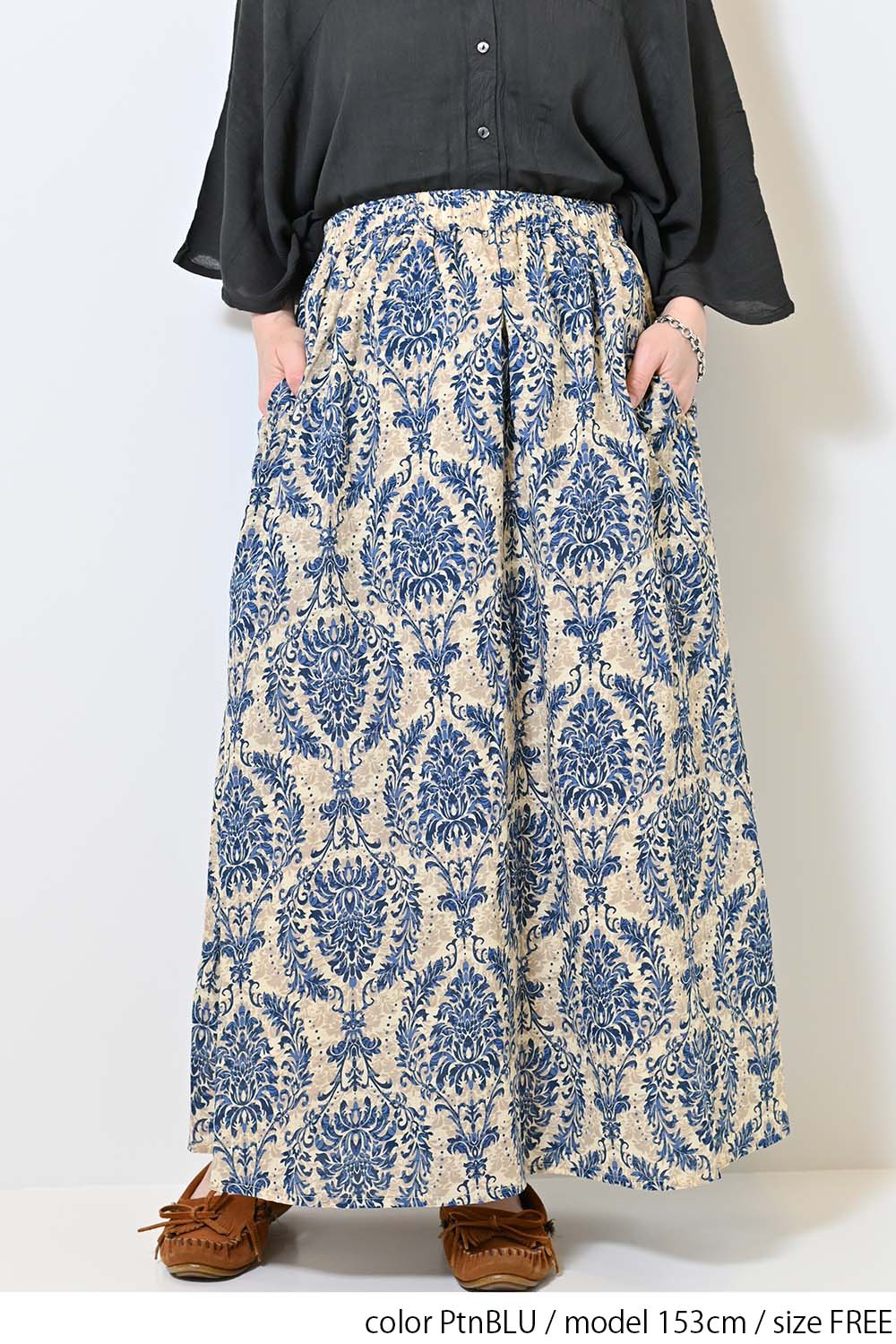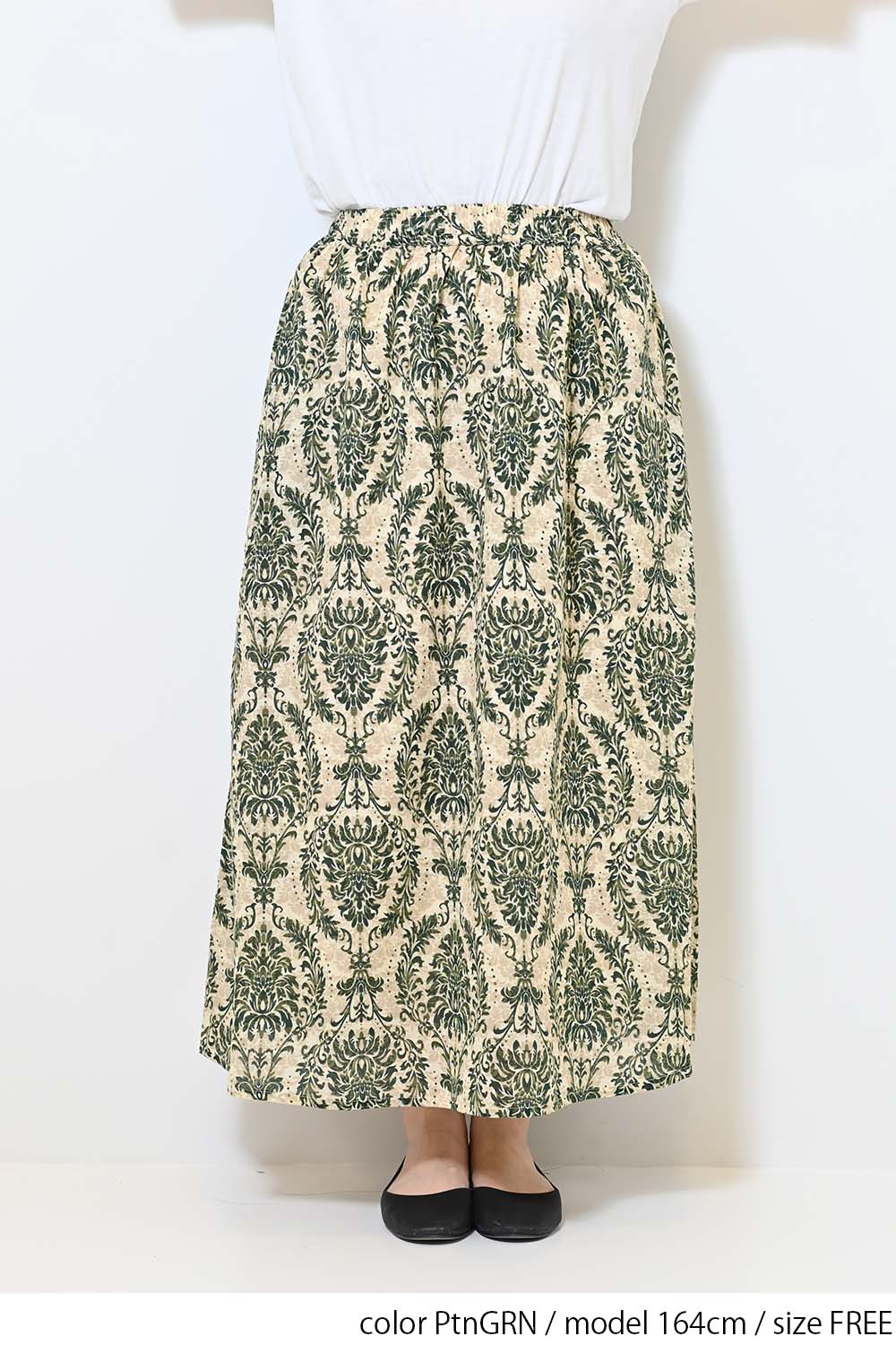 クラシカルなダマスク模様が目を引く、存在感たっぷりのギャザースカート。