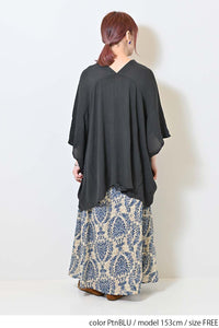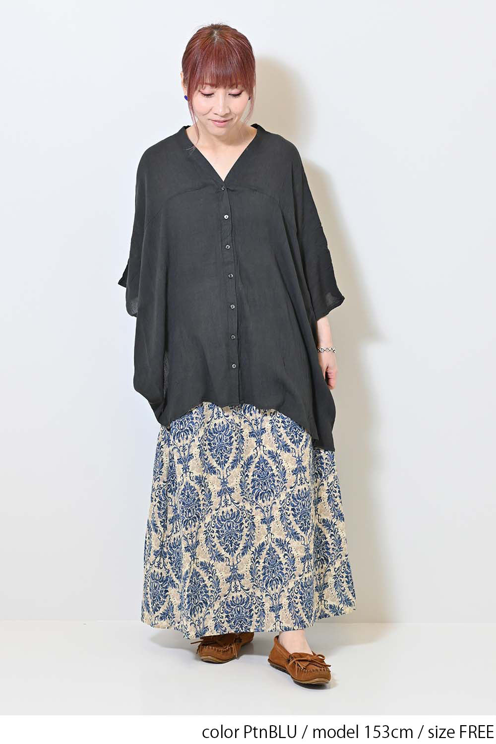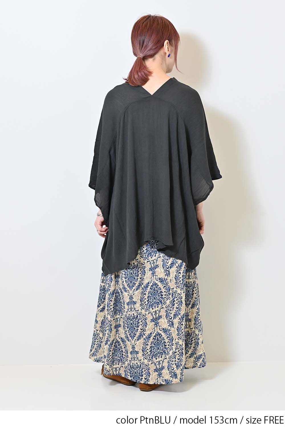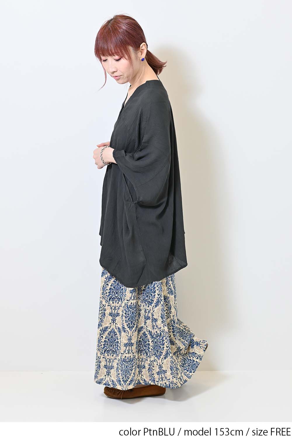 ふんわりと広がるシルエットに、大胆な柄が映える1枚です。