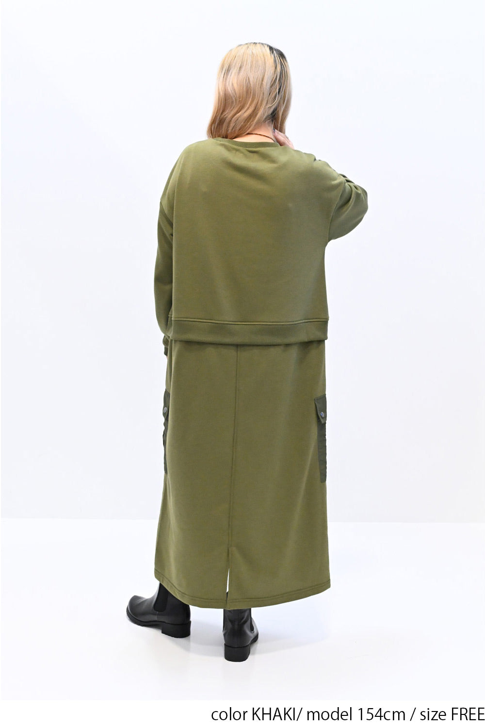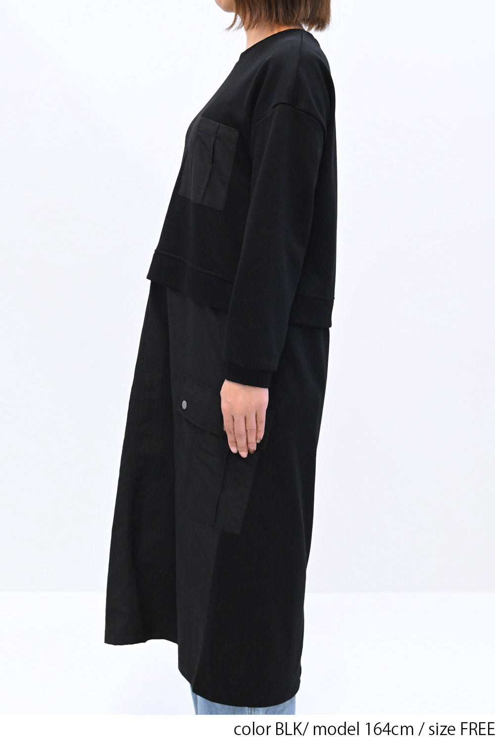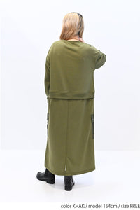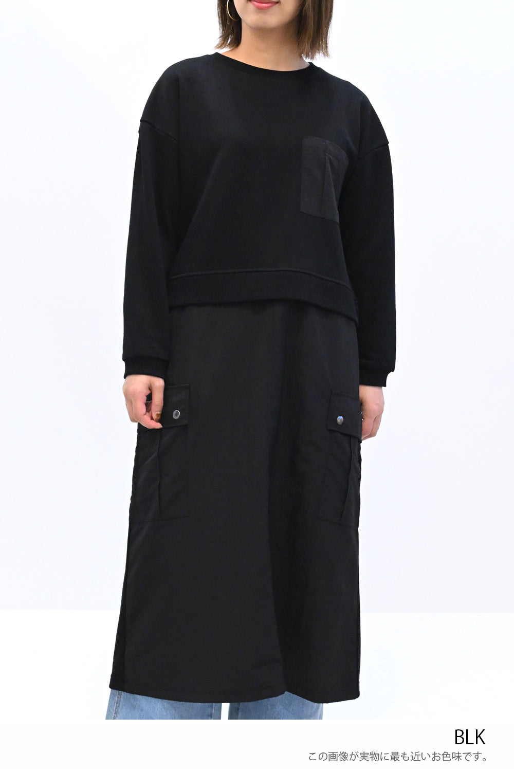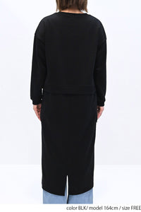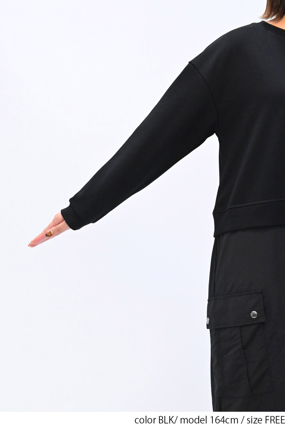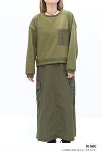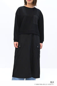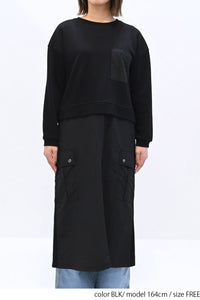 上身頃は柔らかな裏毛素材、スカート部分にはハリのあるナイロン素材を組み合わせ、異素材ならではの立体感と表情を楽しめる一枚です。