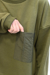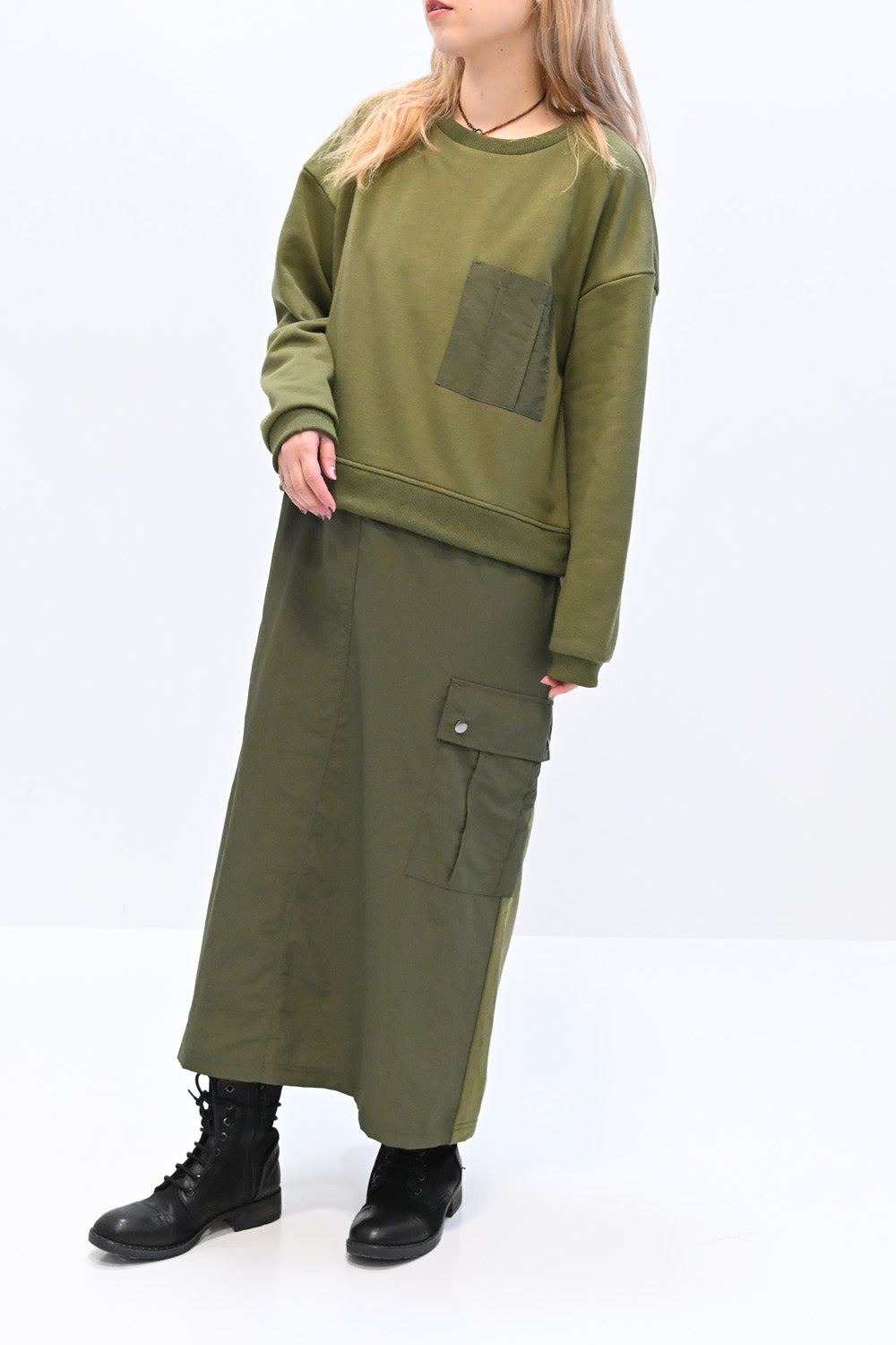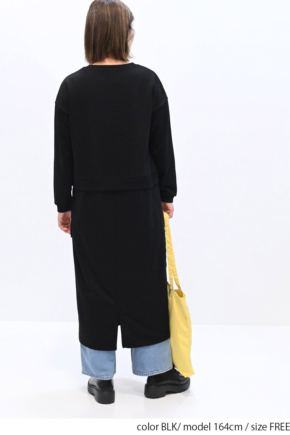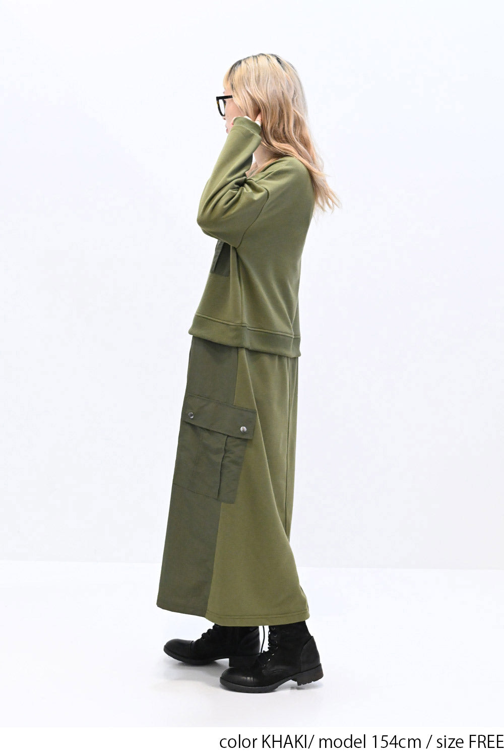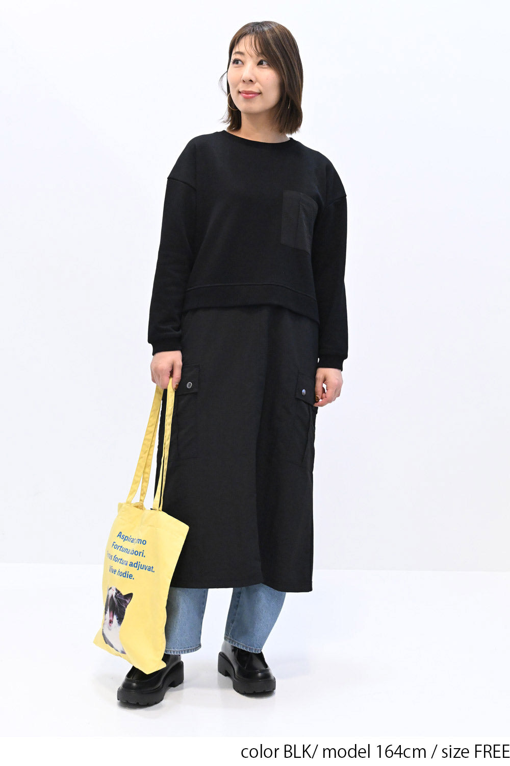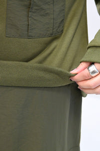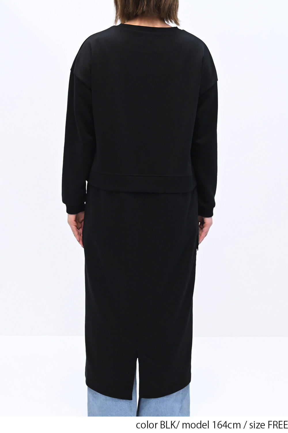 上身頃は柔らかな裏毛素材、スカート部分にはハリのあるナイロン素材を組み合わせ、異素材ならではの立体感と表情を楽しめる一枚です。