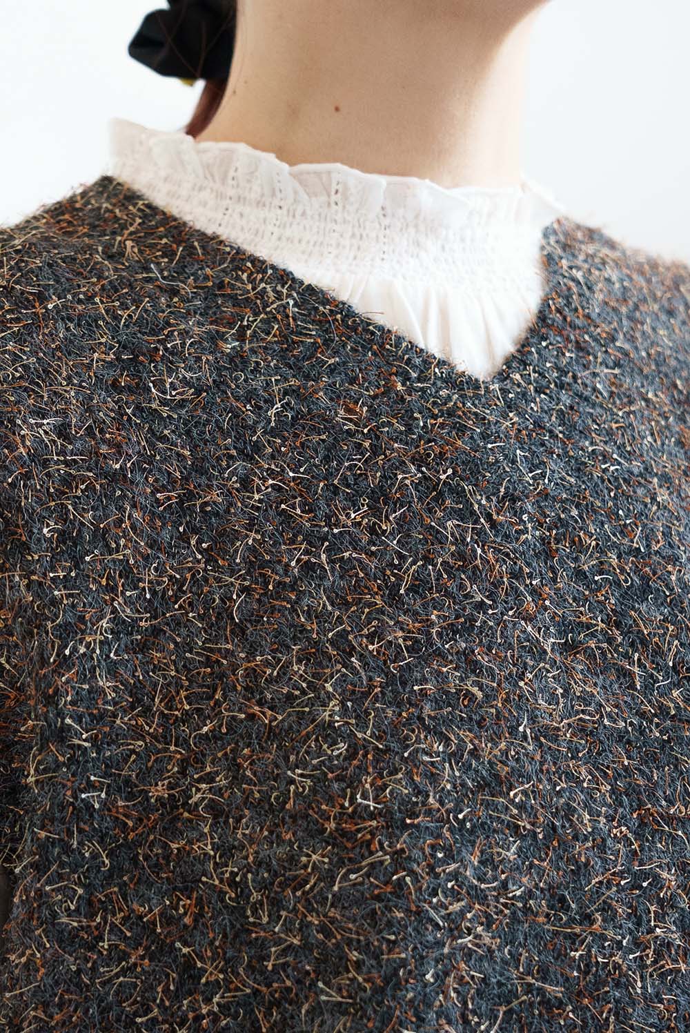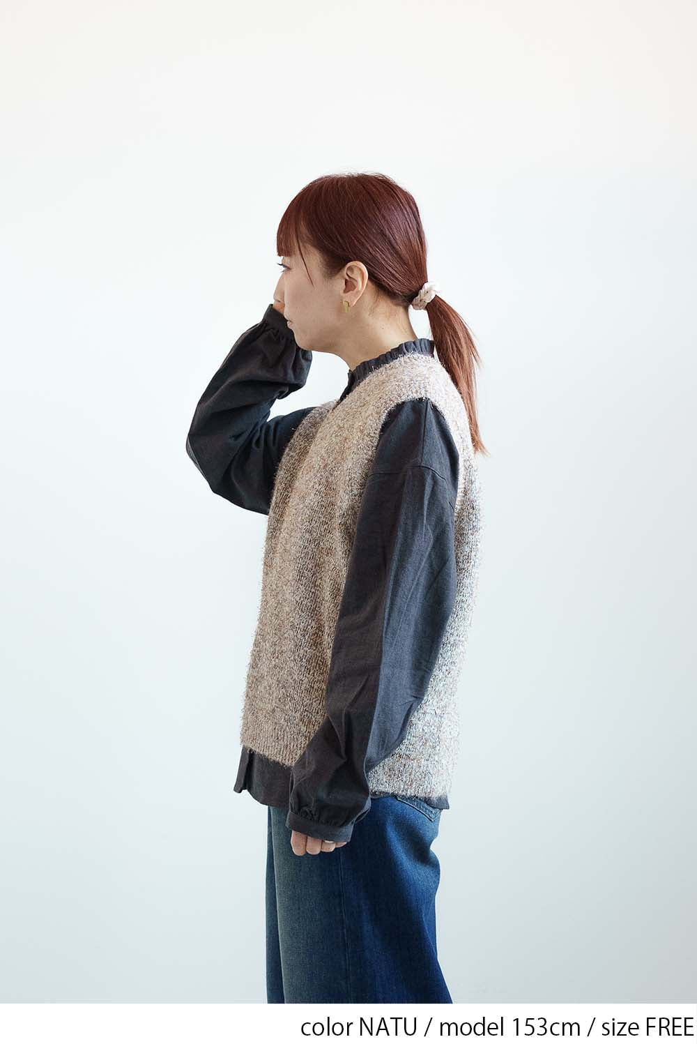 シンプルなインナーを合わせることで、ミックスヤーンの色味がより引き立ちます。