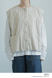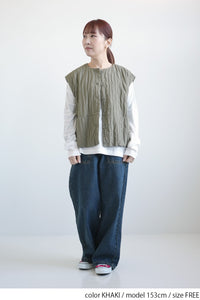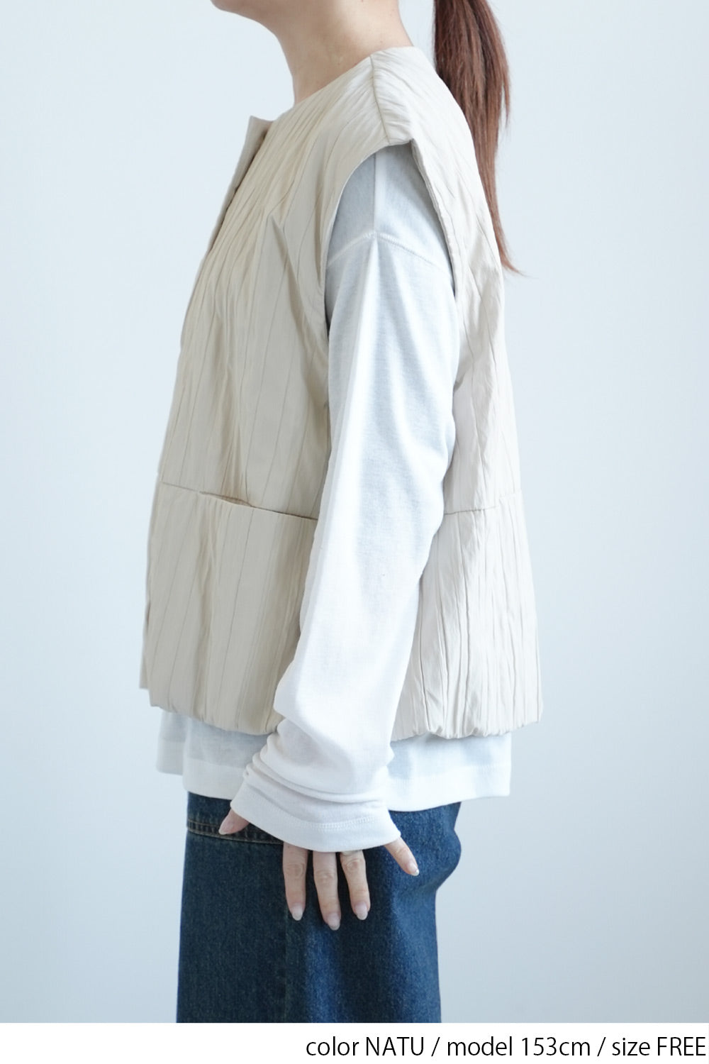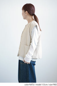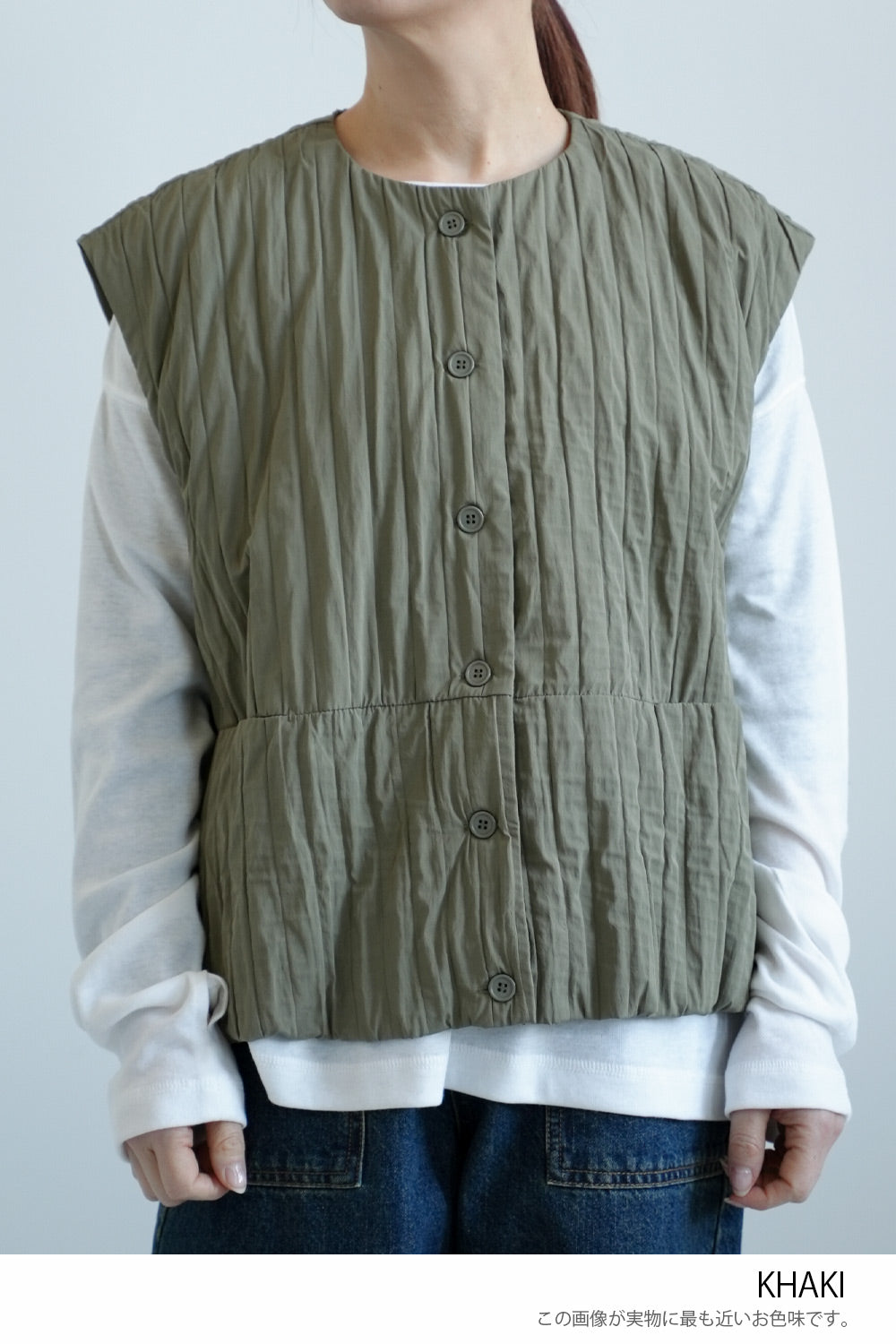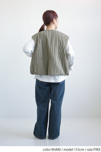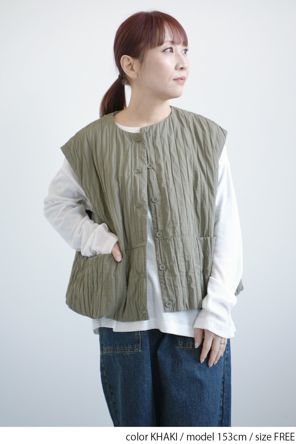 ナチュラルコーデやデイリーコーデにも取り入れやすい万能ベストです。