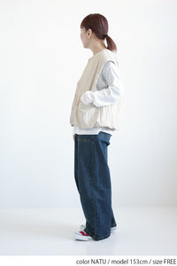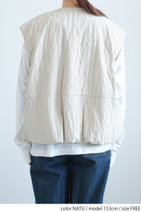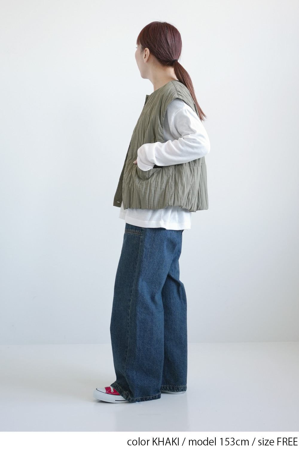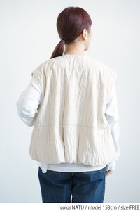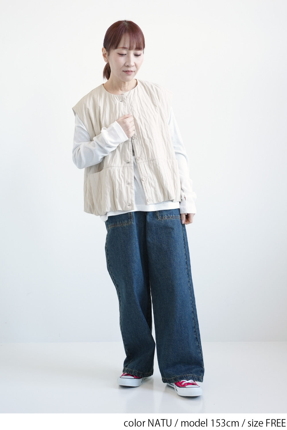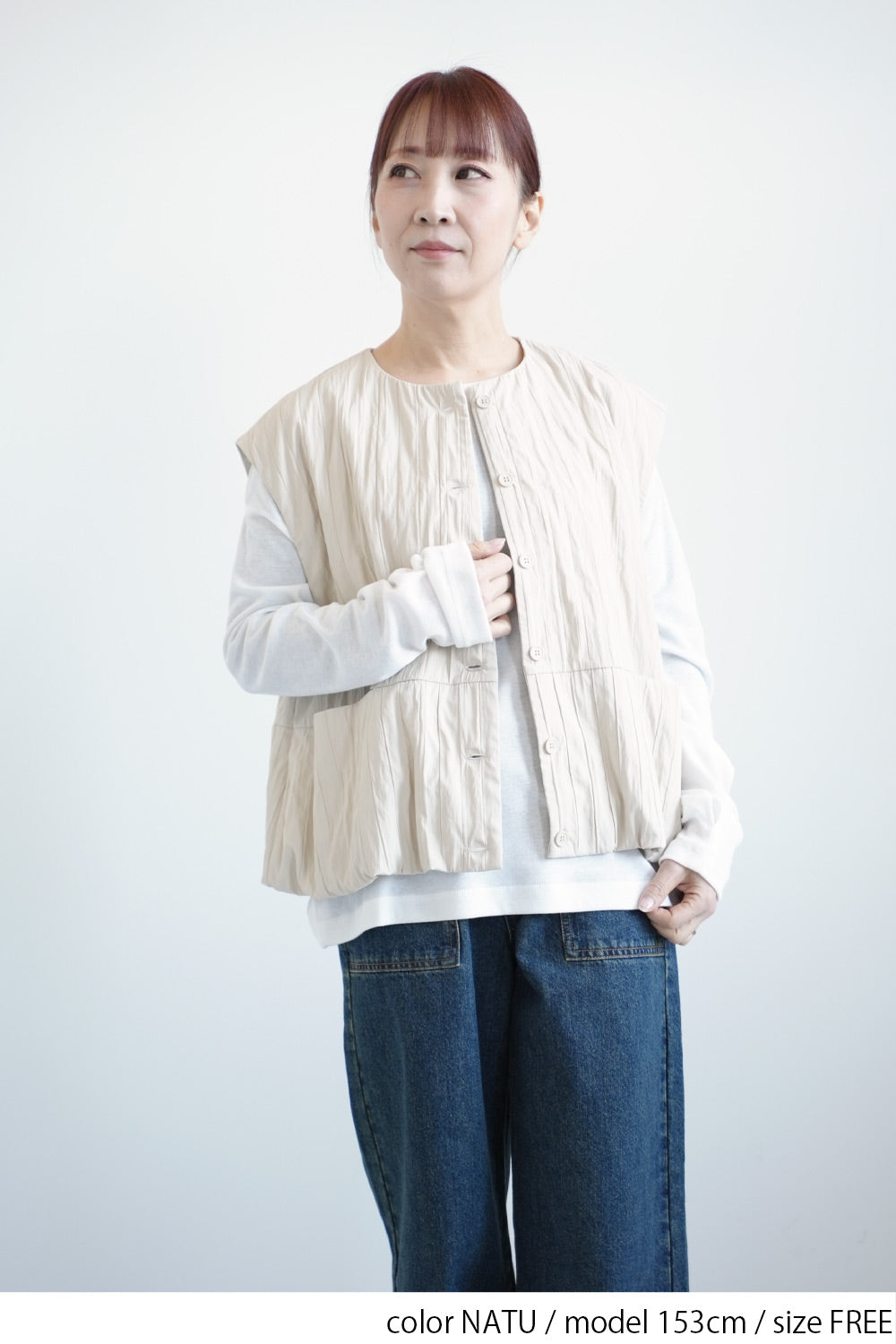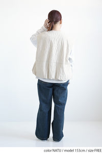 ナチュラルコーデやデイリーコーデにも取り入れやすい万能ベストです。