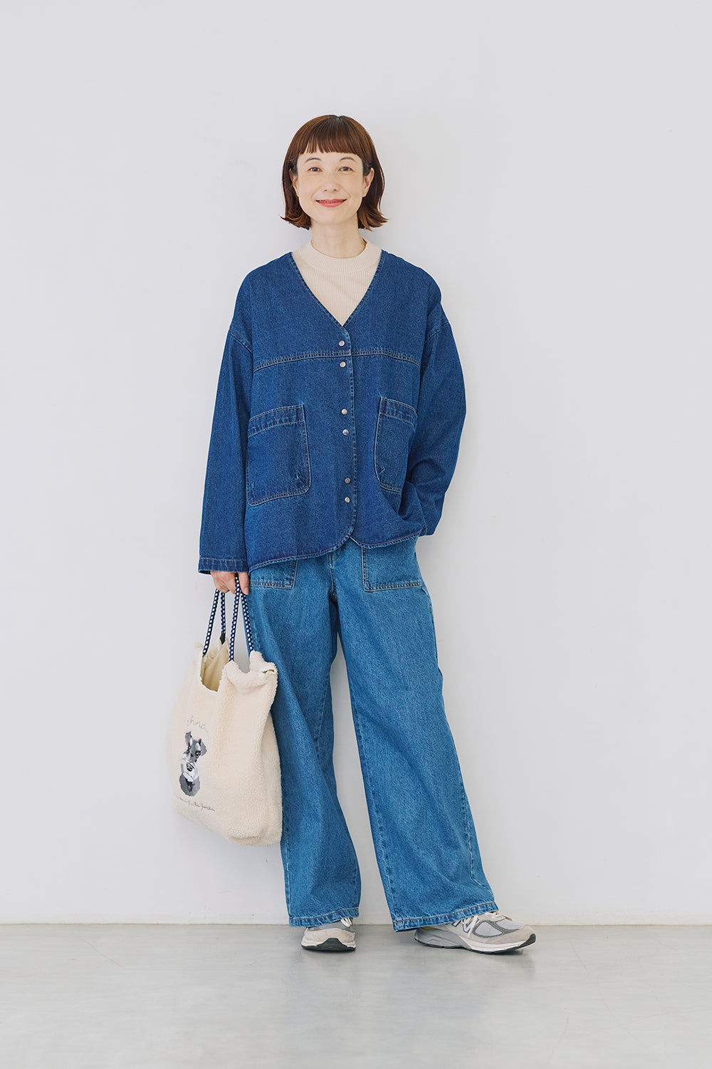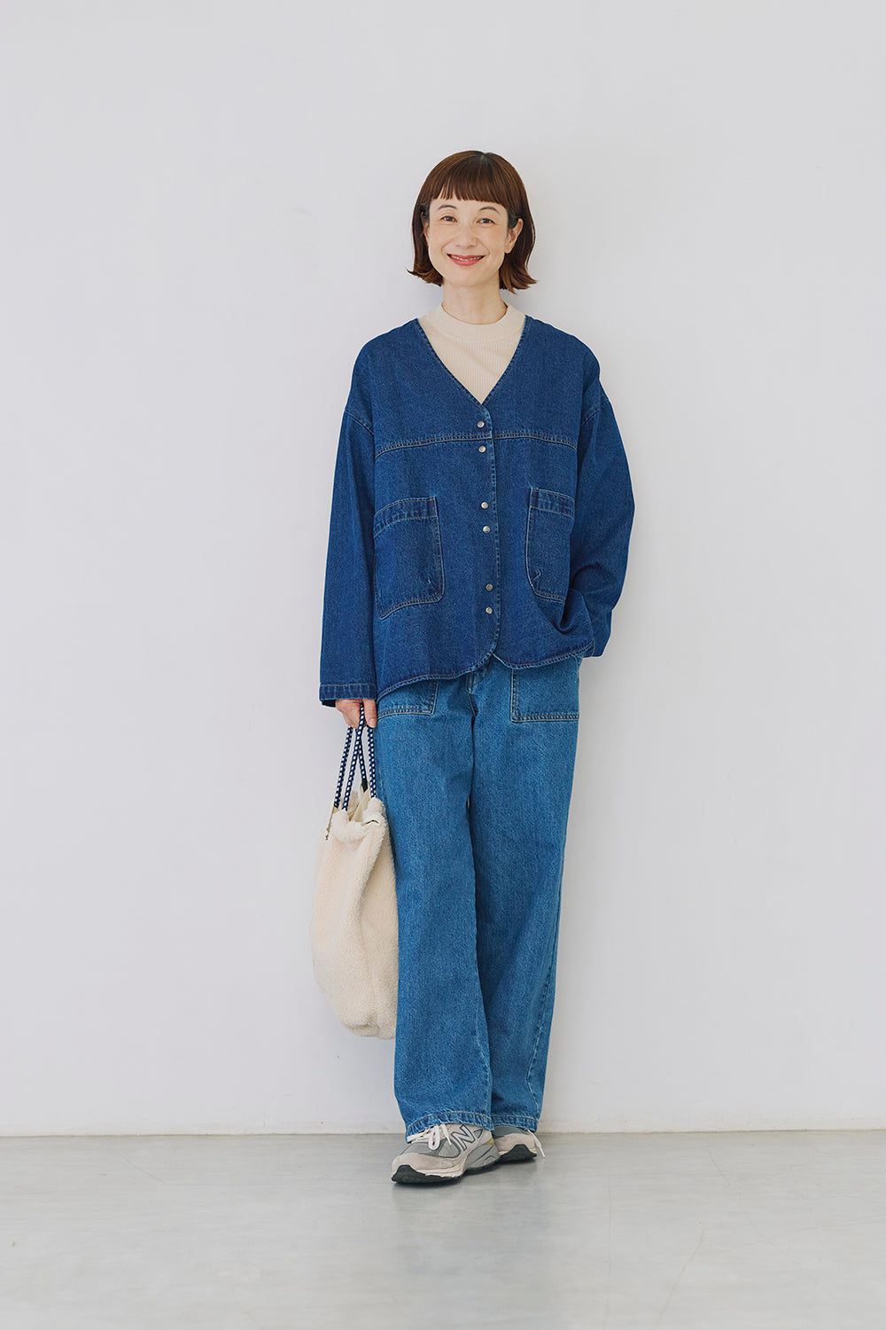 様々なトップスに取り入れやすいデニムは、ビッグシルエットのシャツやフィット感のあるトップスとの着こなしもおすすめ。