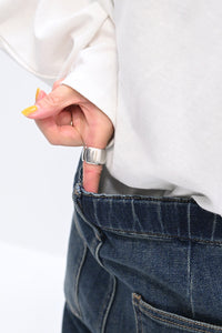 ゆったりとしたワイドシルエットが脚のラインを拾わず、体型をさりげなくカバーしてくれます。