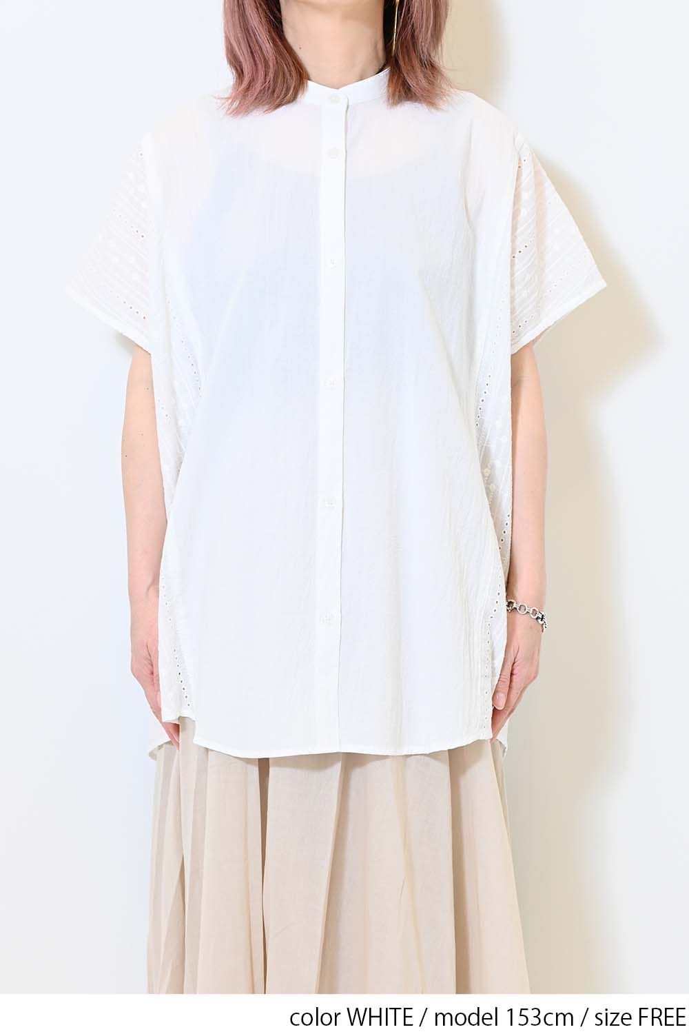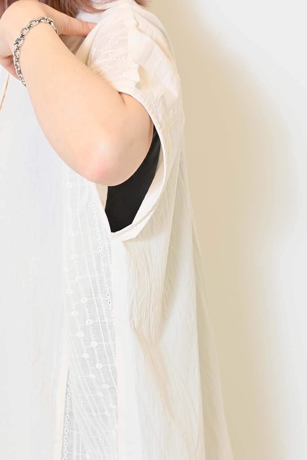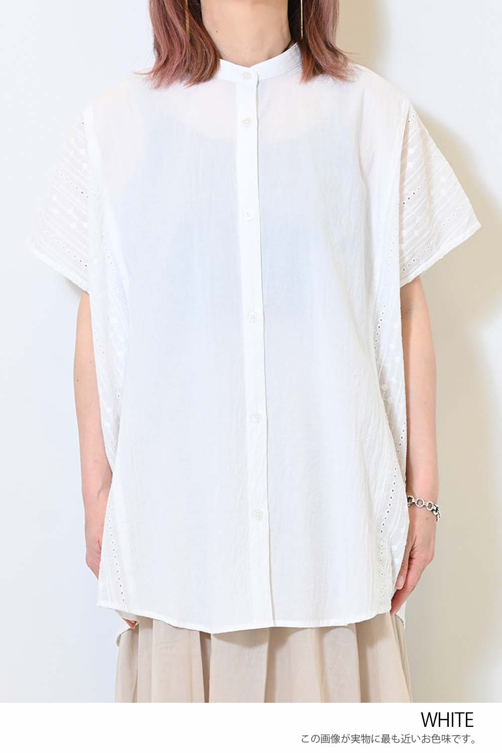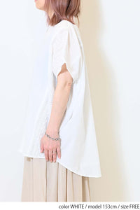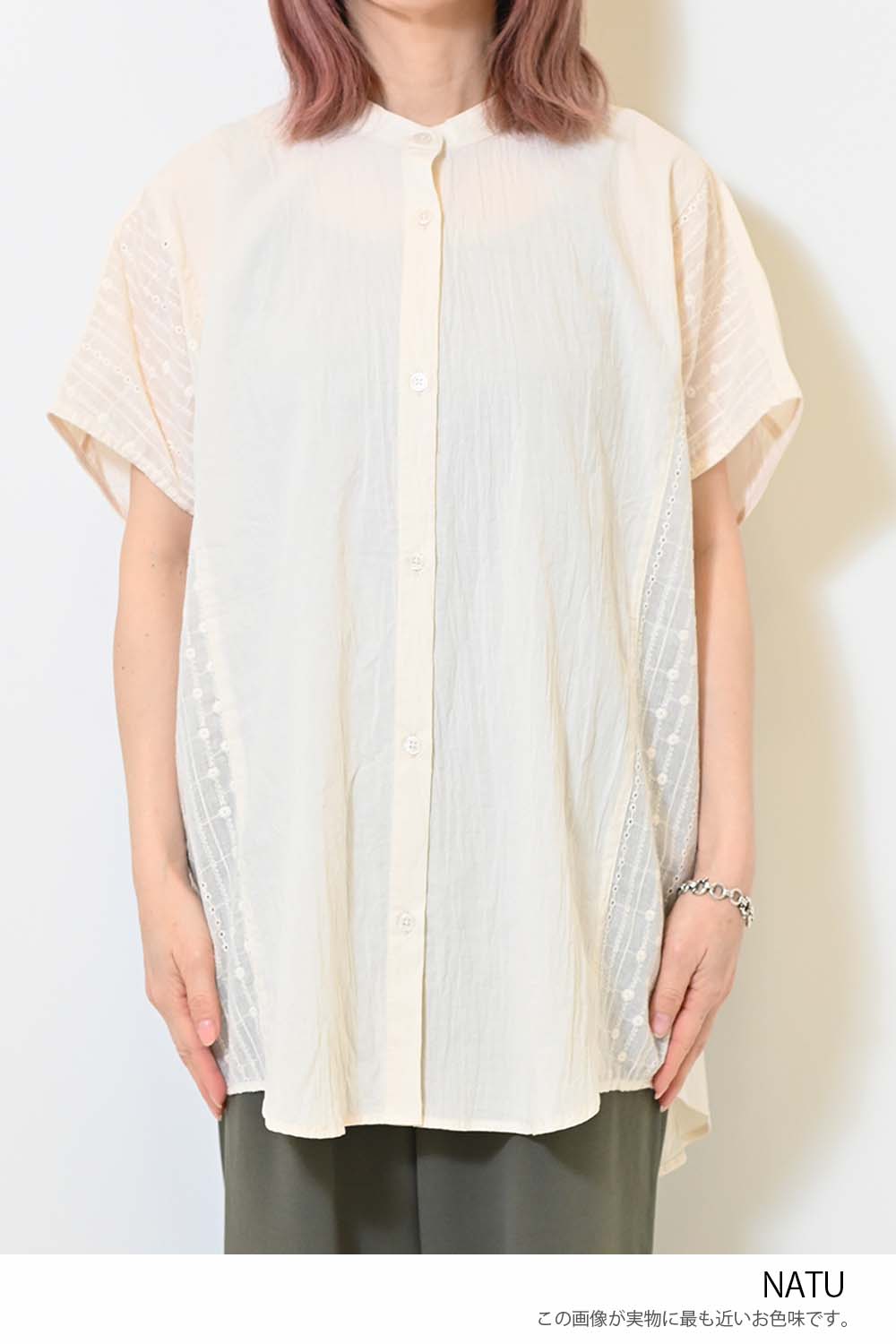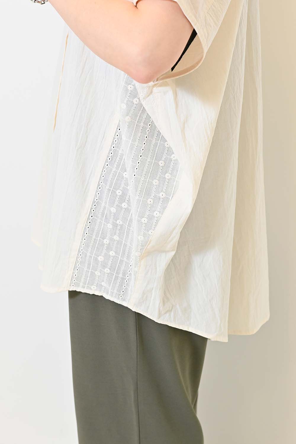 洗いざらしのような風合いが魅力のウォッシャブルコットンに、繊細な綿レースをサイドに切り替えた、涼しげな印象のドルマンワイドシャツチュニックです。