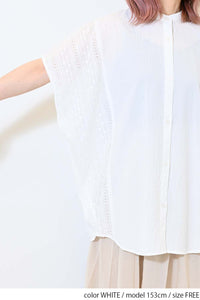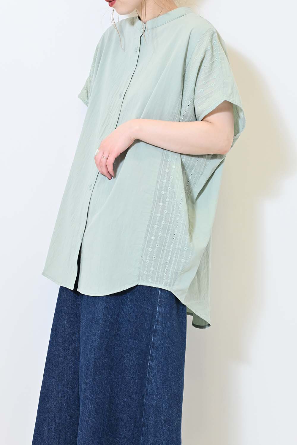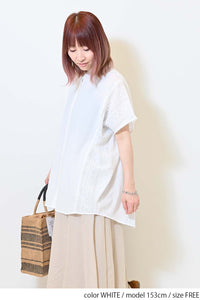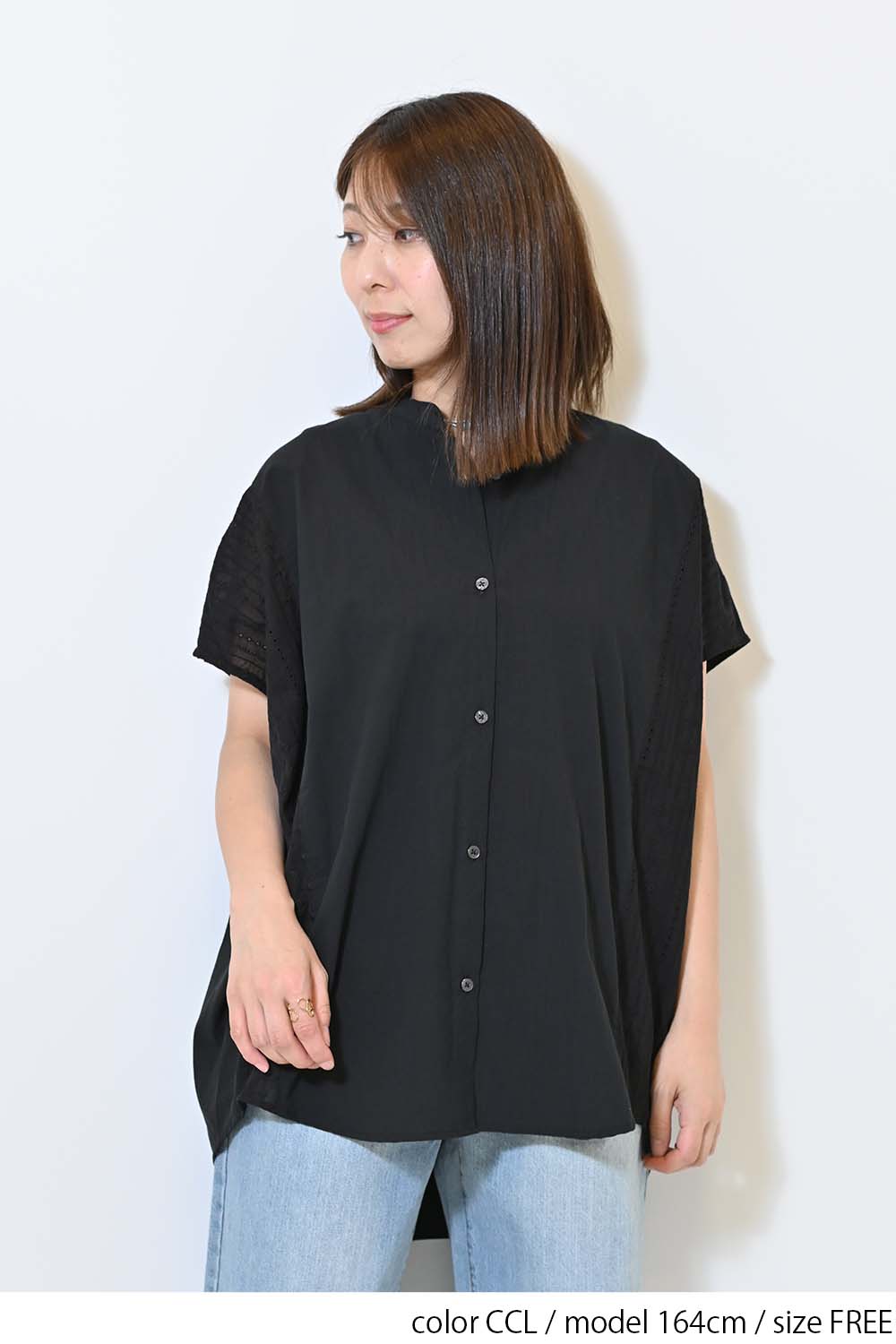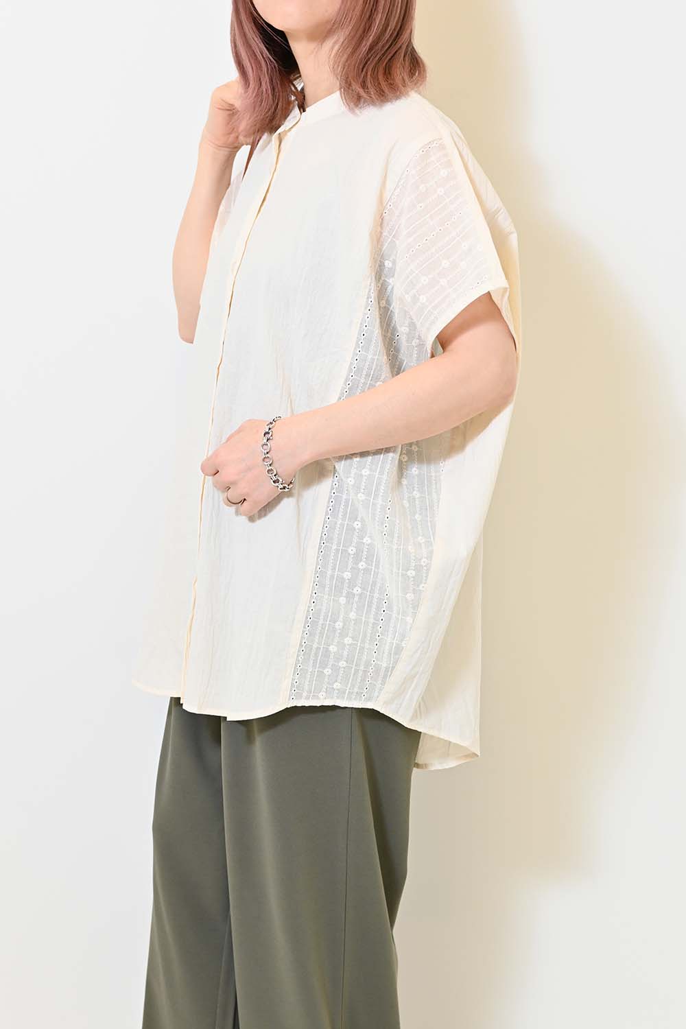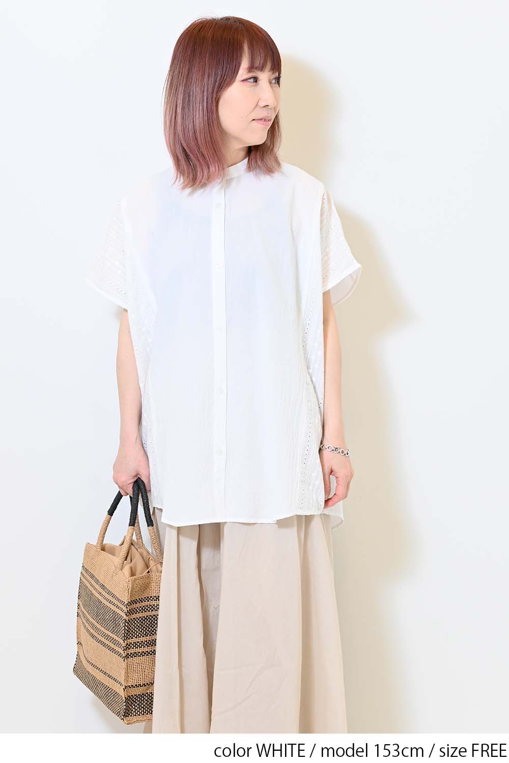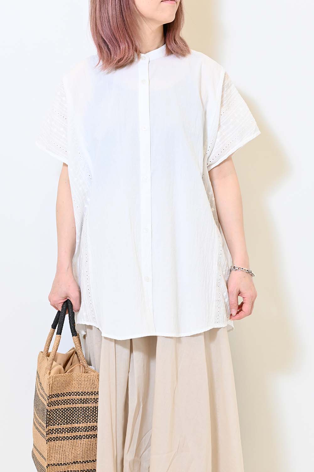 洗いざらしのような風合いが魅力のウォッシャブルコットンに、繊細な綿レースをサイドに切り替えた、涼しげな印象のドルマンワイドシャツチュニックです。
