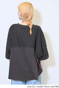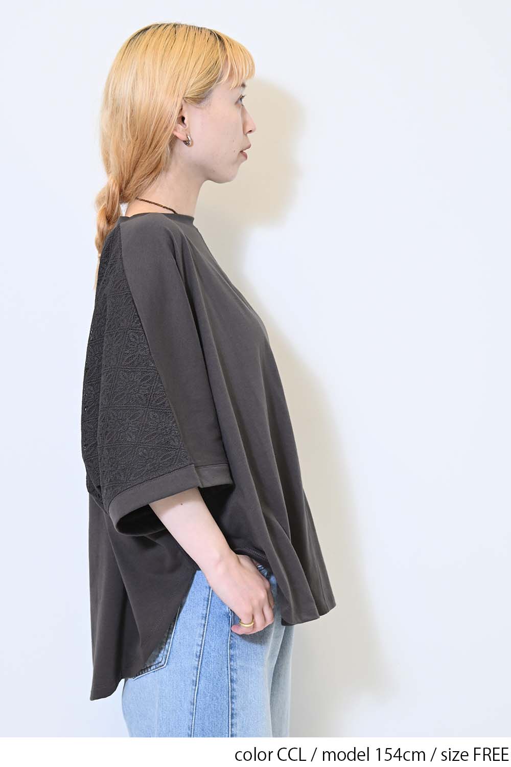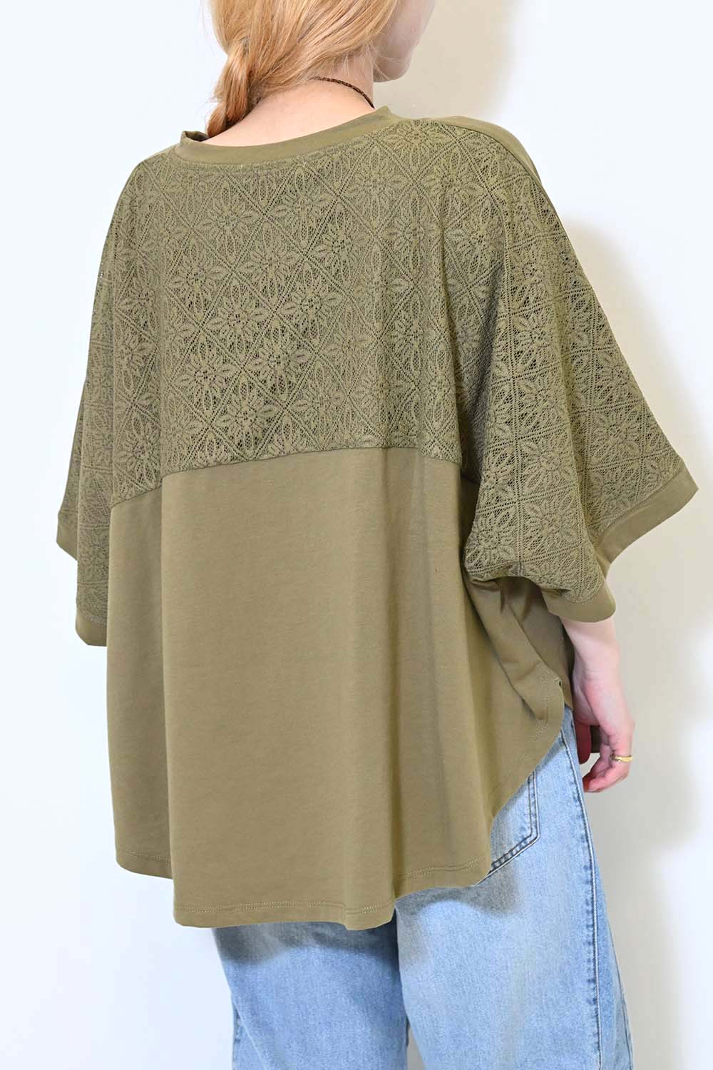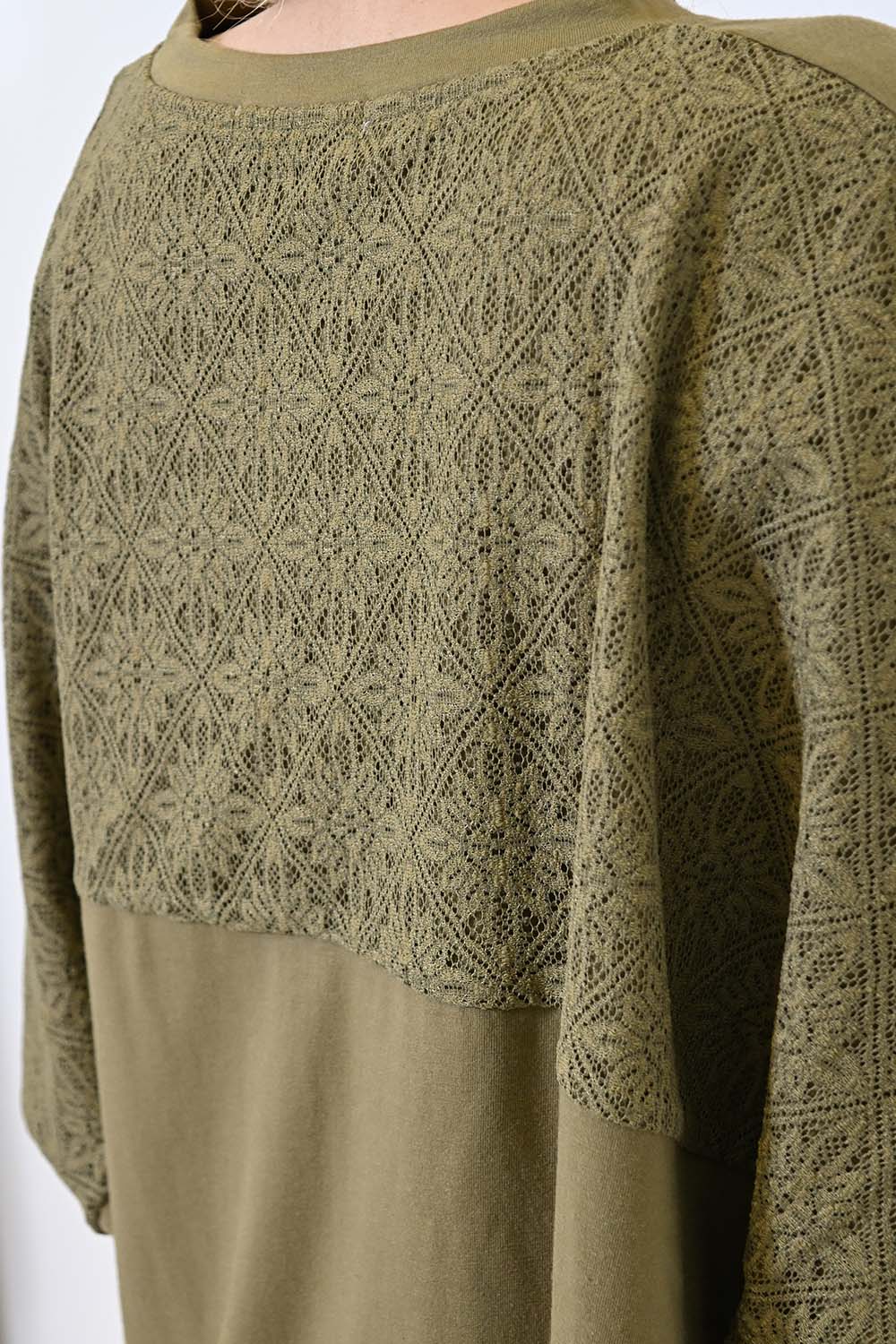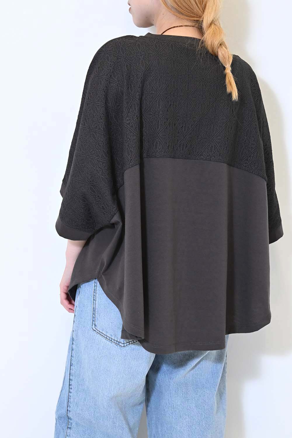 バックスタイルに施されたレースの切り替えが印象的な裾ラウンドプルオーバー。