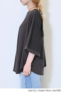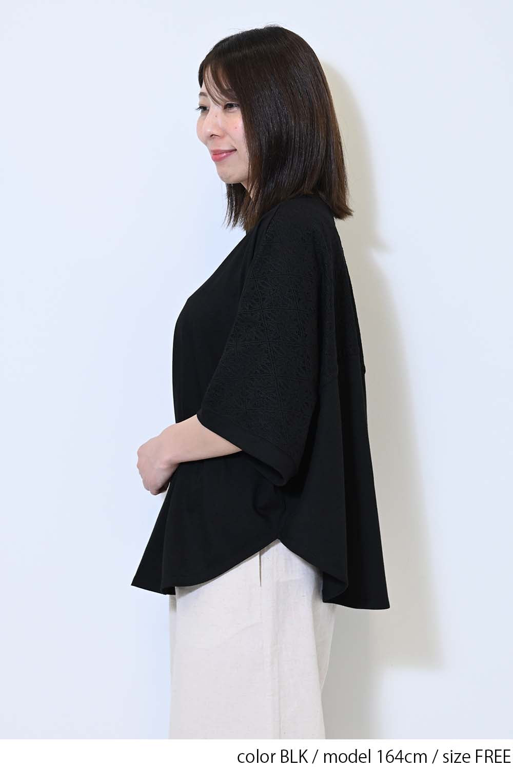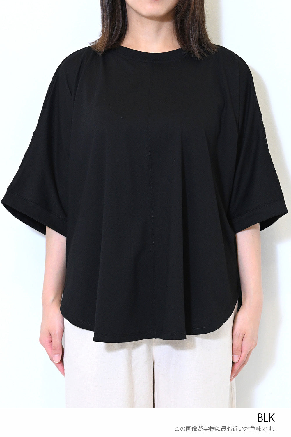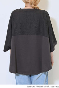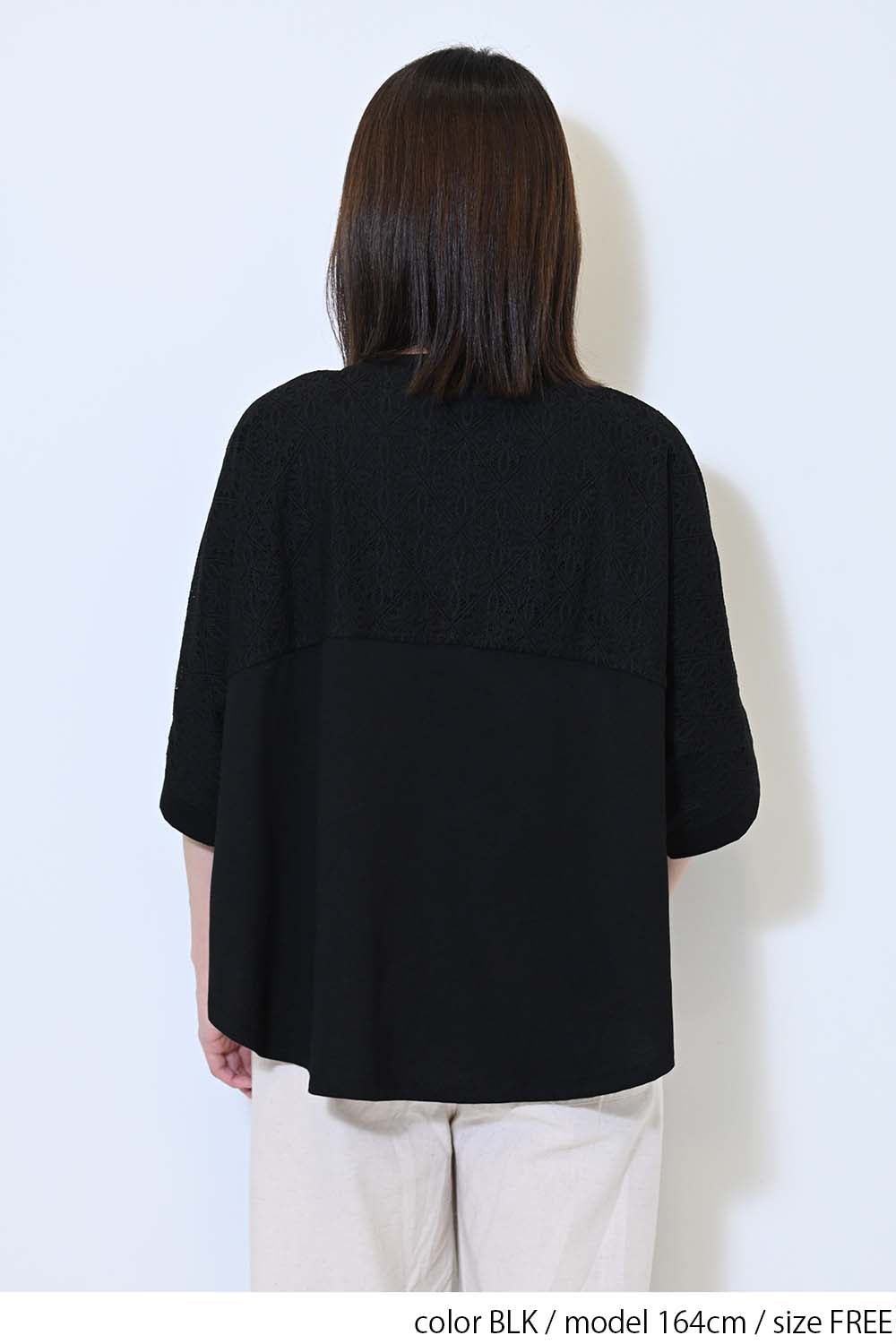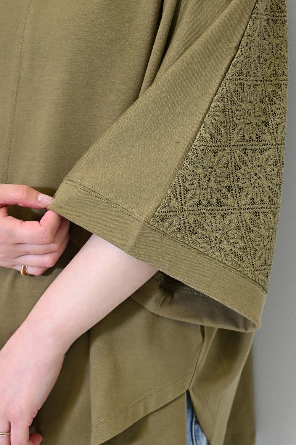 バックスタイルに施されたレースの切り替えが印象的な裾ラウンドプルオーバー。
