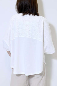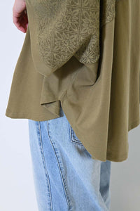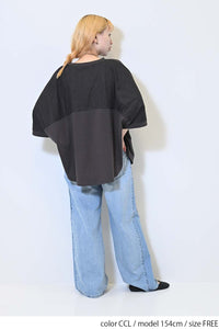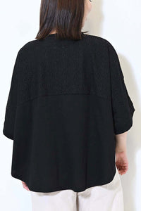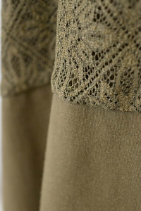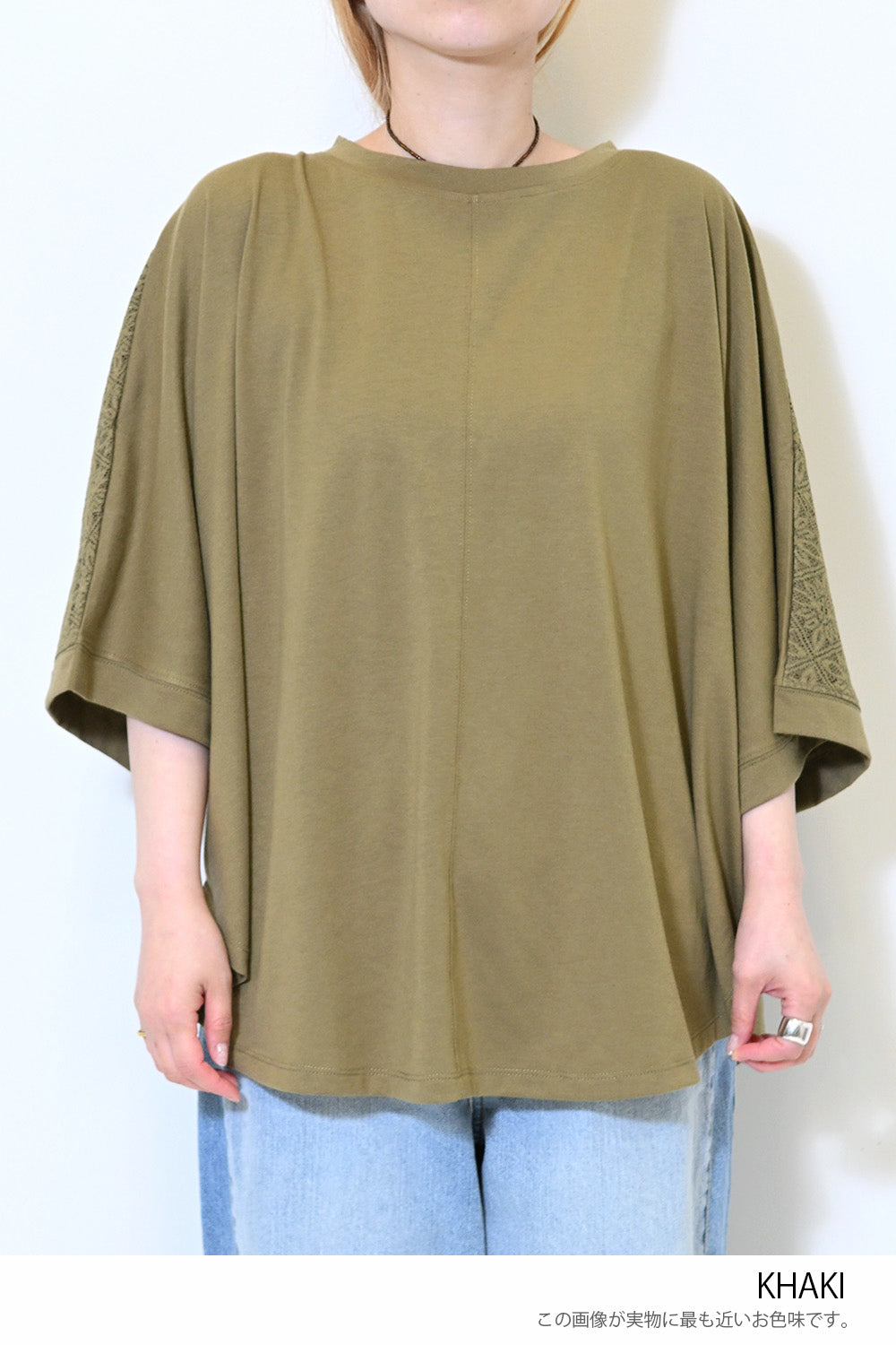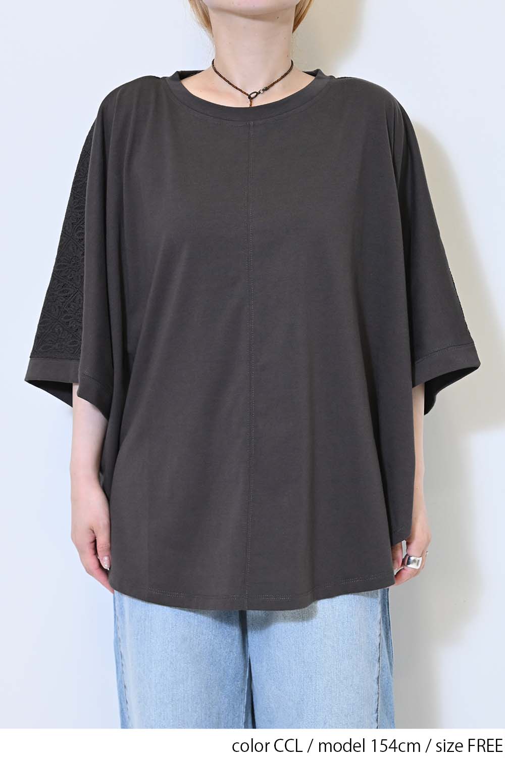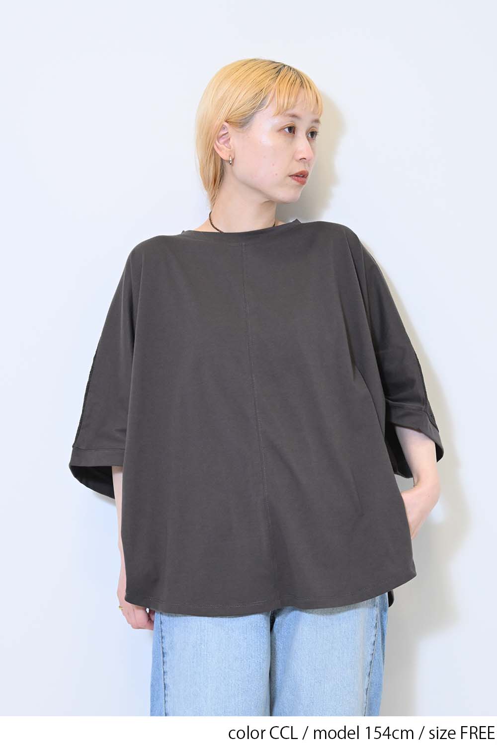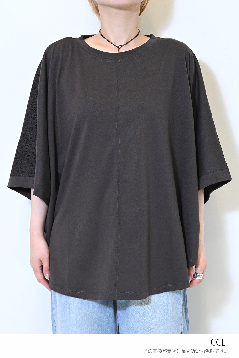 バックスタイルに施されたレースの切り替えが印象的な裾ラウンドプルオーバー。