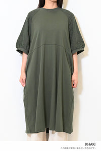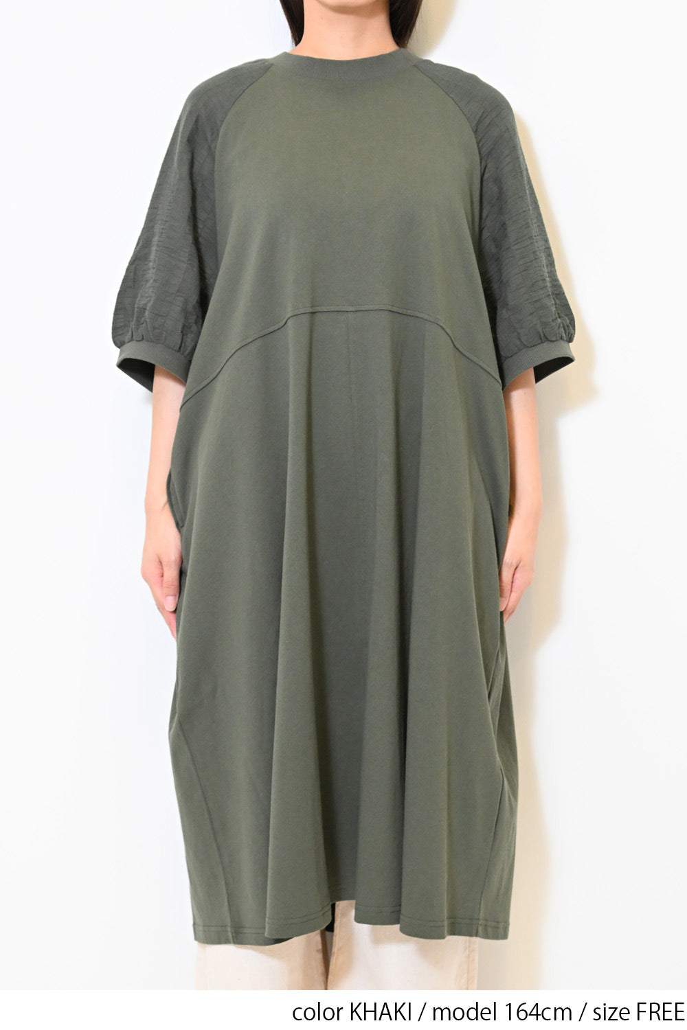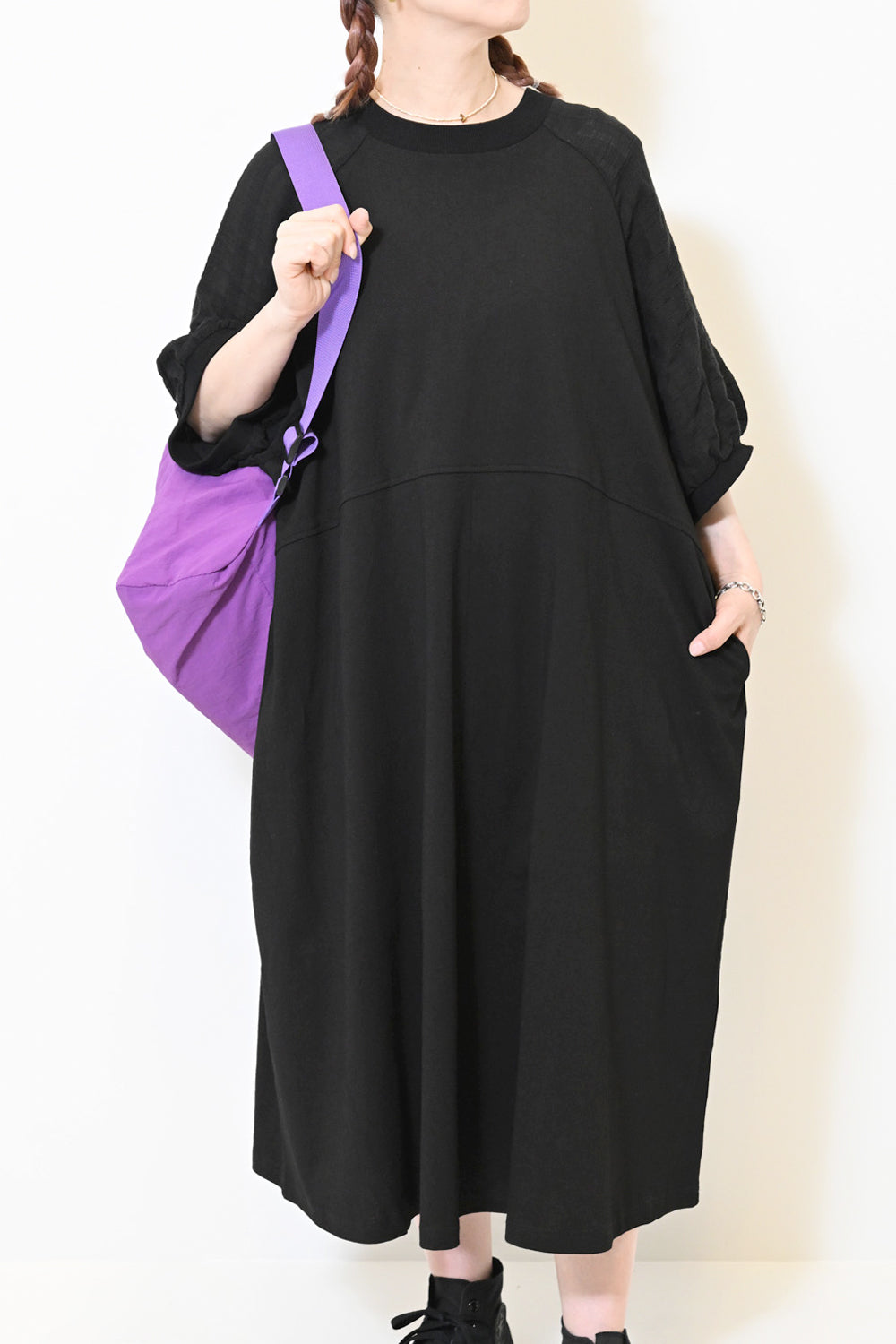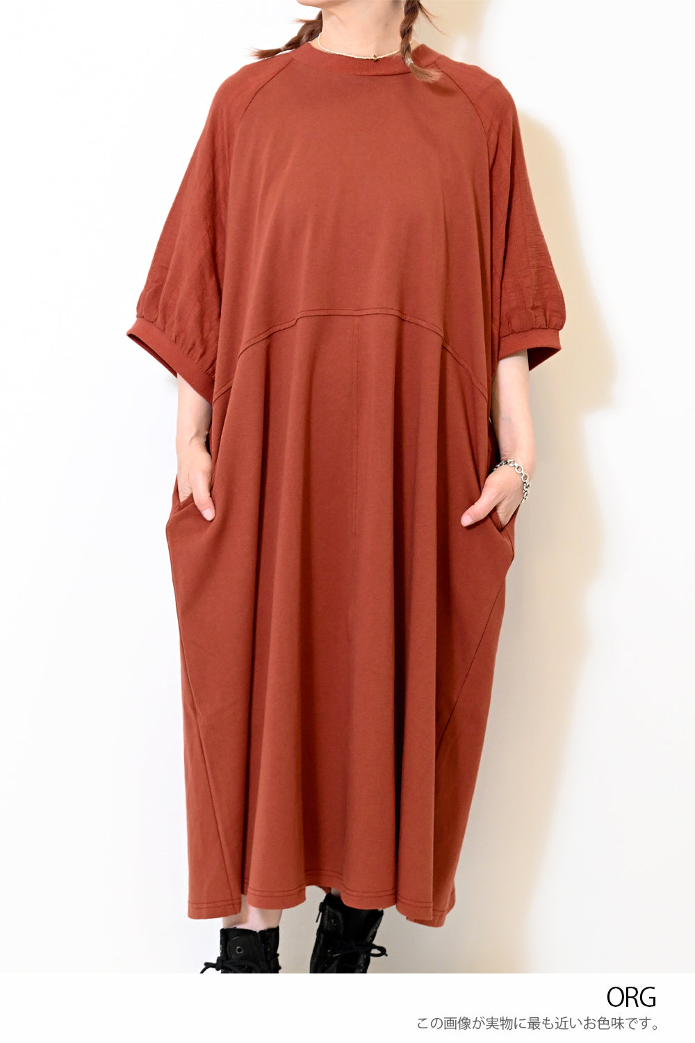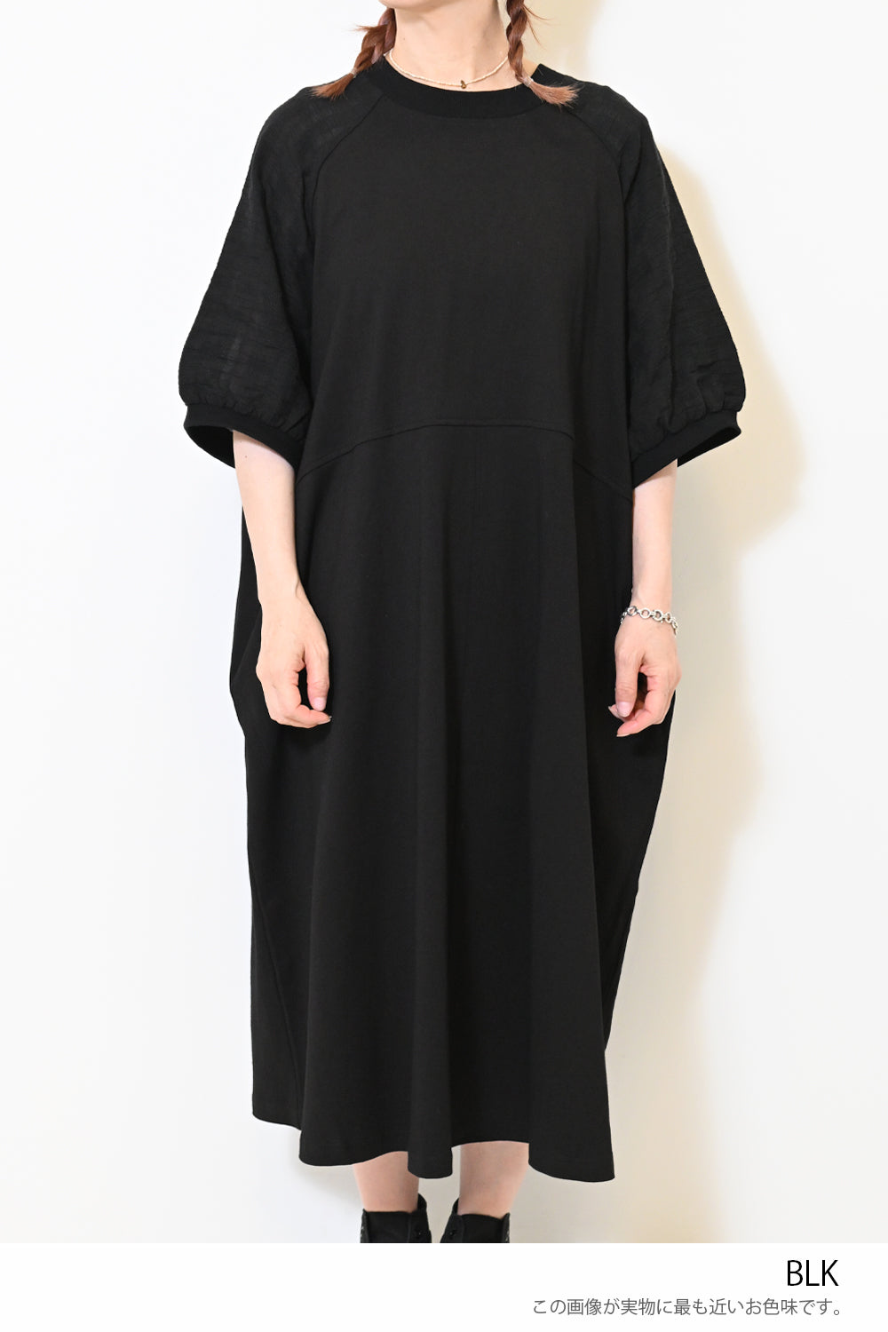 異素材の袖切替が目を惹く、ラグランデザインのワンピース。