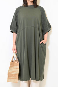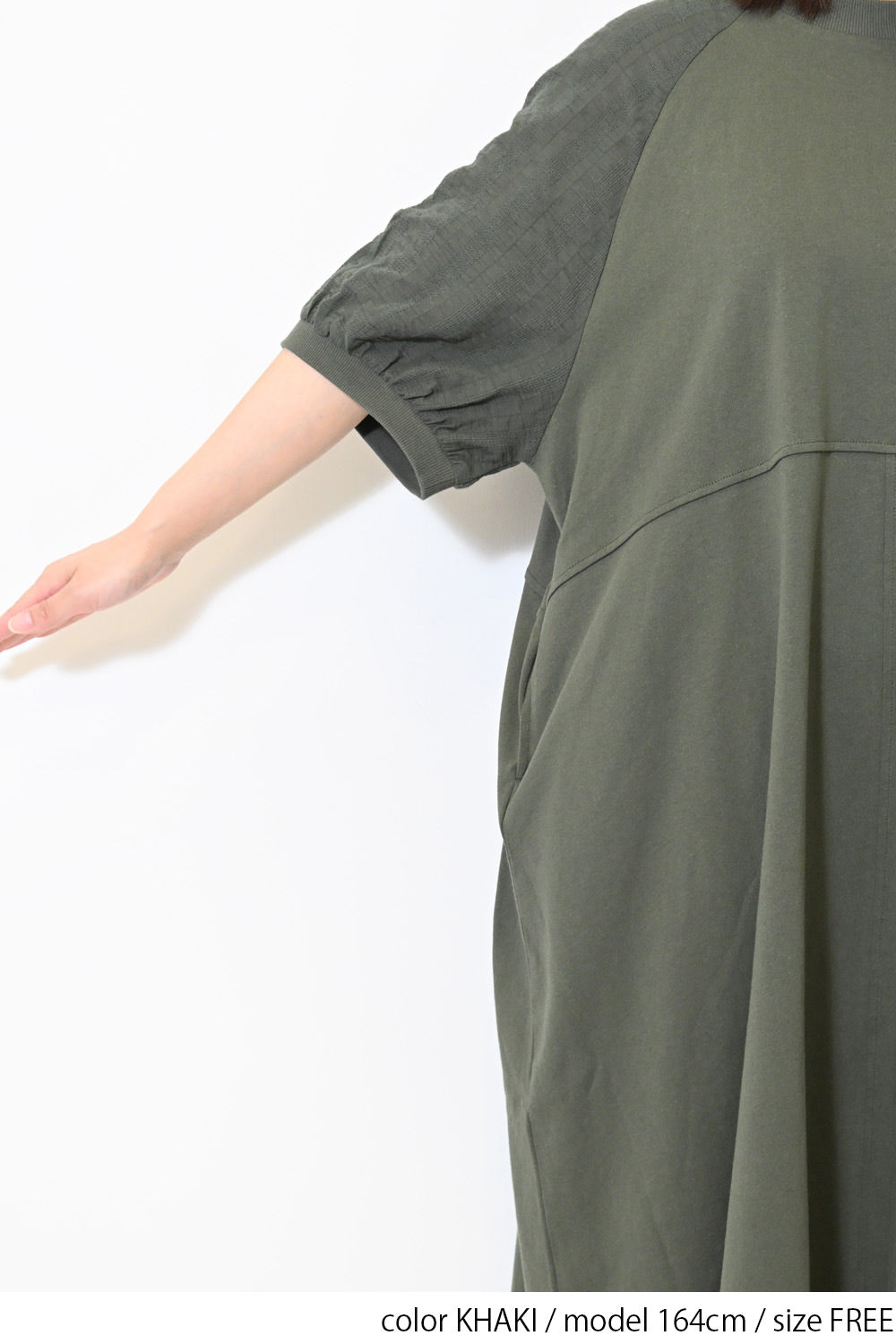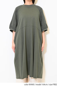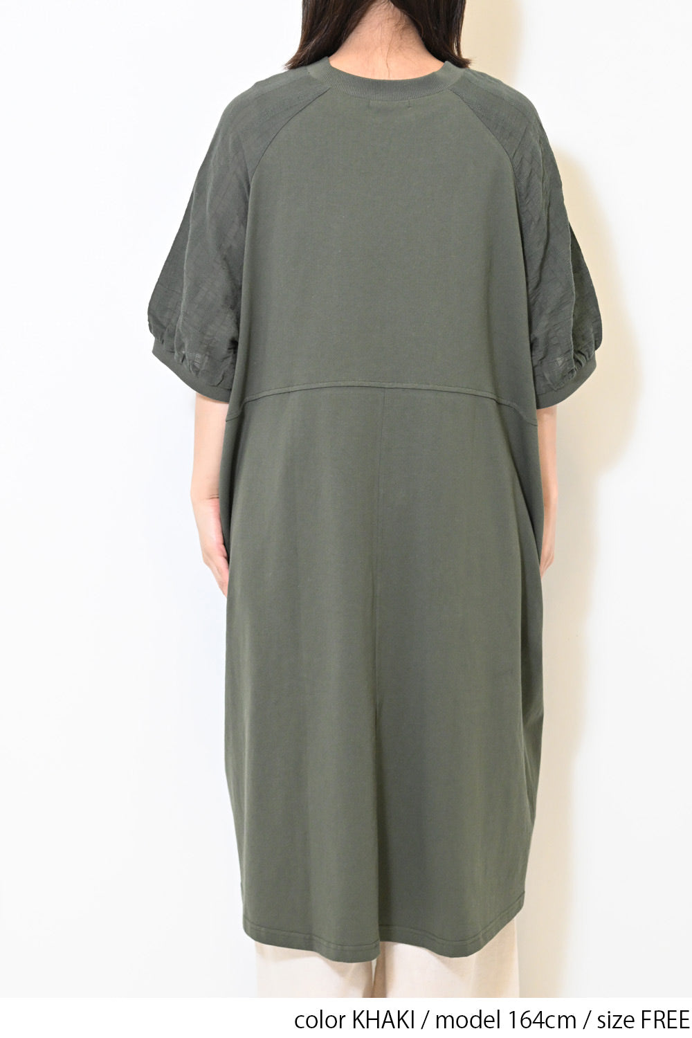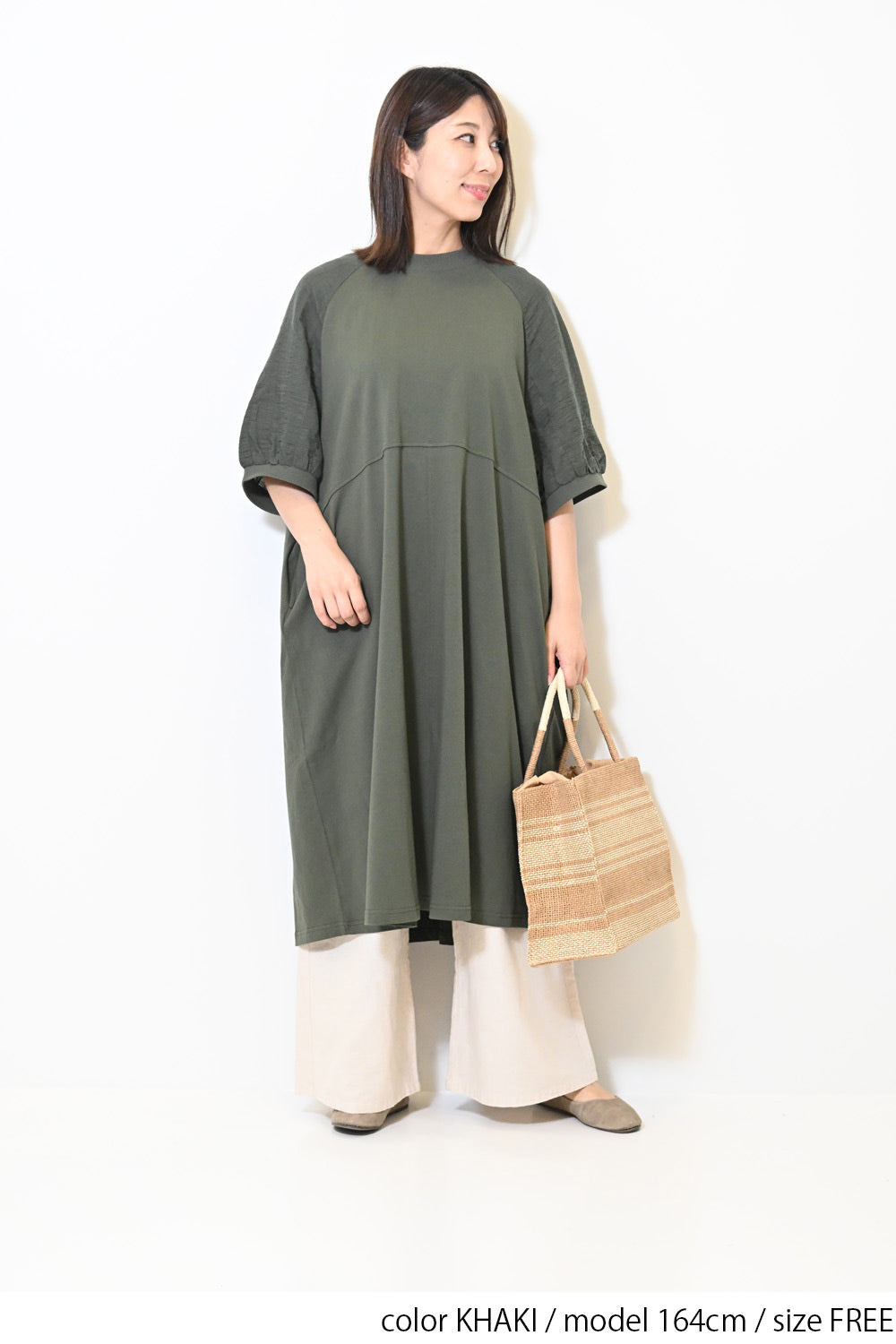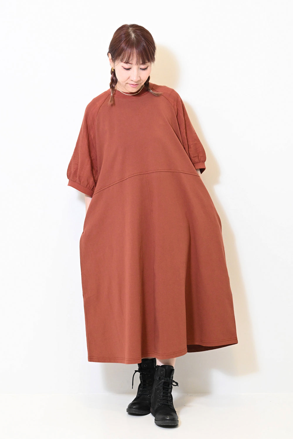 異素材の袖切替が目を惹く、ラグランデザインのワンピース。