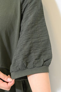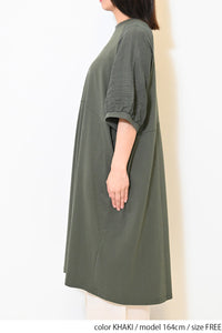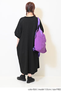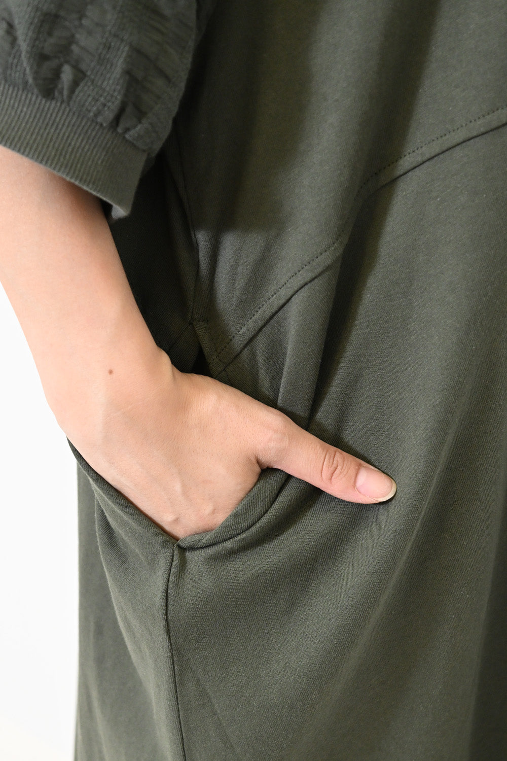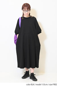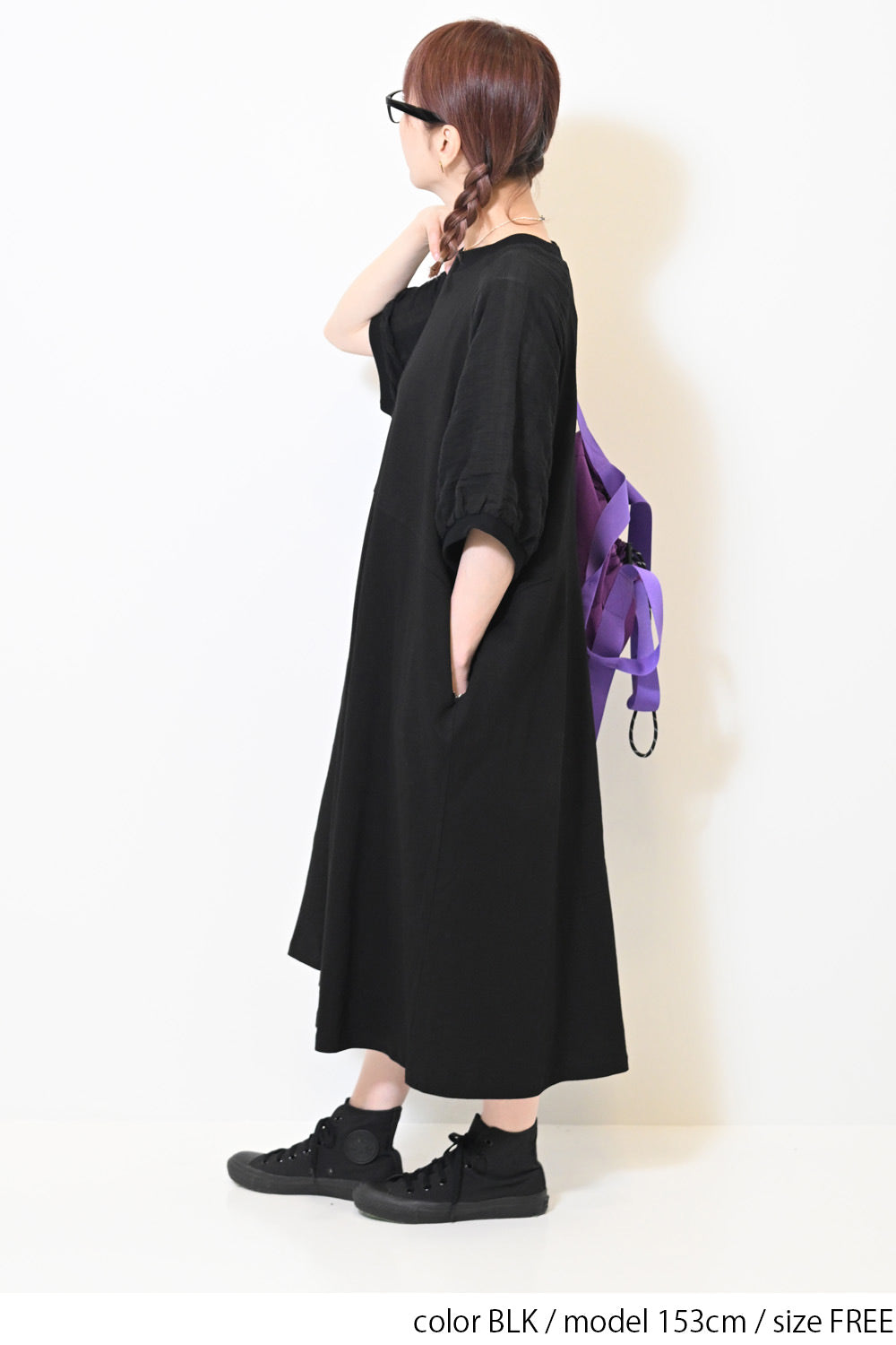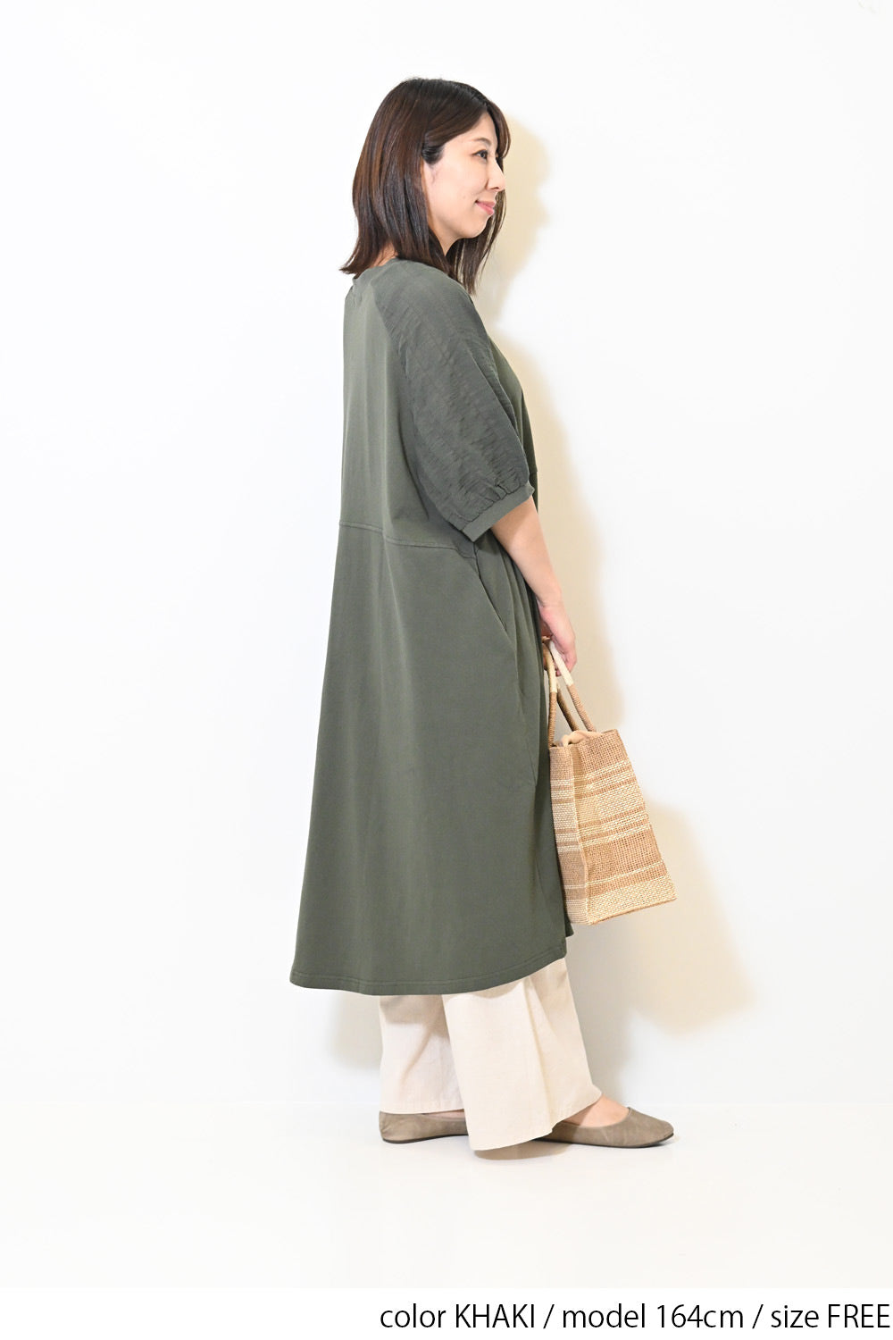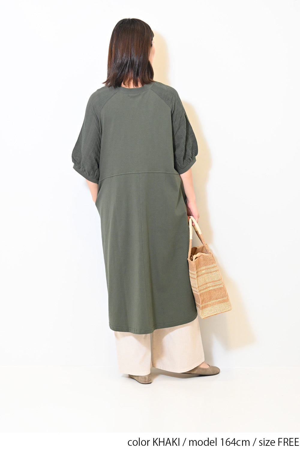 異素材の袖切替が目を惹く、ラグランデザインのワンピース。