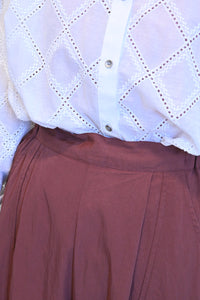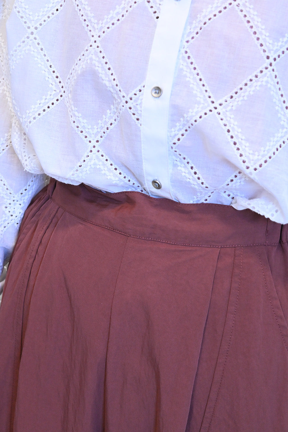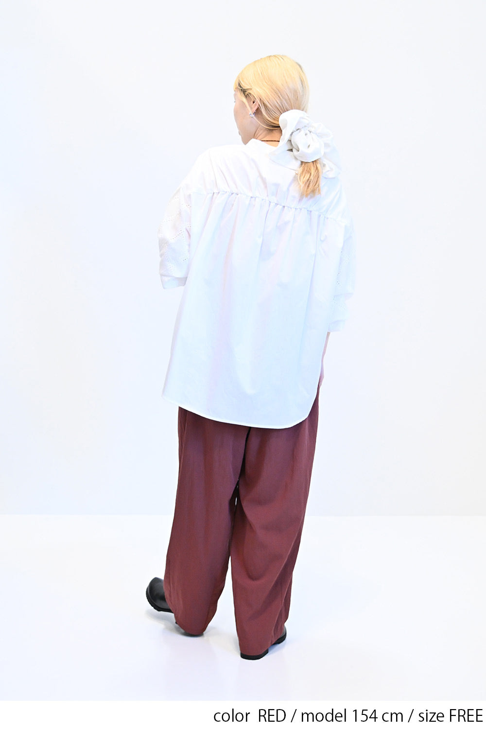 トップスをインすればタックとドレープが際立ち、すっきりとしたスタイルに。