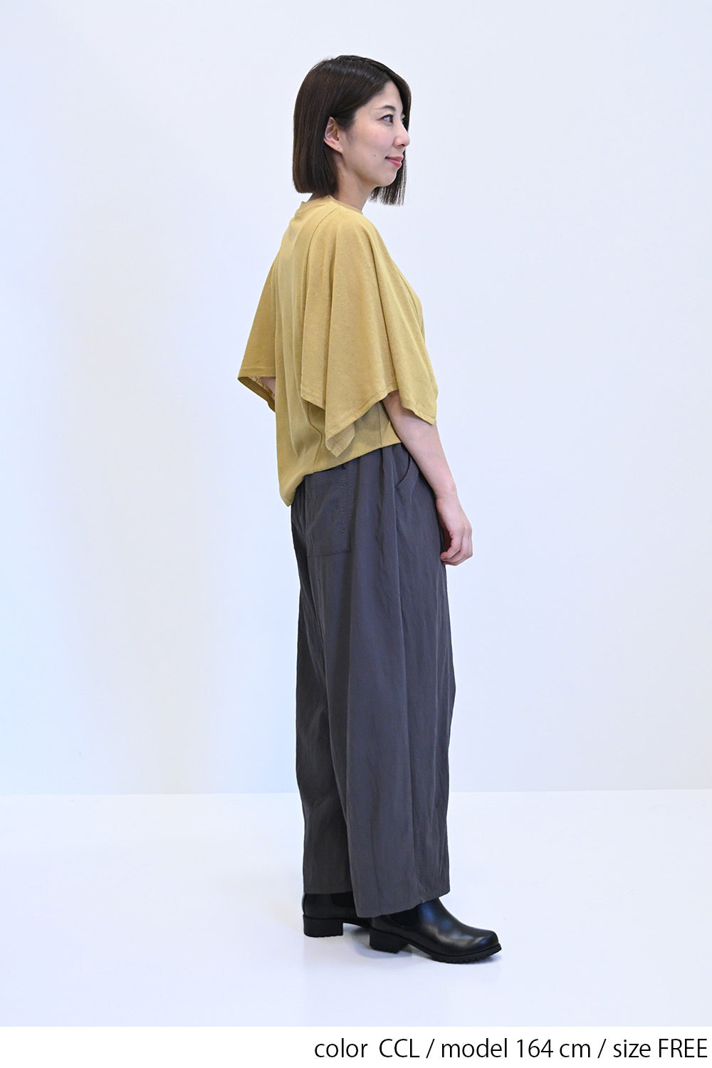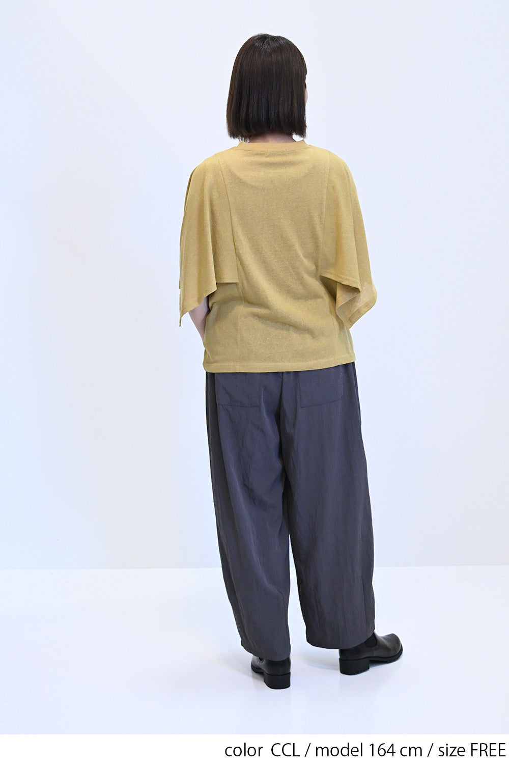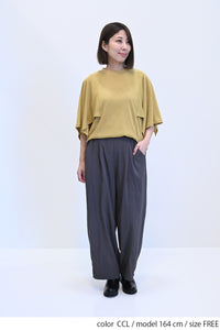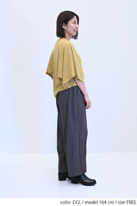 ウエスト周りに施されたタックが、気になる腰回りを自然にカバーしながら、美しいドレープを作り出します。