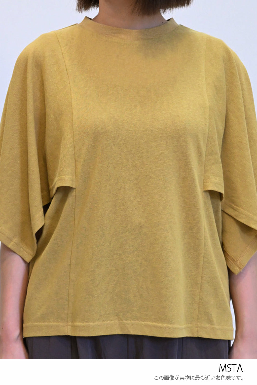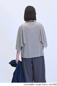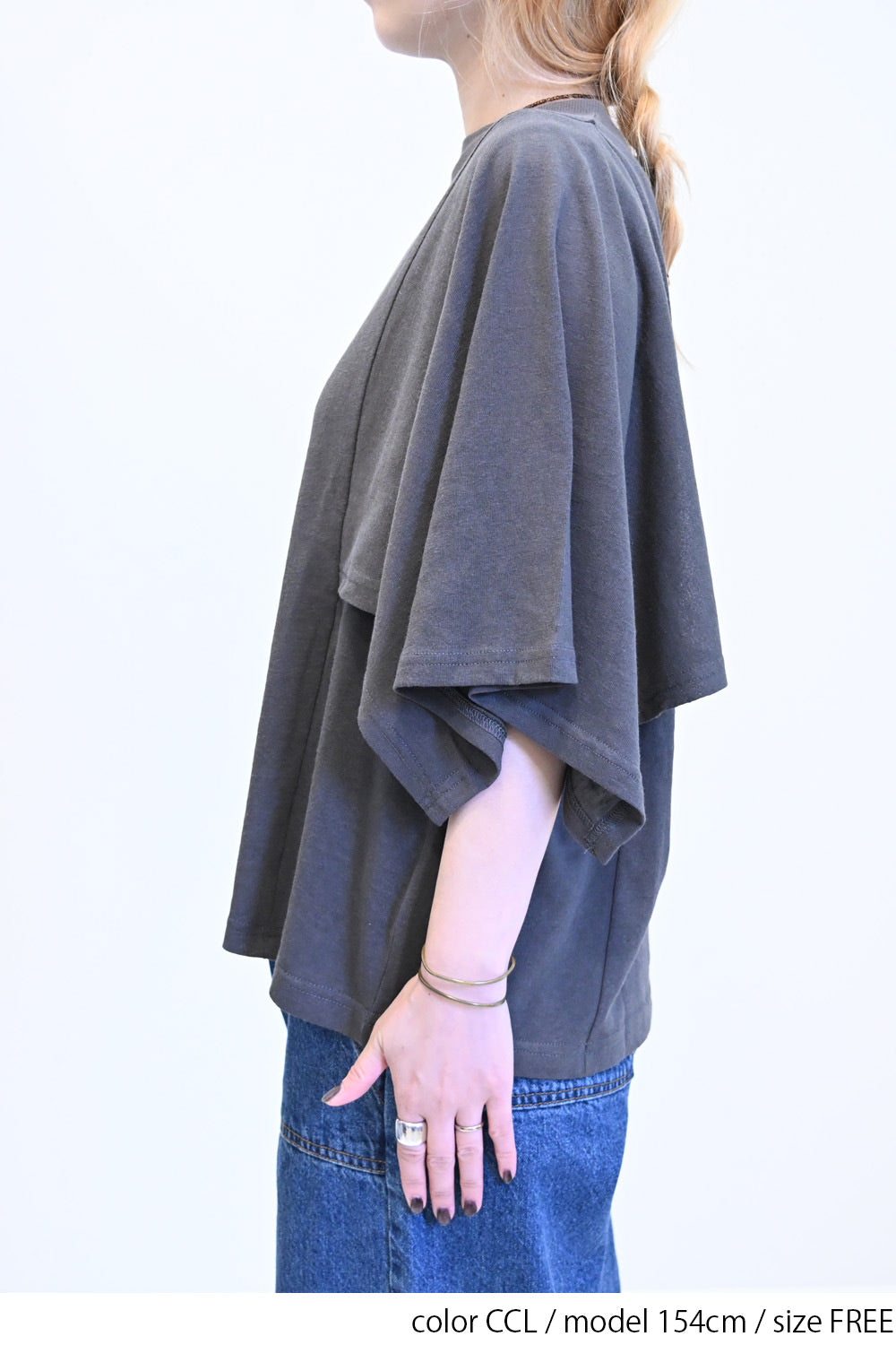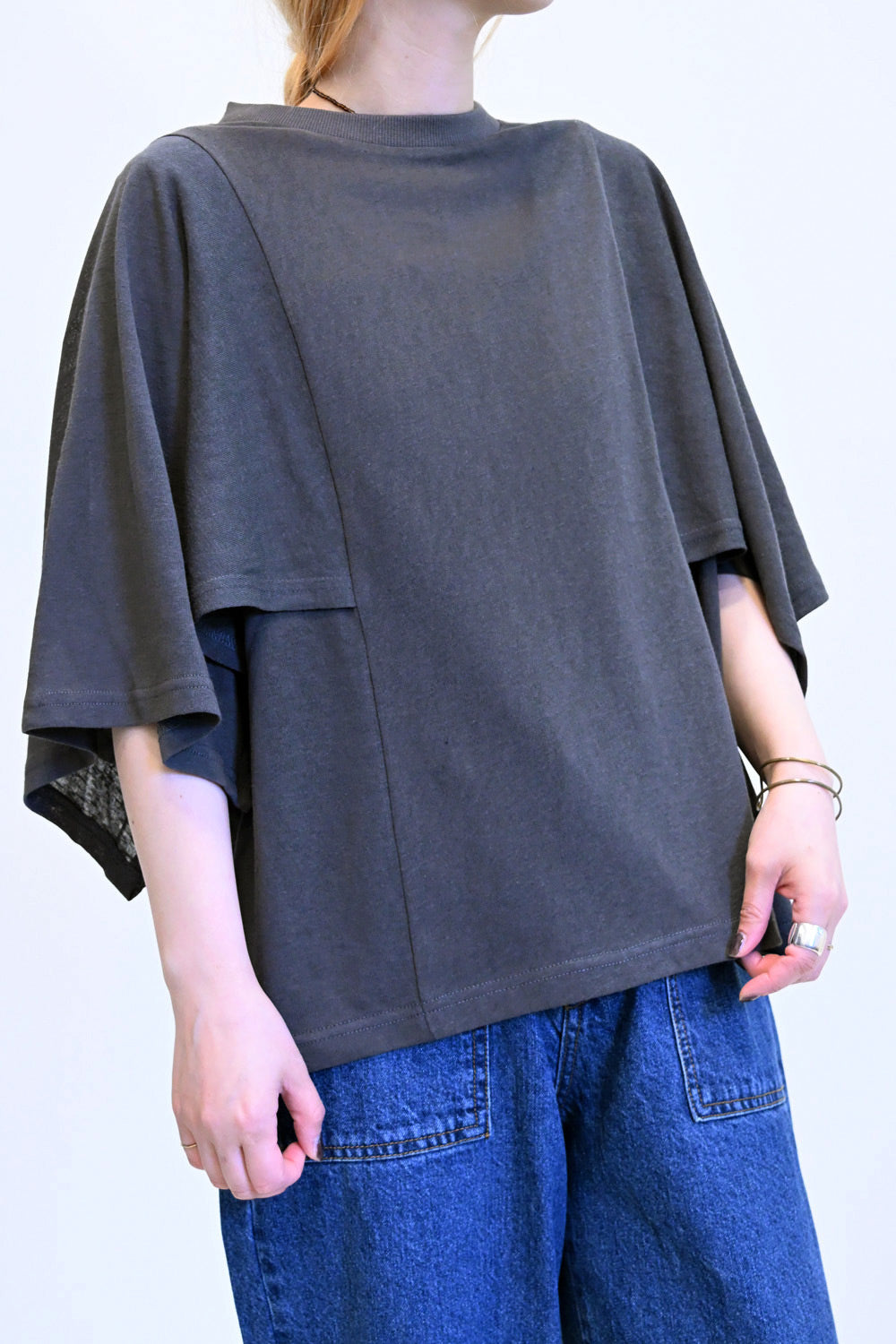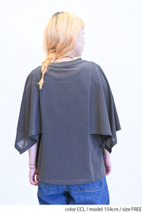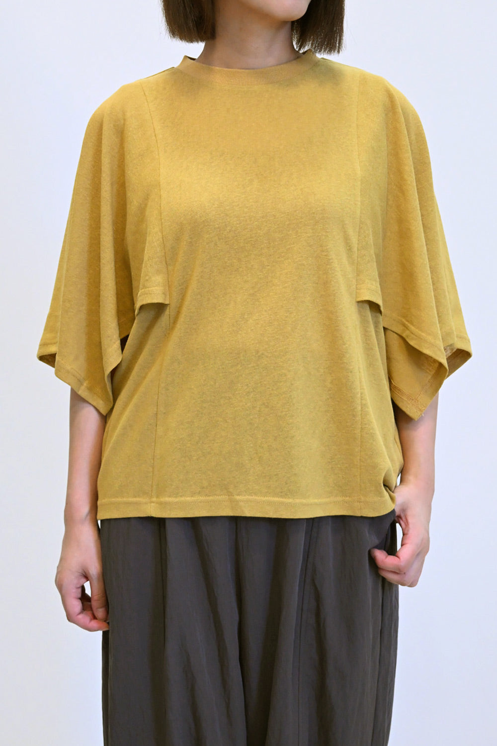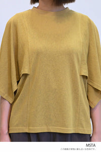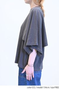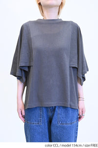 肩から二の腕にかけてケープのように広がる袖が、シンプルながらも個性的な存在感を演出。