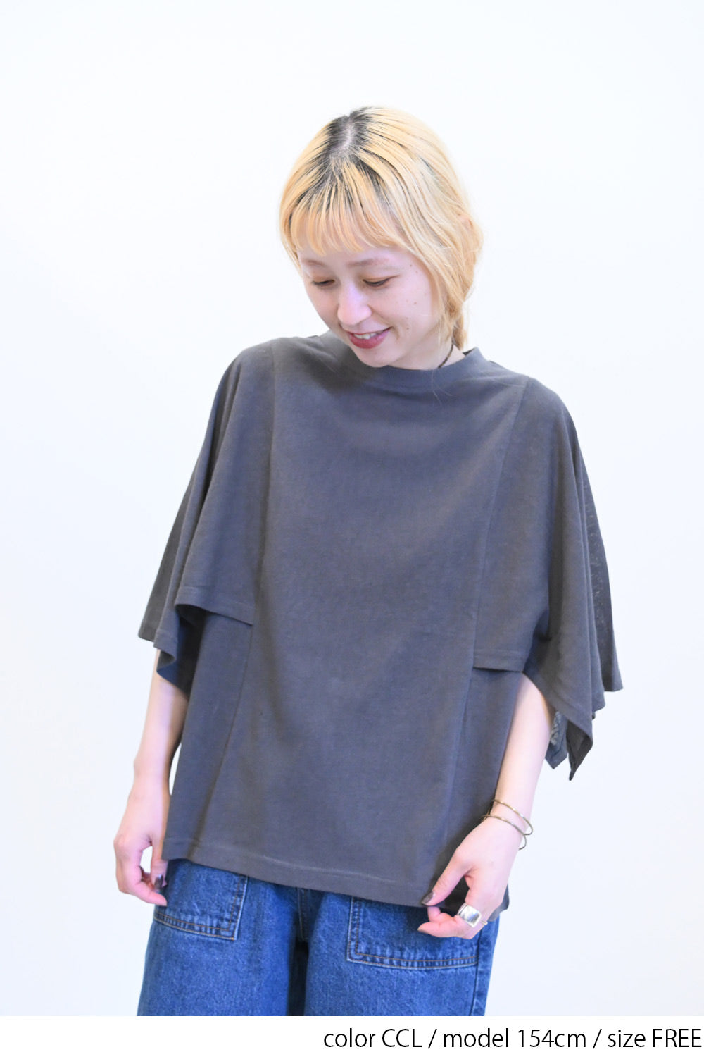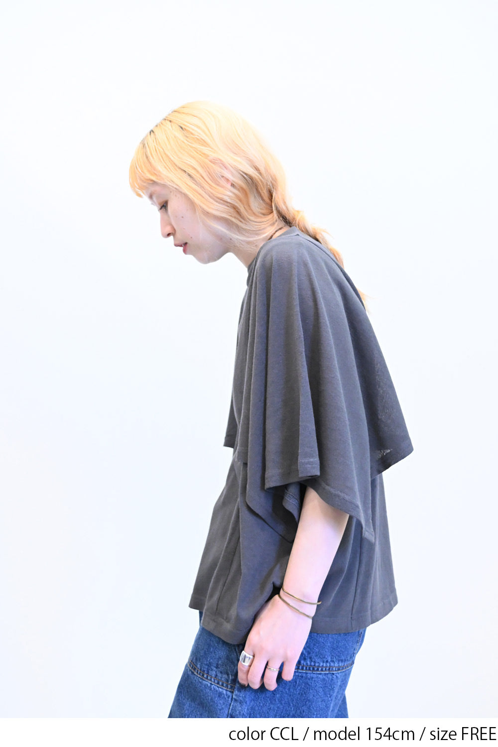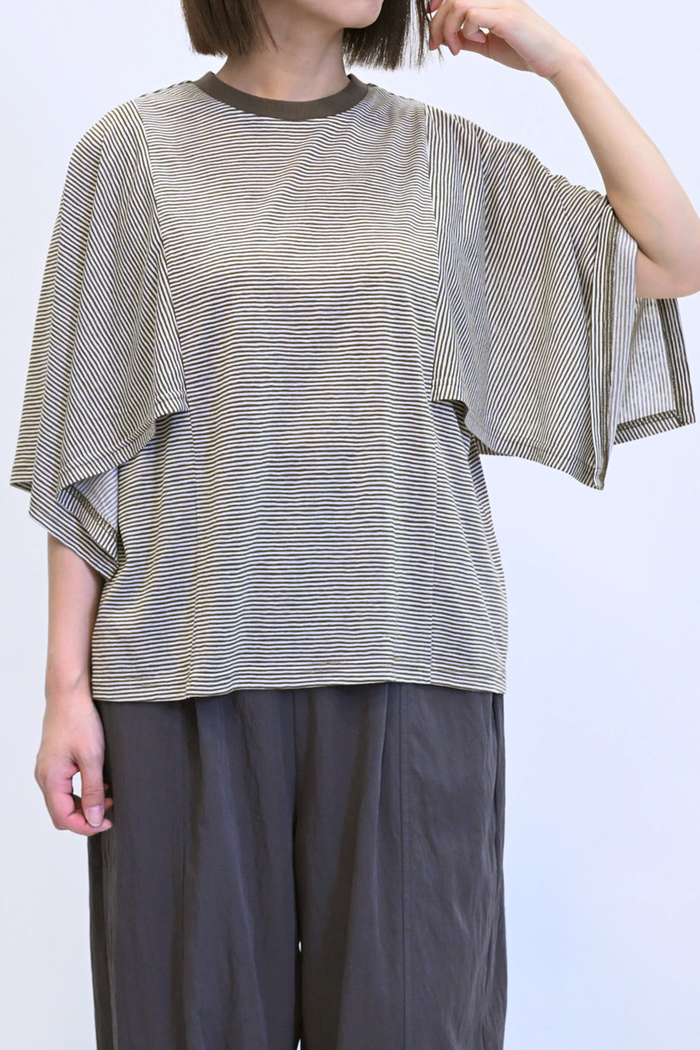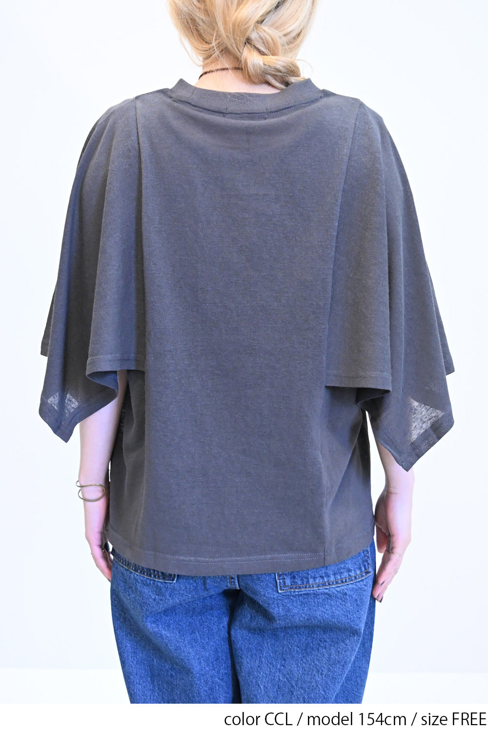 肩から二の腕にかけてケープのように広がる袖が、シンプルながらも個性的な存在感を演出。