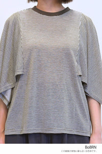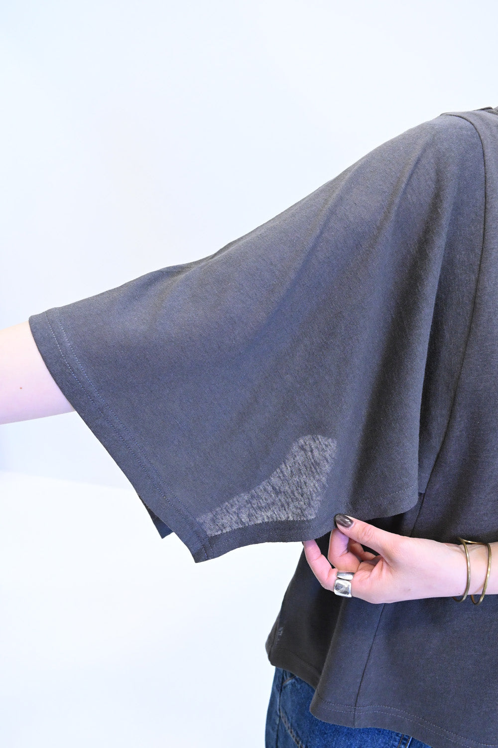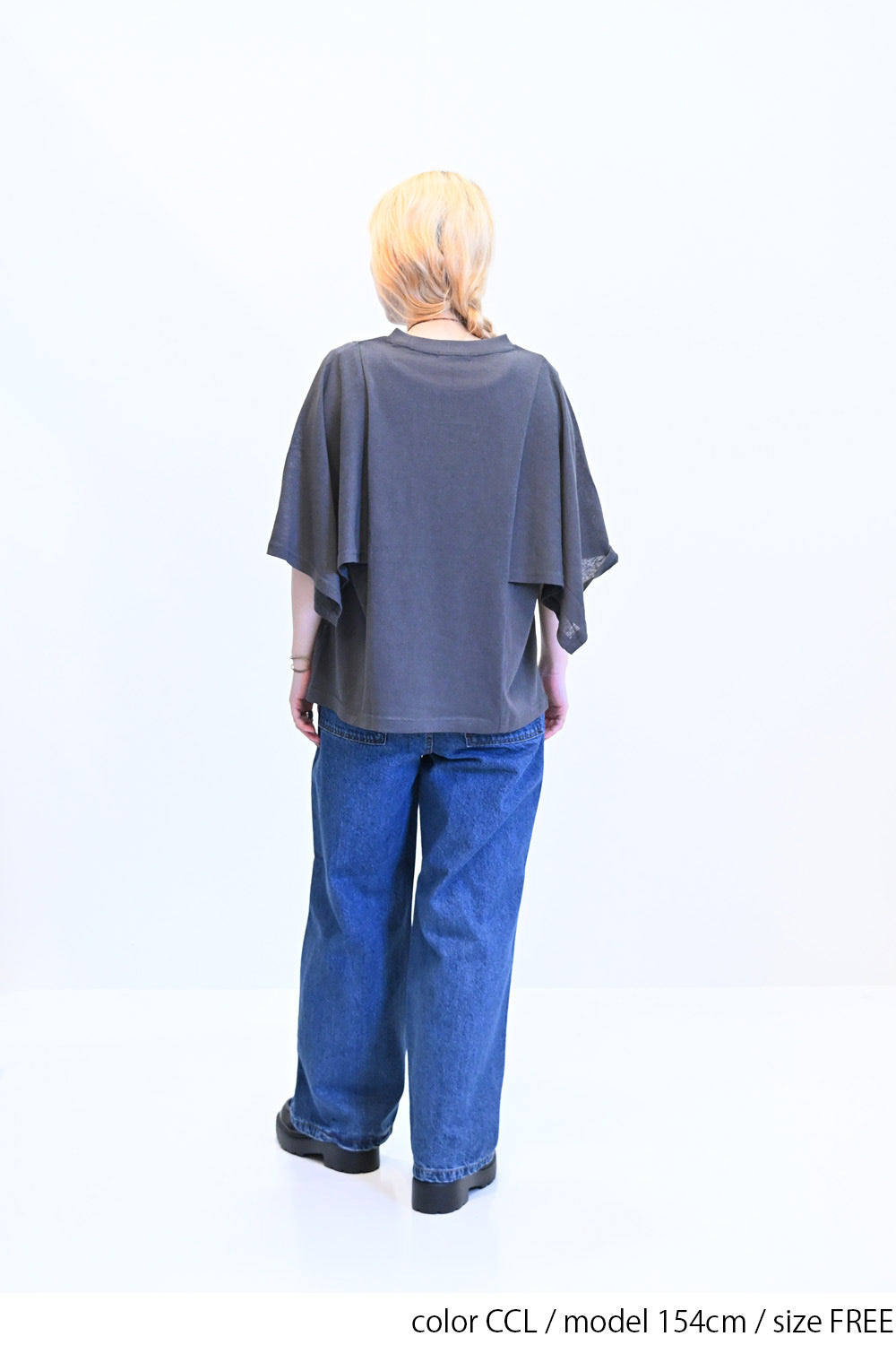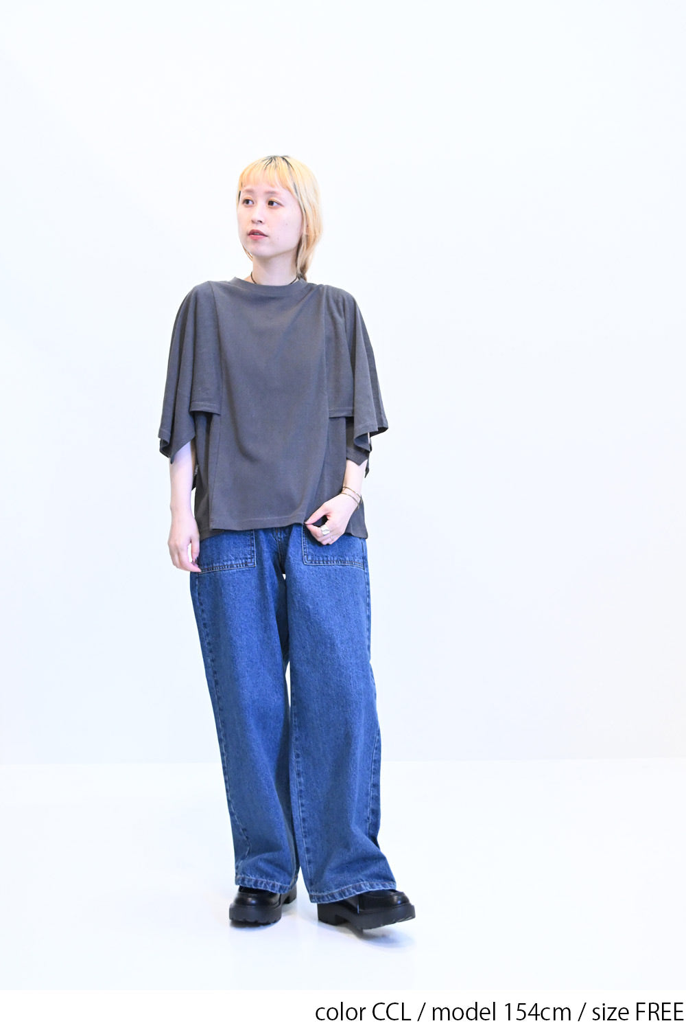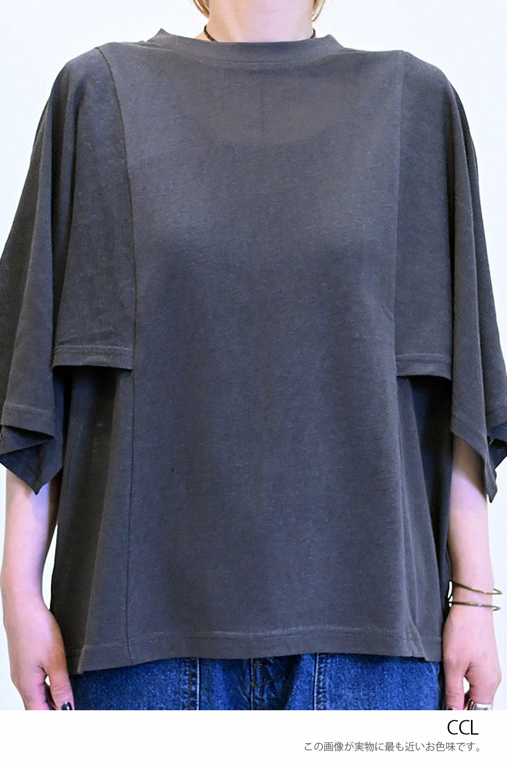 肩から二の腕にかけてケープのように広がる袖が、シンプルながらも個性的な存在感を演出。