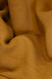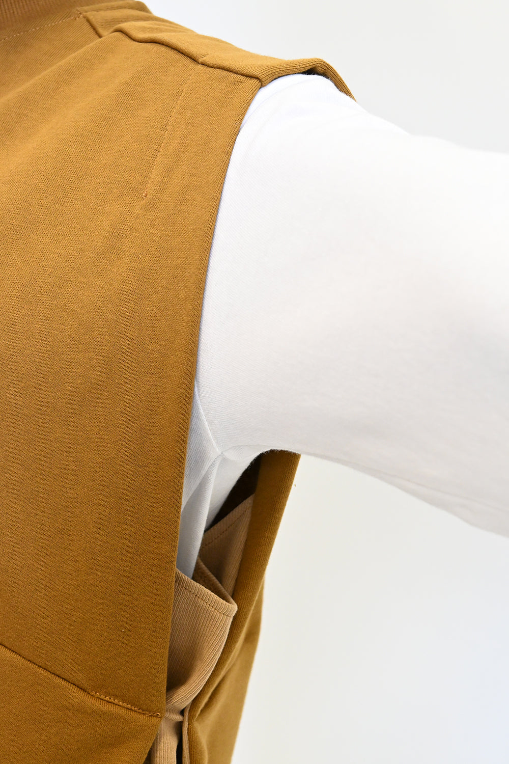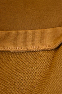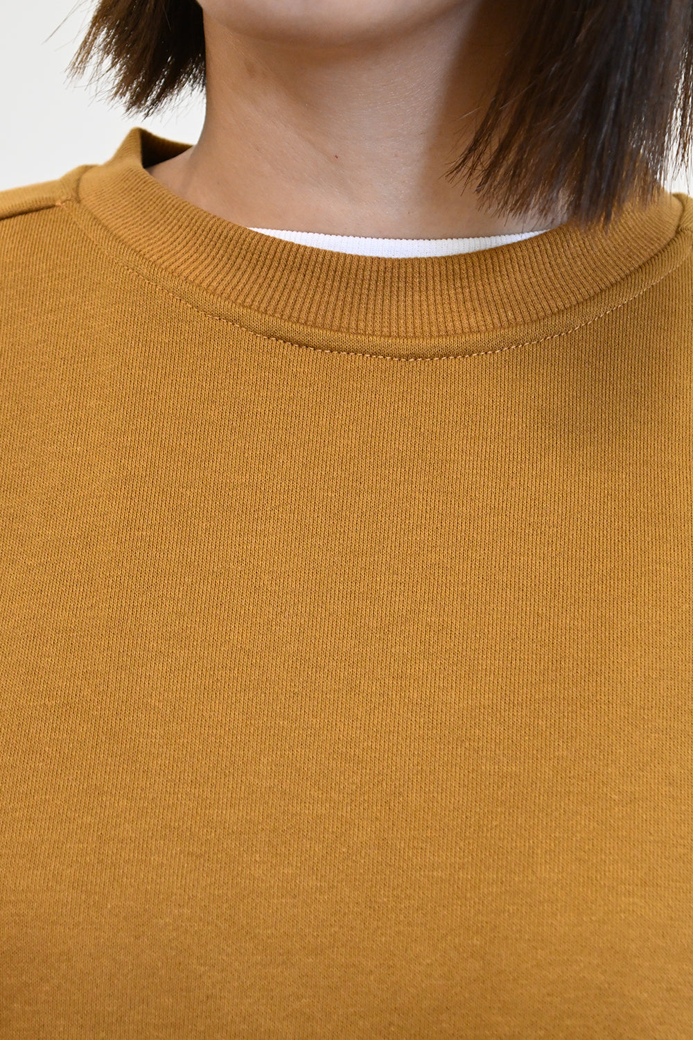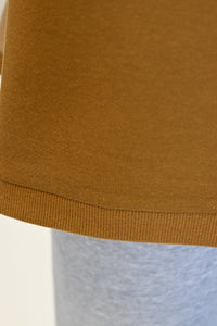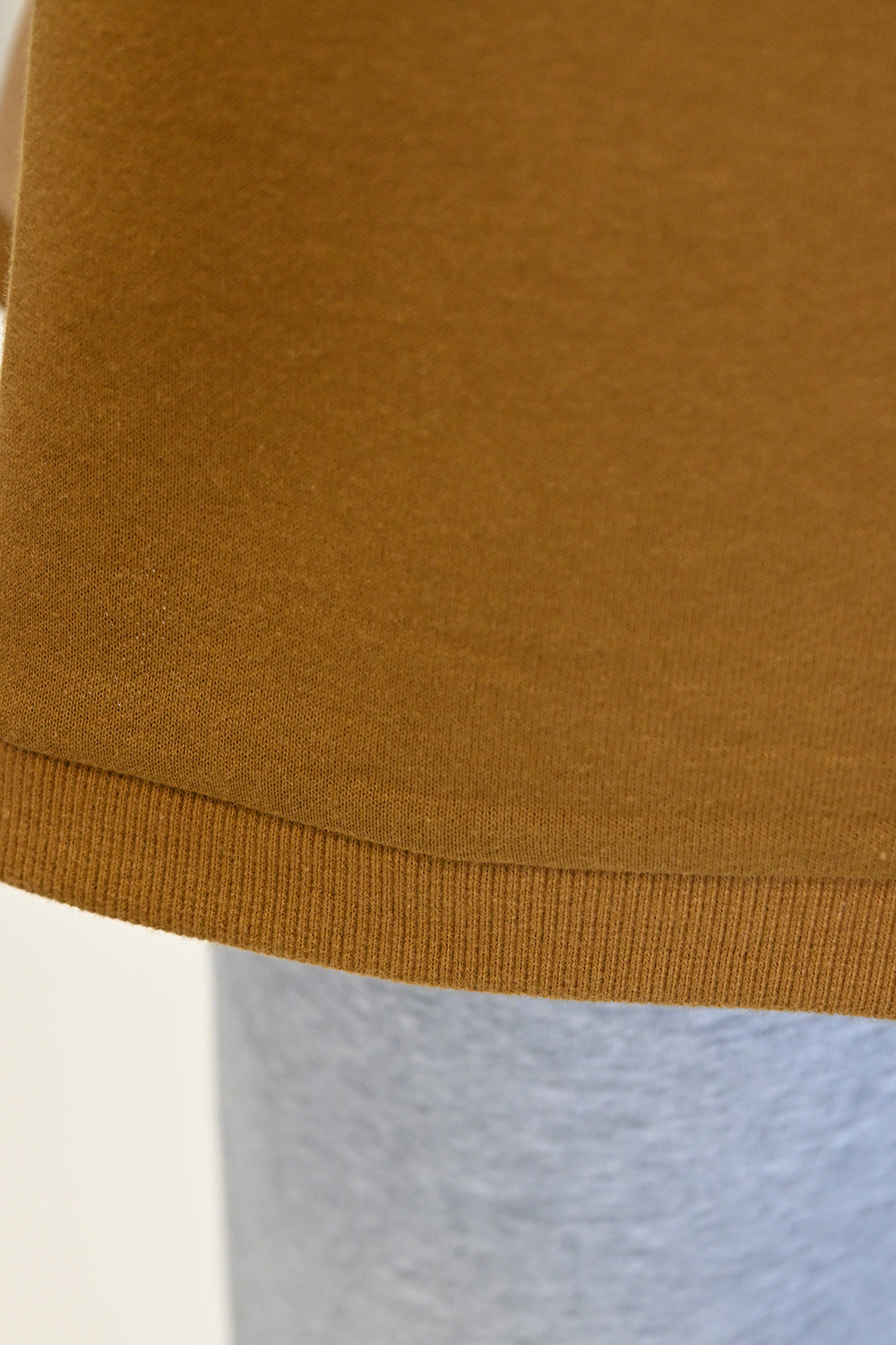 首元はすっきりとしたクルーネックで、様々なインナーと合わせやすいデザインに仕上げました。
