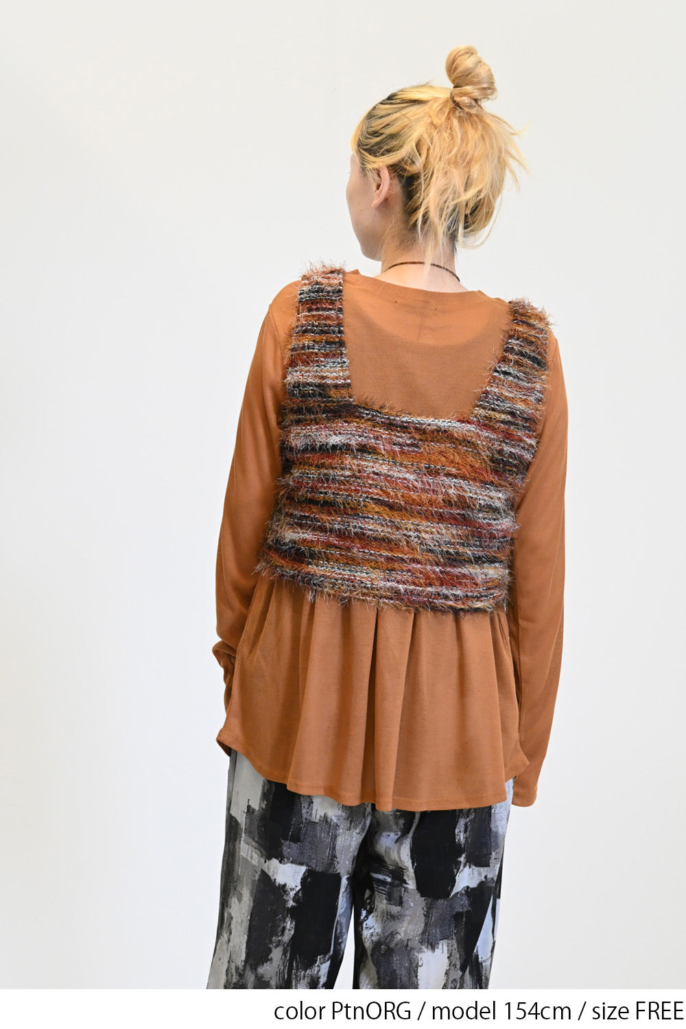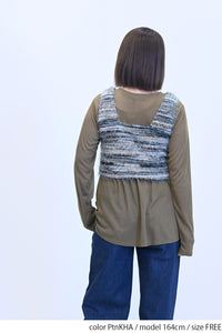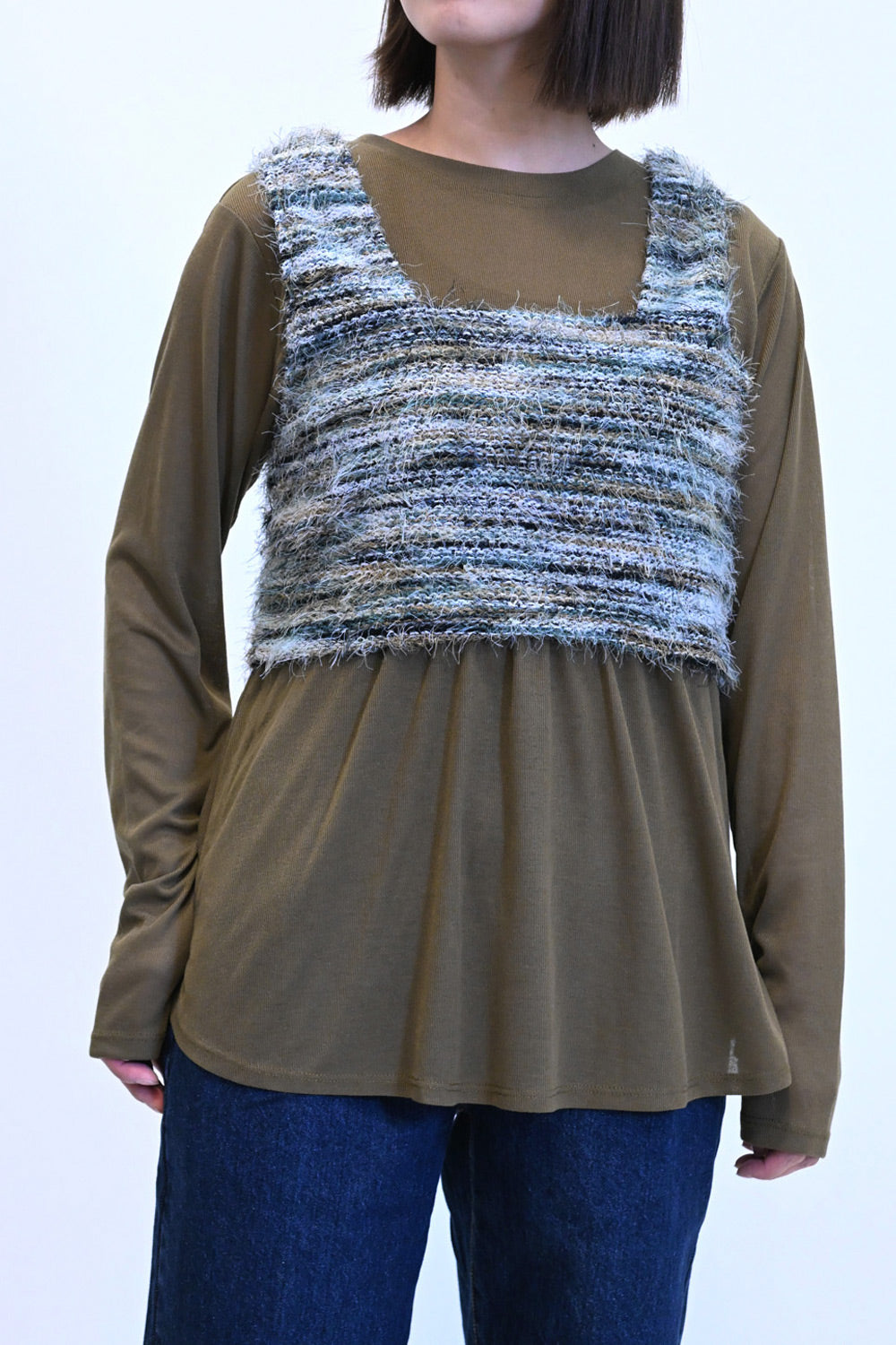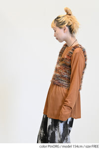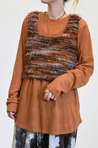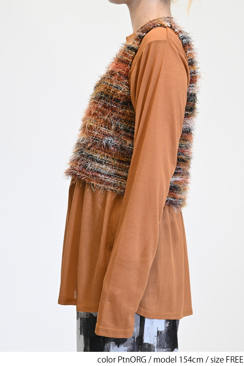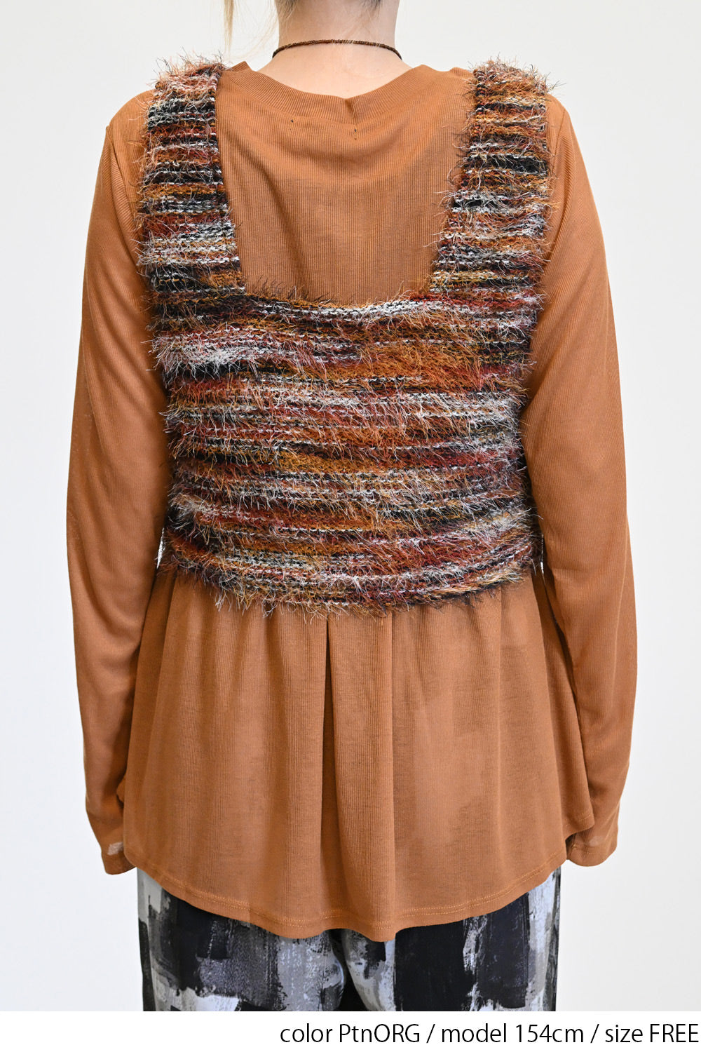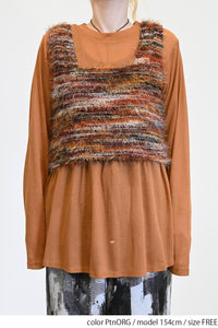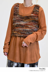 立体感のあるシャギーニットのビスチェと、着回し力抜群なシンプルな長袖Tシャツの組み合わせ。