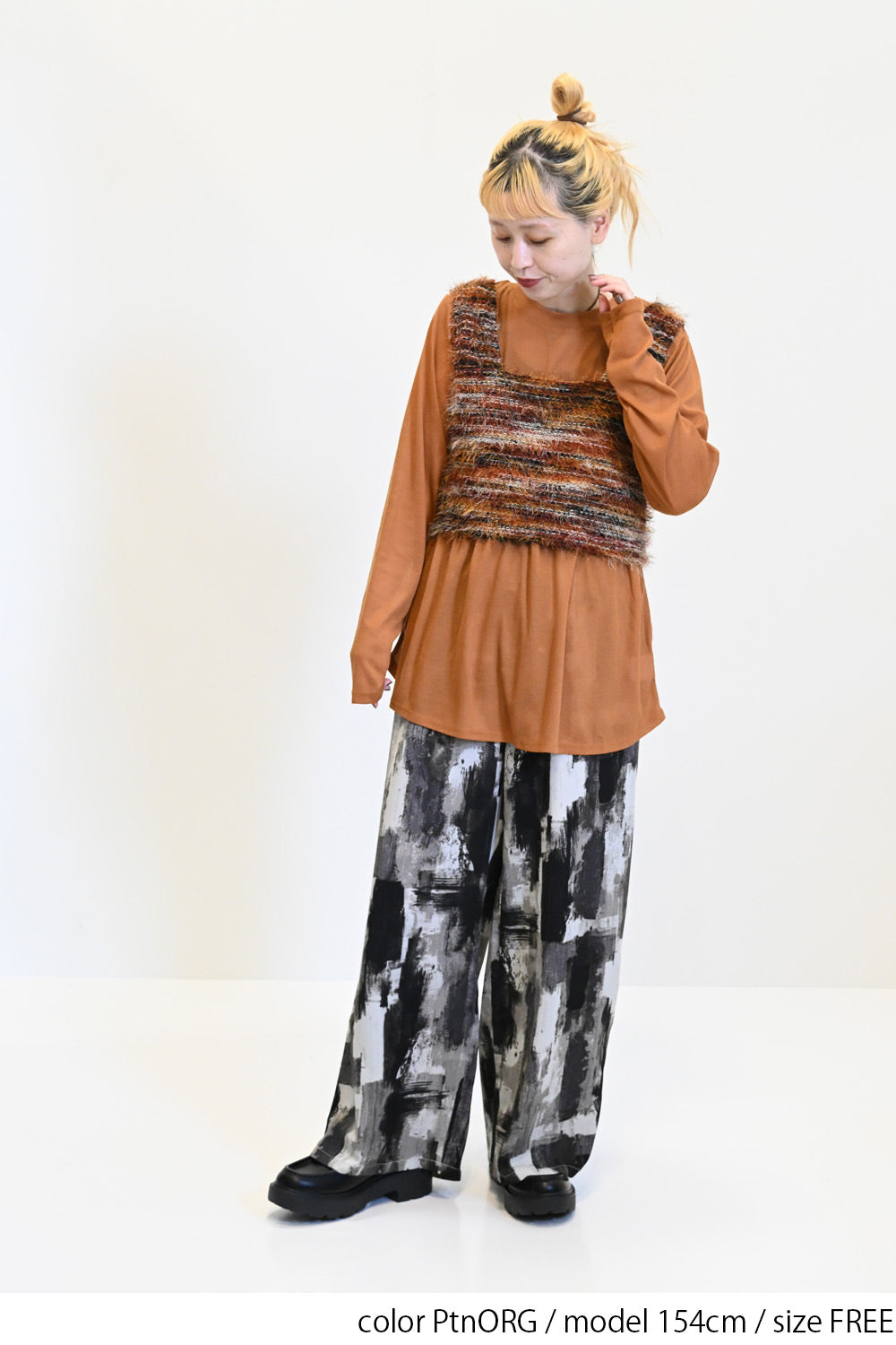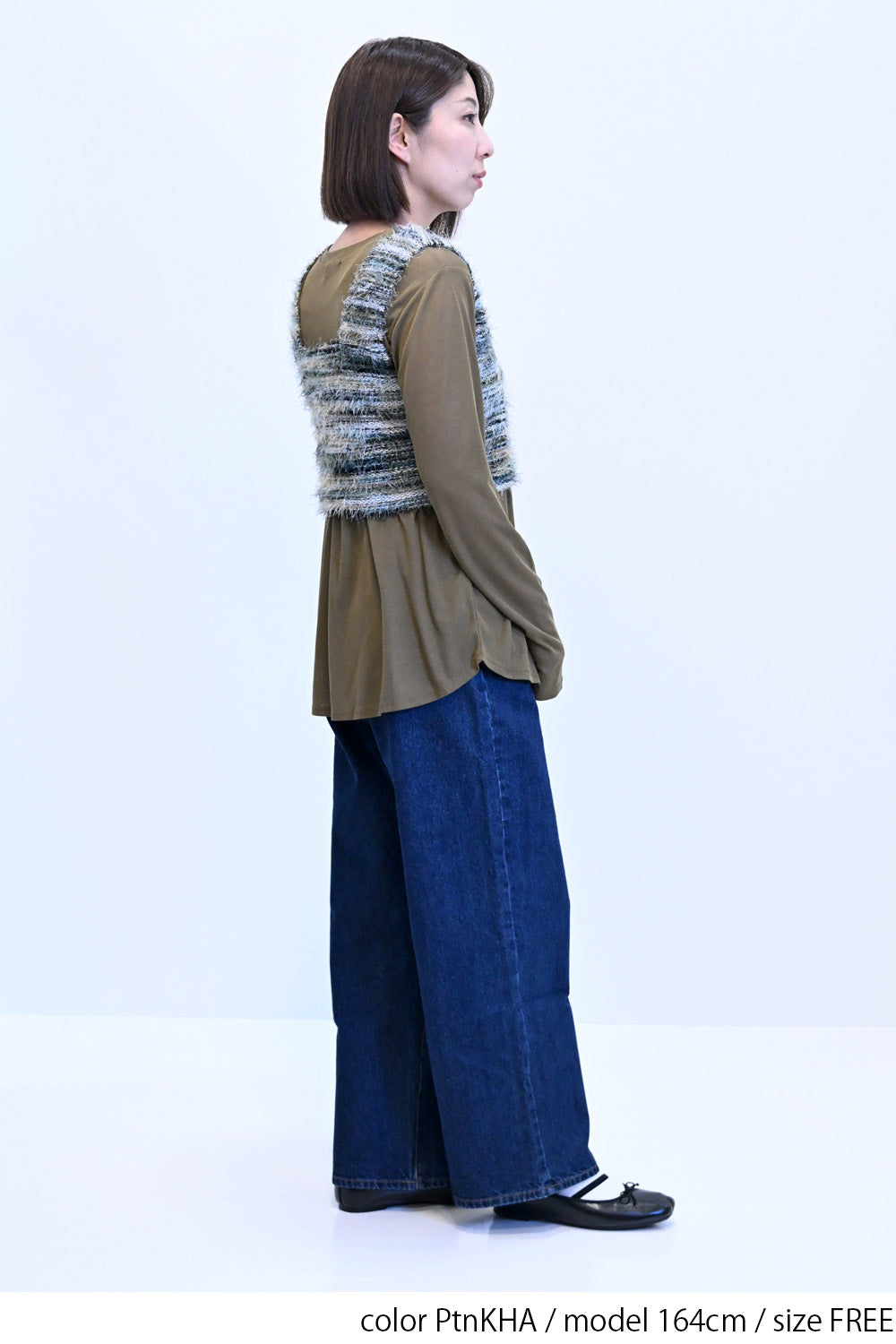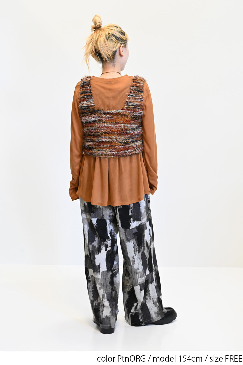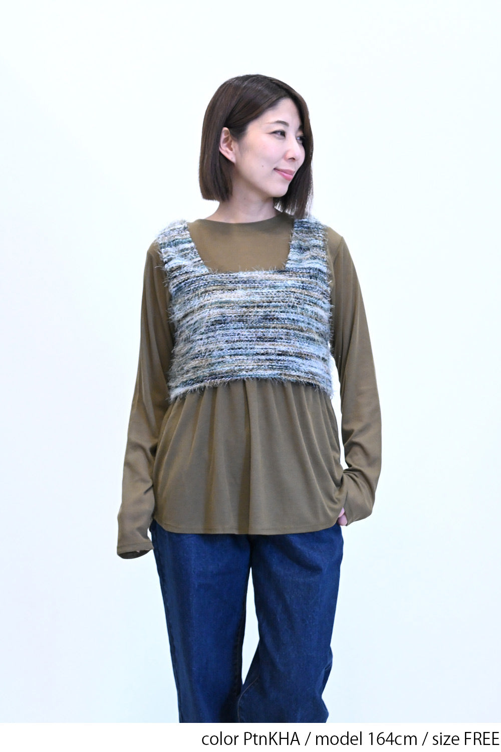 立体感のあるシャギーニットのビスチェと、着回し力抜群なシンプルな長袖Tシャツの組み合わせ。
