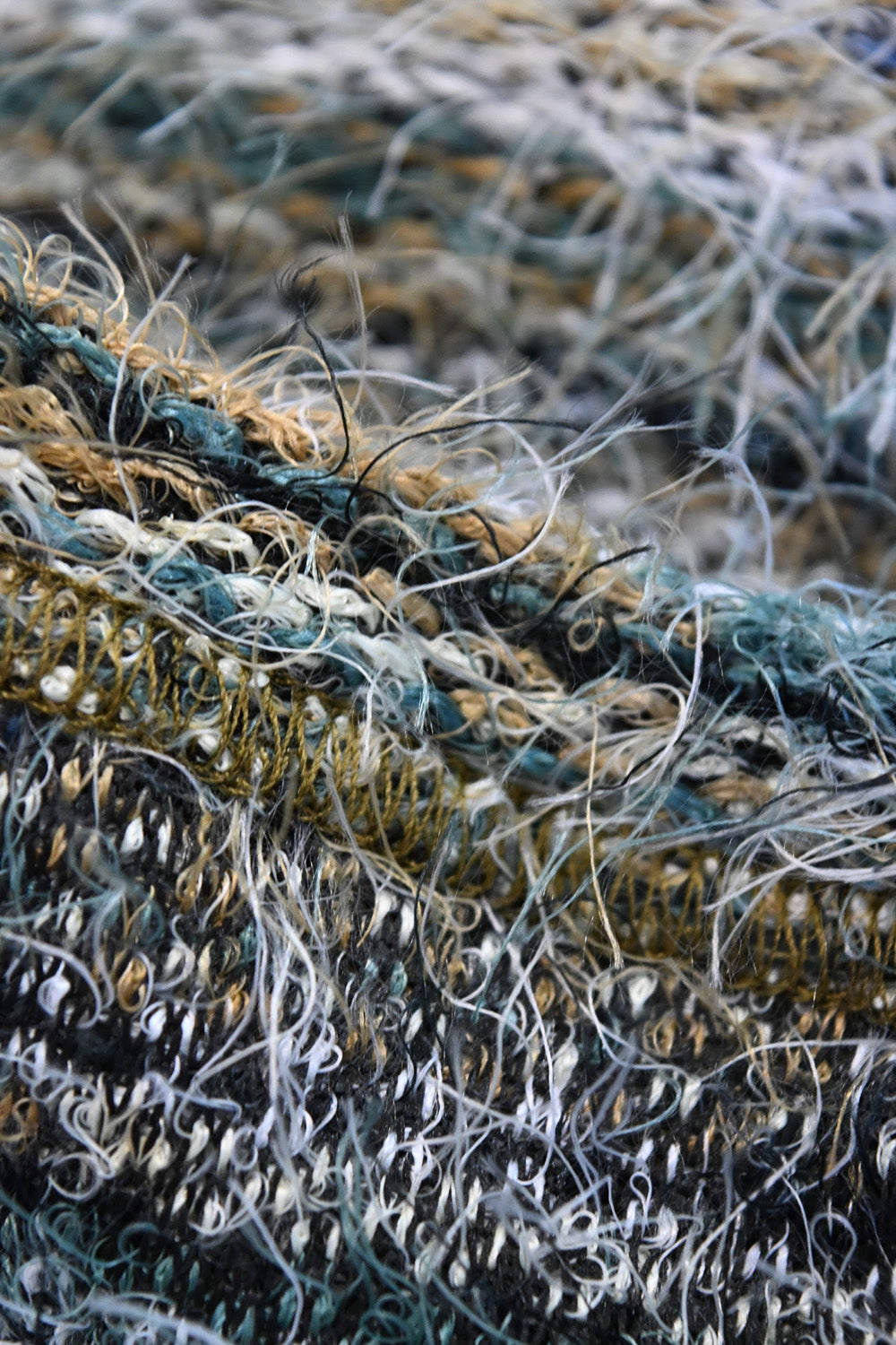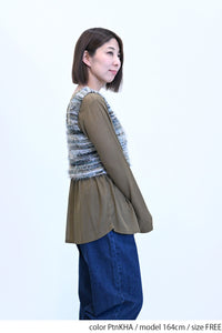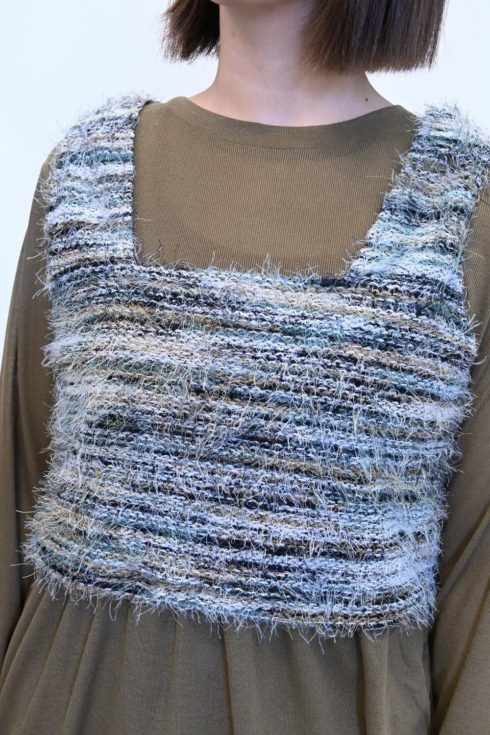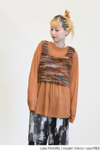 ビスチェは様々な色の糸がミックスされた、表情豊かなフェザーヤーン。