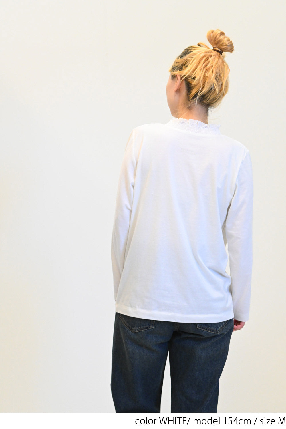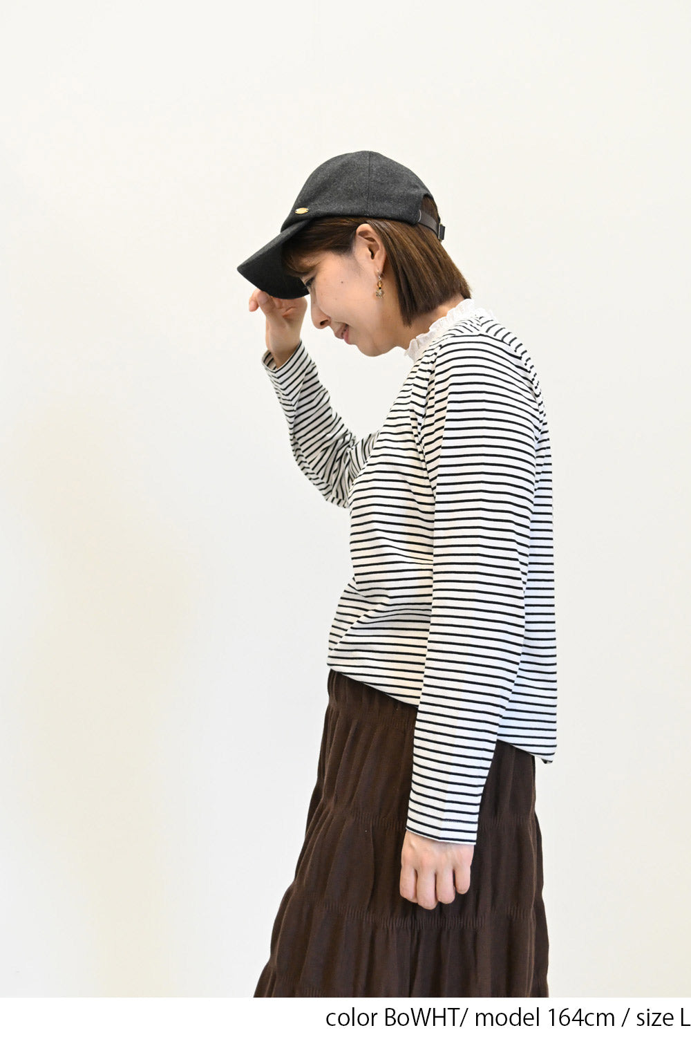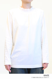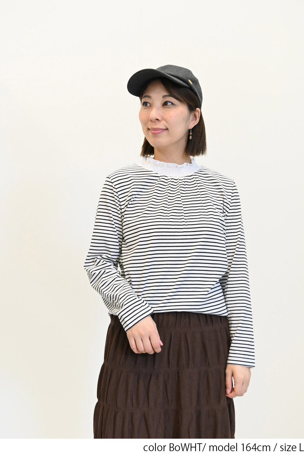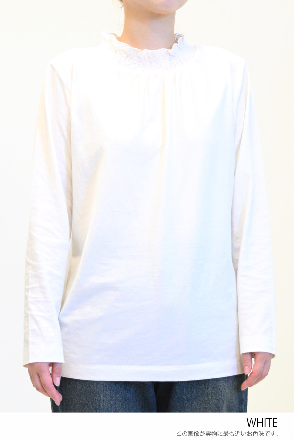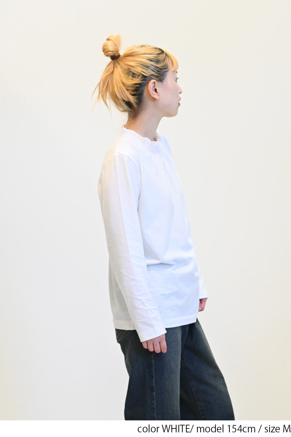 シンプルながらも顔まわりを華やかに見せてくれる、大人可愛いデザインのロンTです。