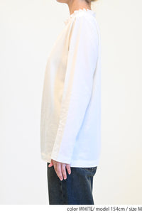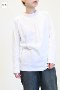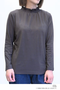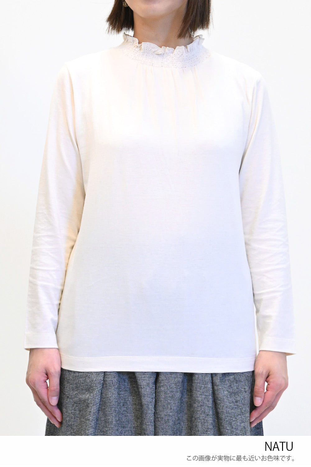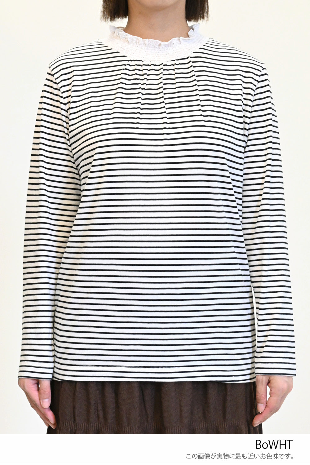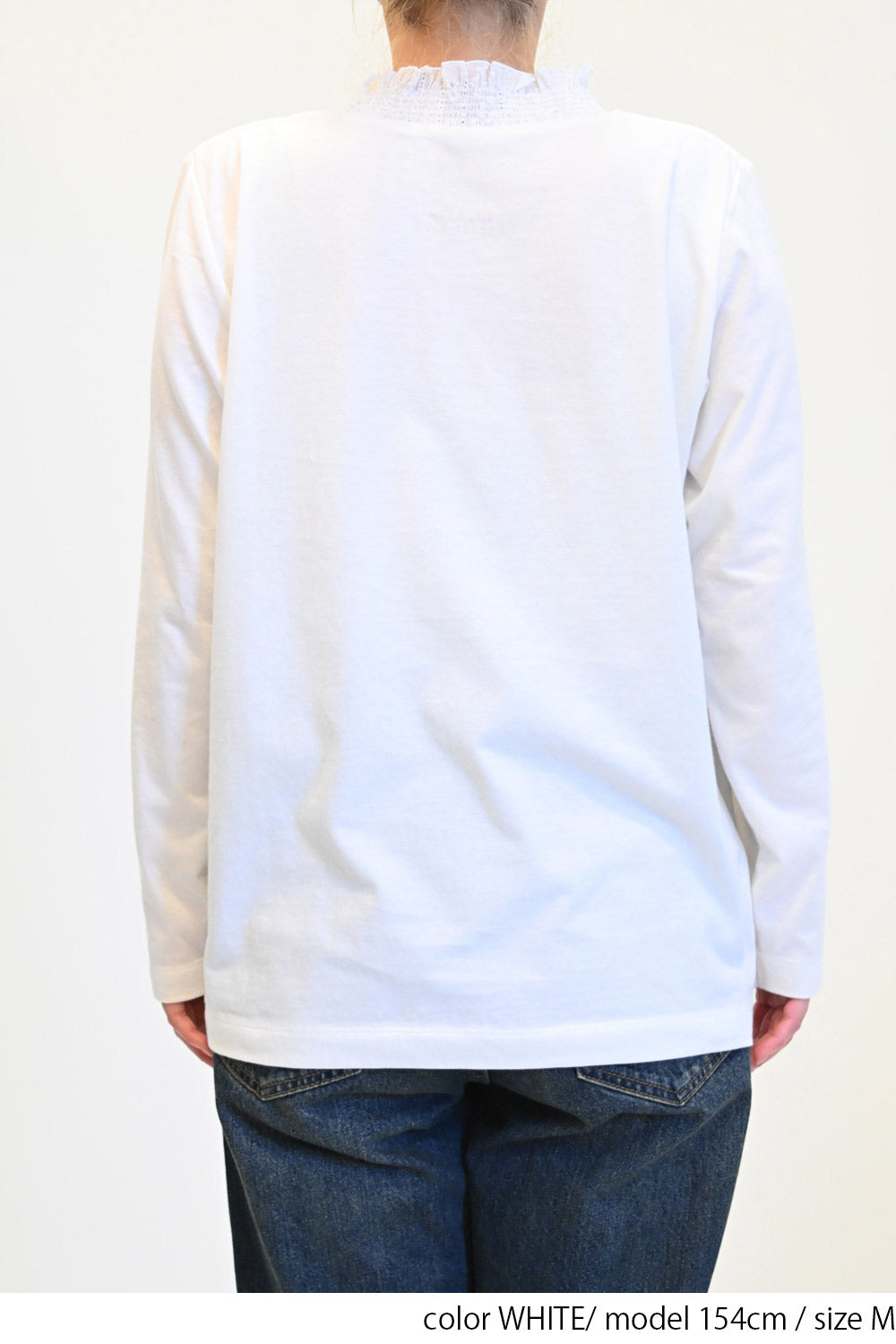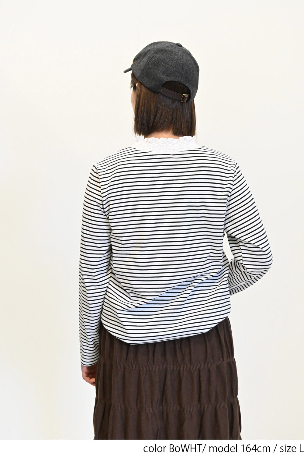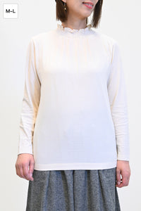 シンプルながらも顔まわりを華やかに見せてくれる、大人可愛いデザインのロンTです。