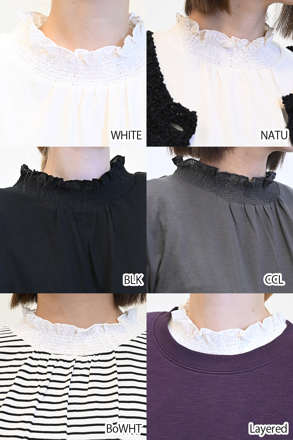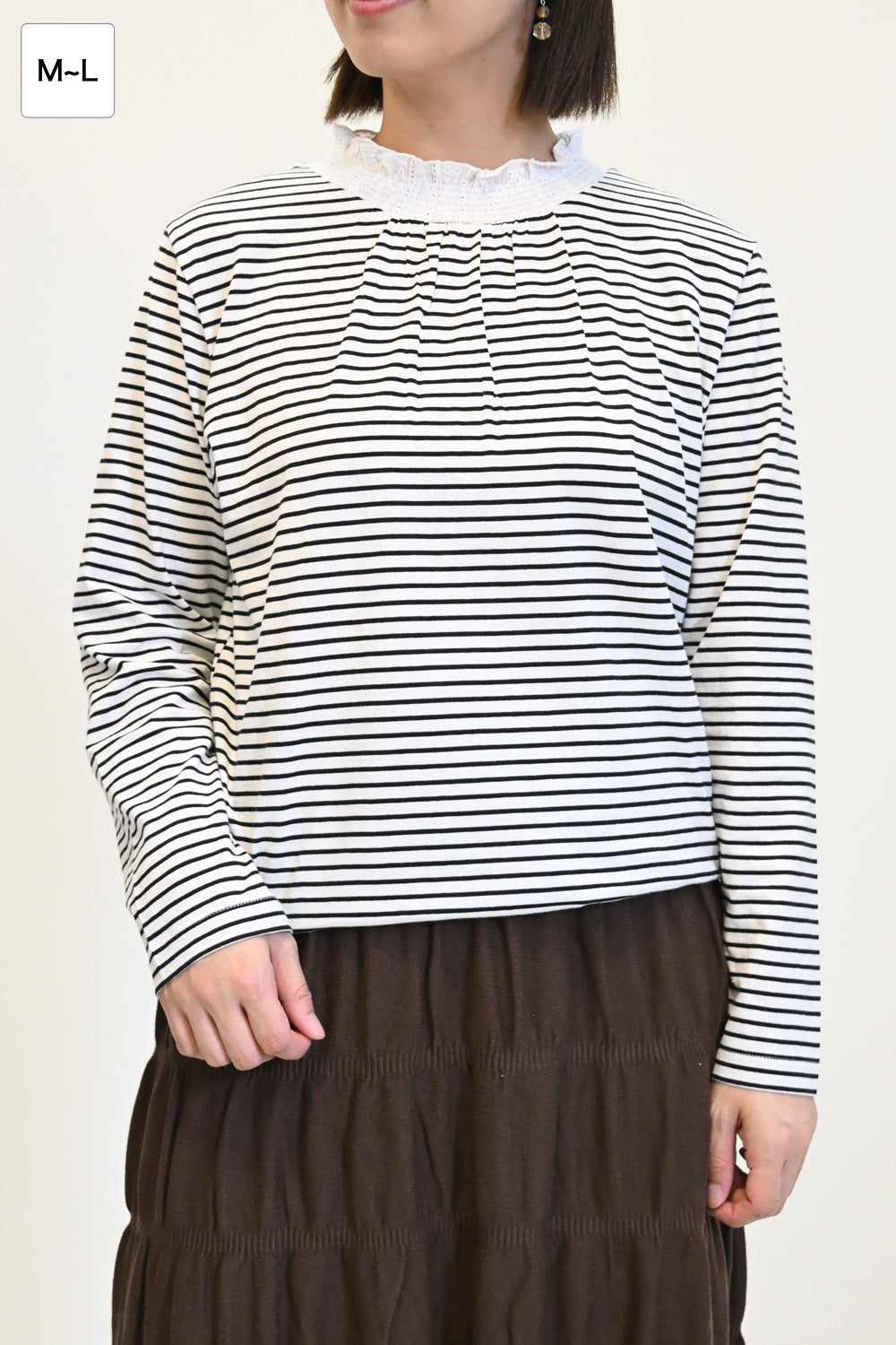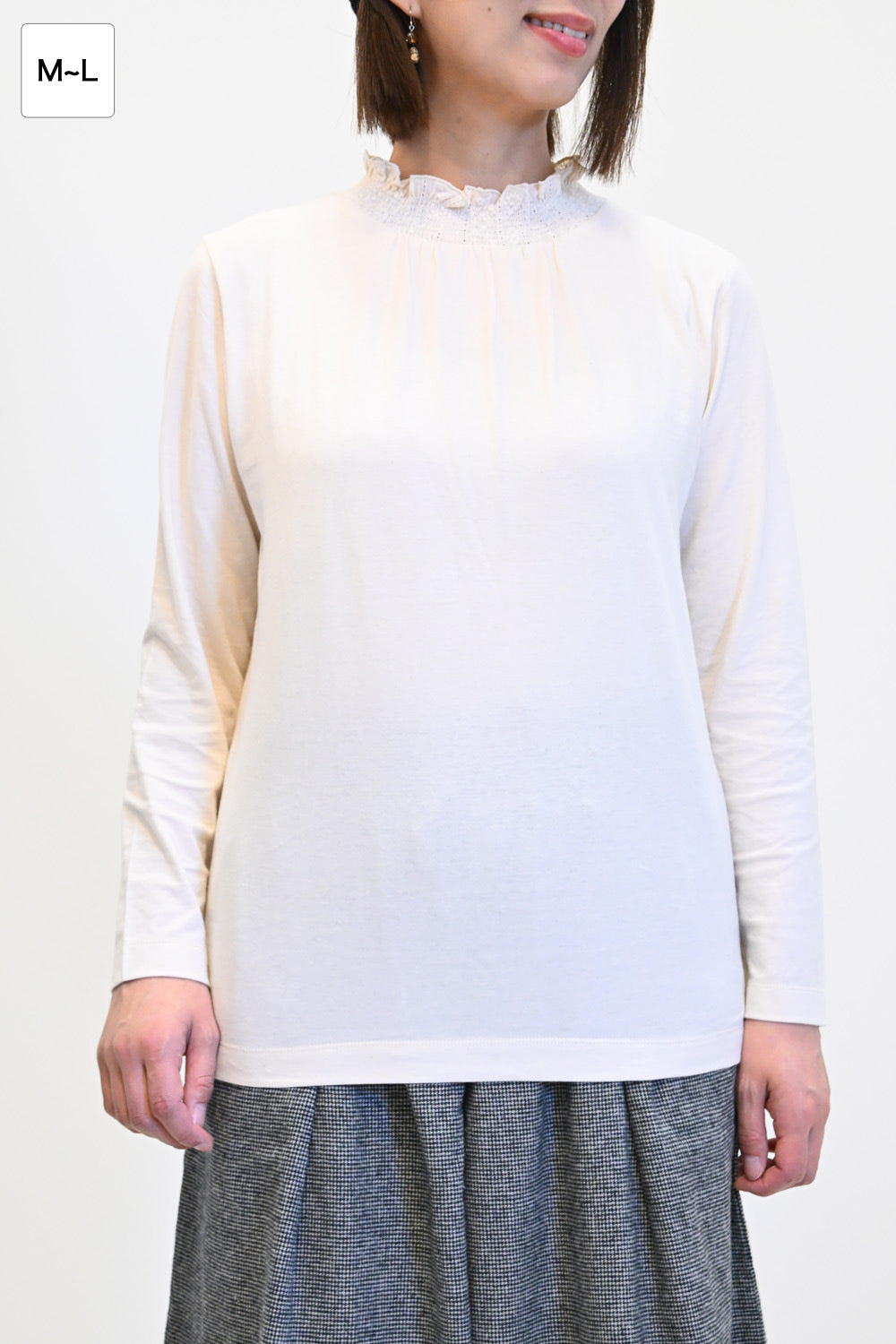 首元のシャーリングレースが上品なアクセントになるので、ジャンスカやきれいめボトムと合わせればエレガントな大人スタイルに。