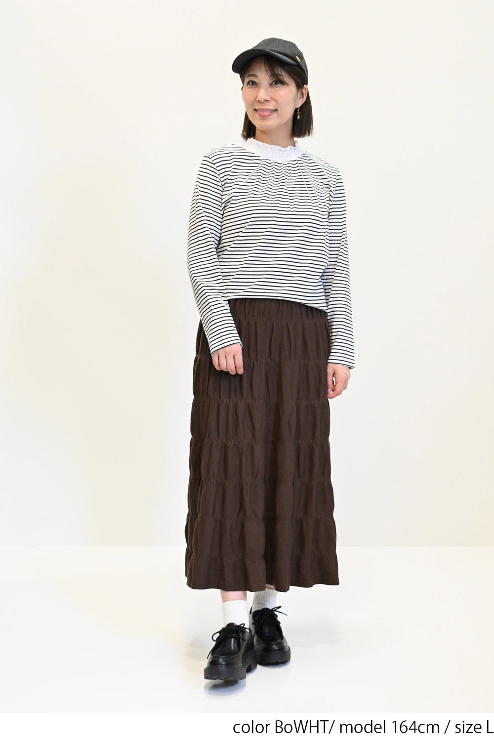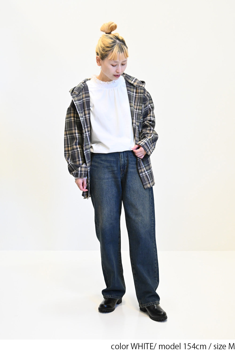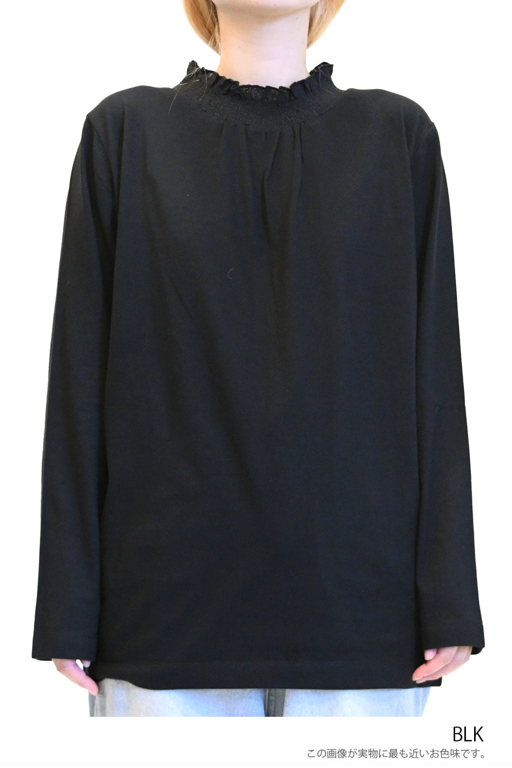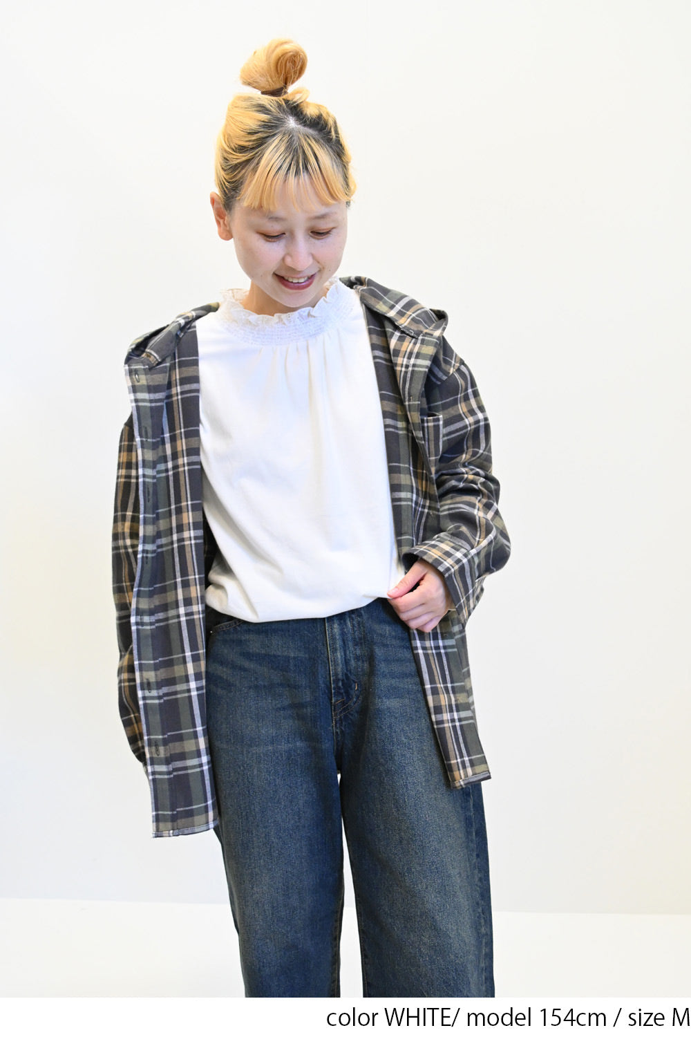 首元のシャーリングレースが上品なアクセントになるので、ジャンスカやきれいめボトムと合わせればエレガントな大人スタイルに。