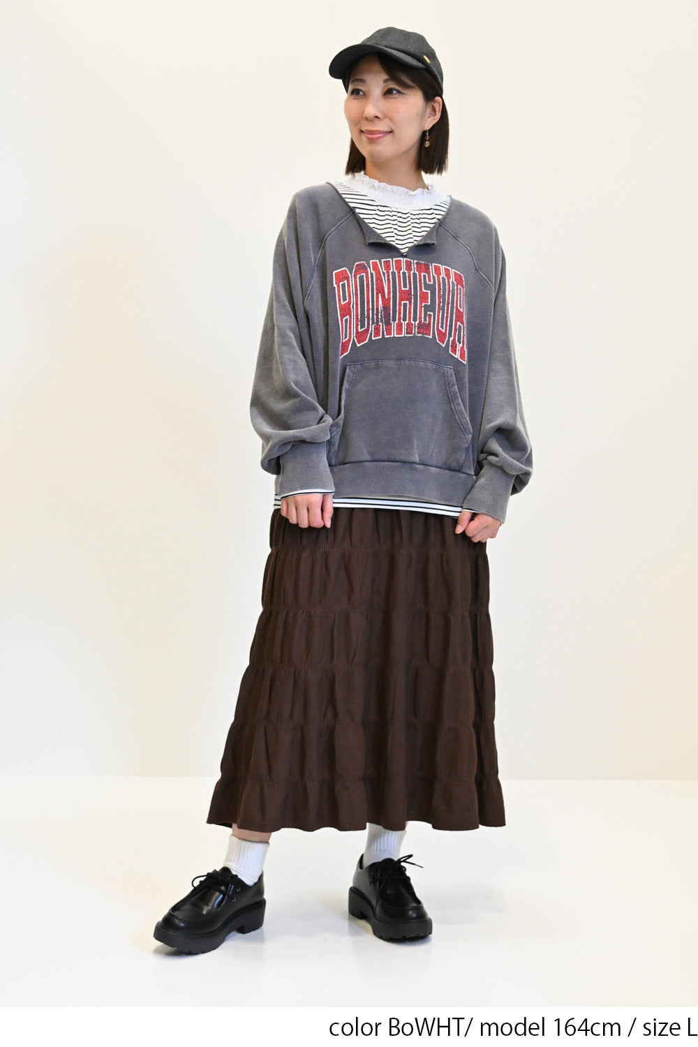 トレーナーやベストのインナーに重ねれば、カジュアルコーデにさりげない甘さをプラスしてくれます。