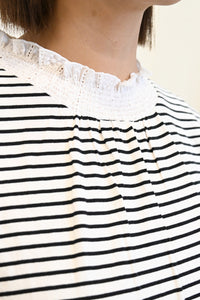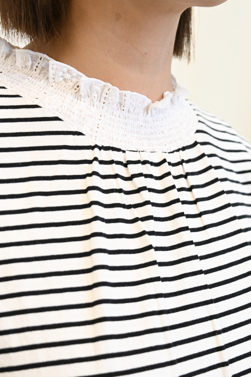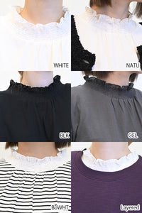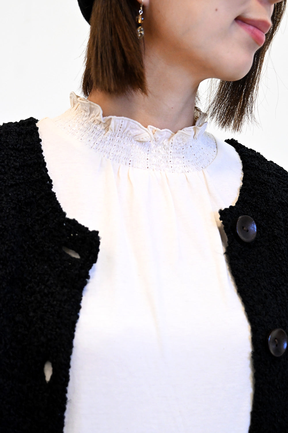 首元にあしらわれた繊細なシャーリングレースがエレガントな雰囲気を演出。