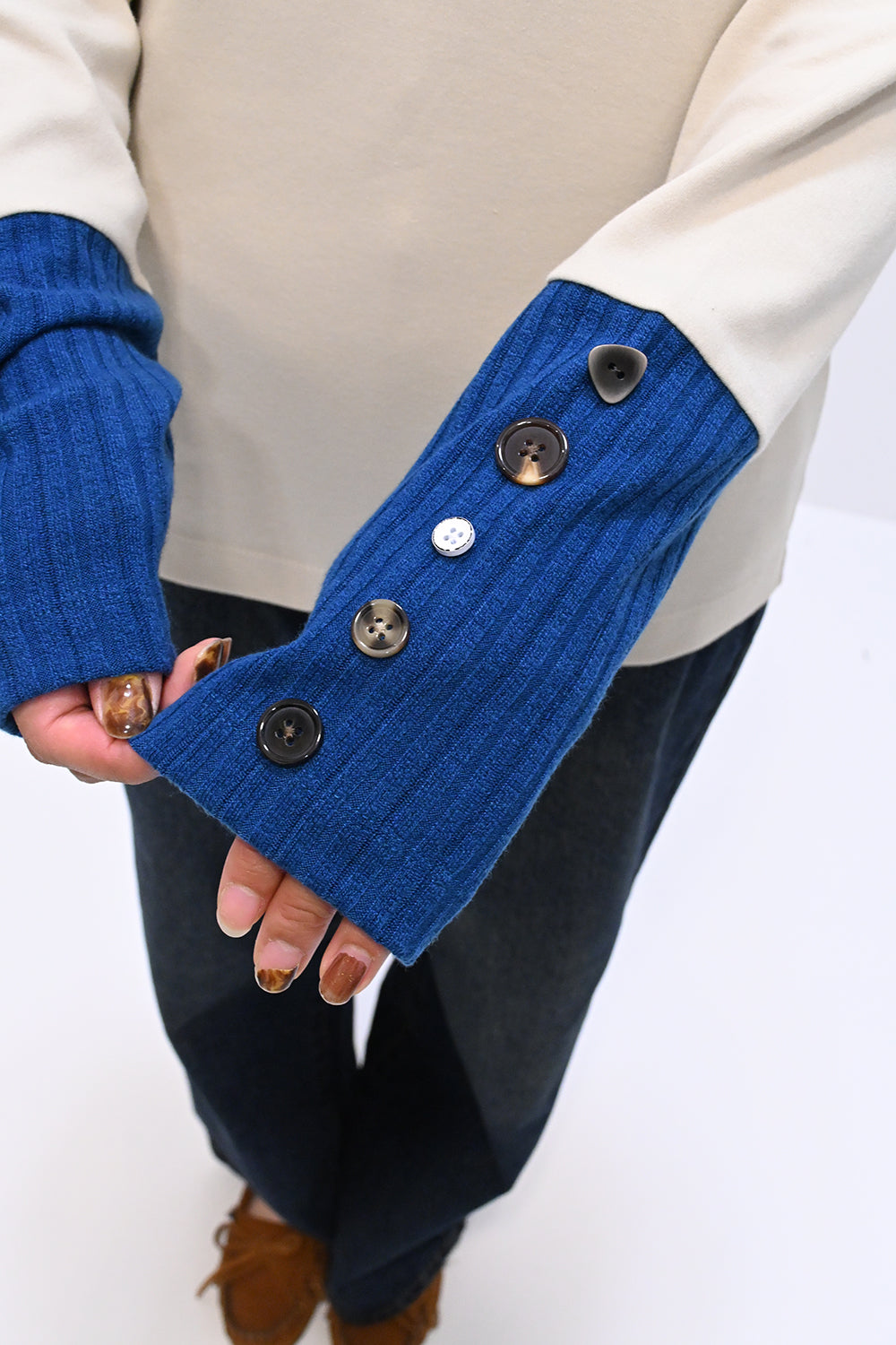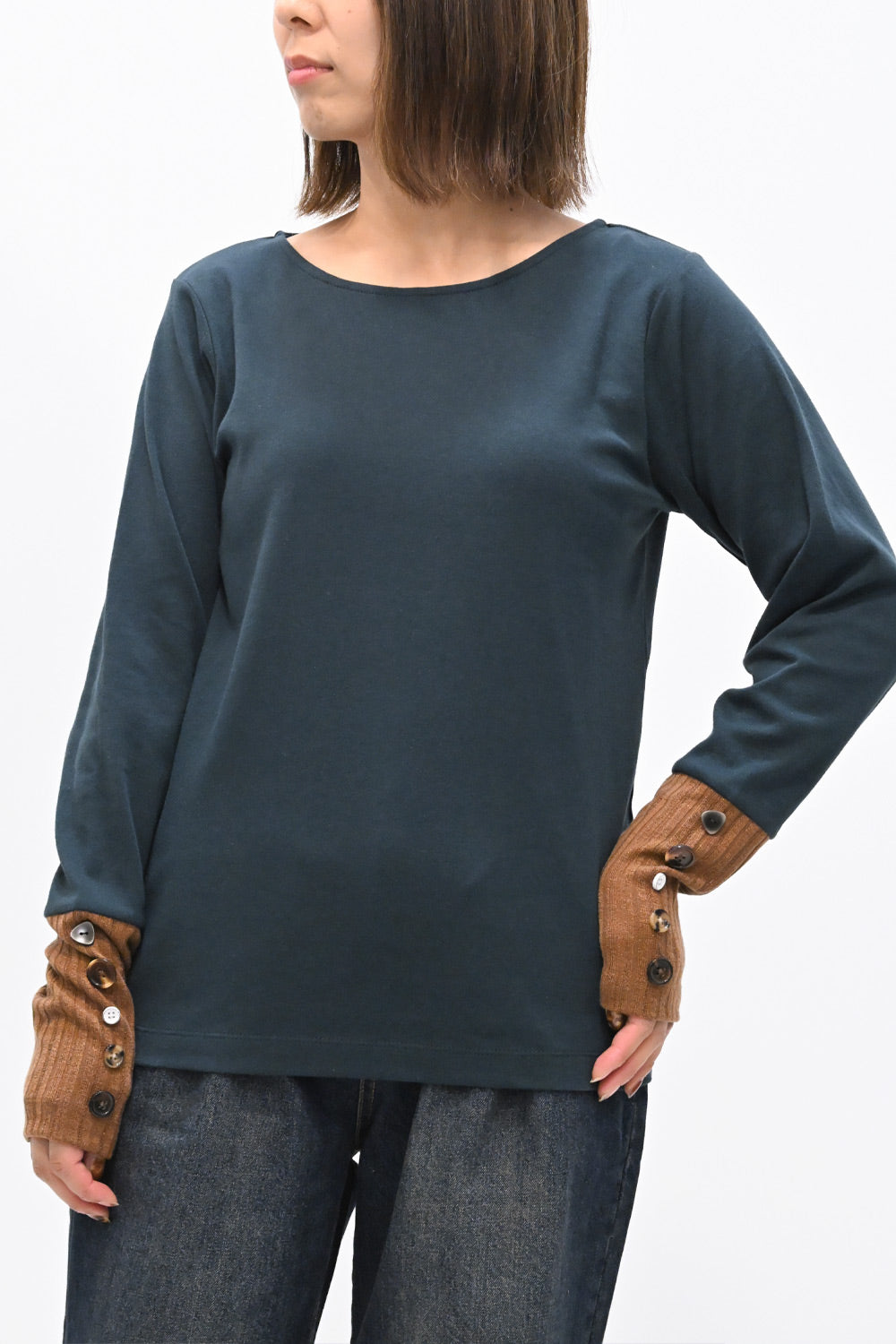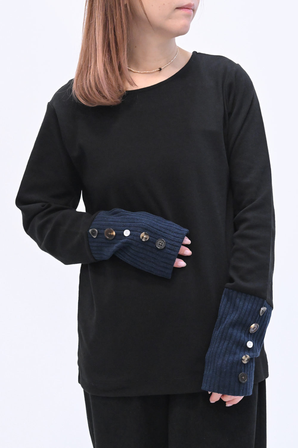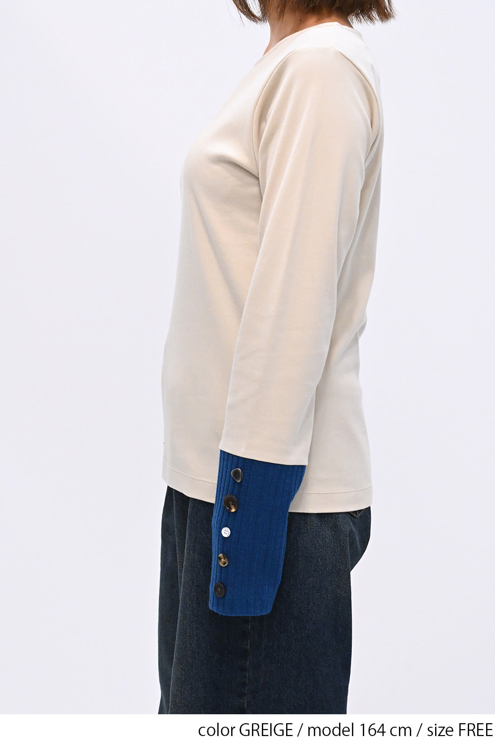 袖部分はハイゲージのリブ素材で切り替え、ボタンディテールをあしらいました。