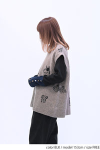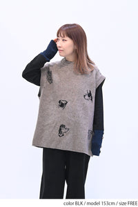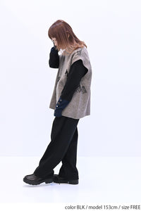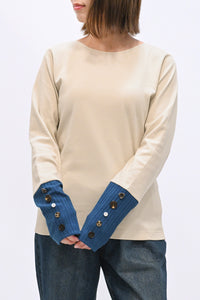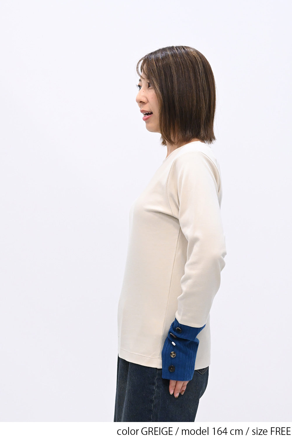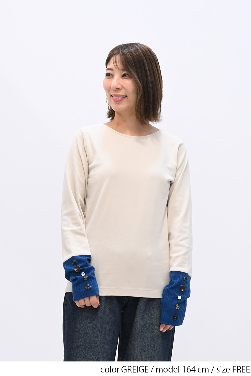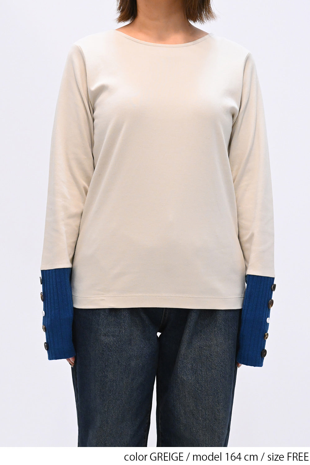 袖部分はハイゲージのリブ素材で切り替え、ボタンディテールをあしらいました。