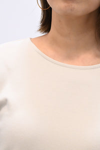 身頃にはスムース天竺素材を使用し、程よい厚みと落ち着いた光沢感が上品な印象に。
