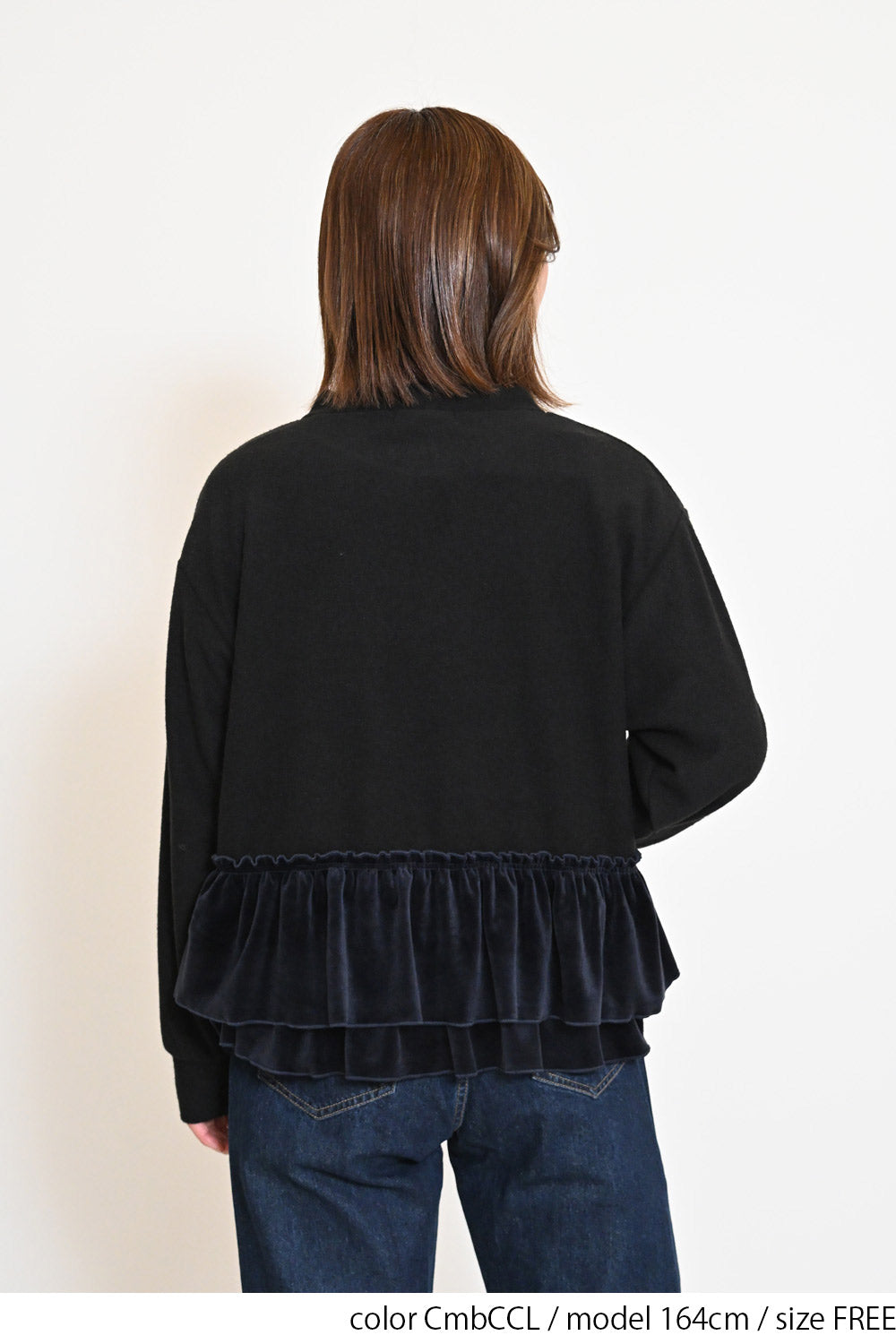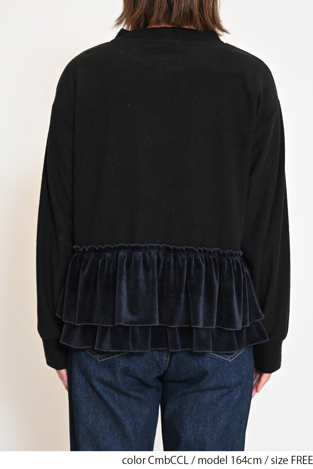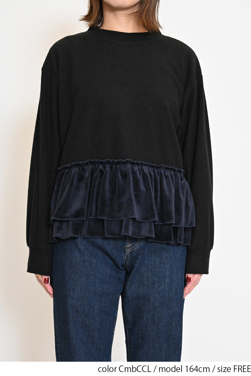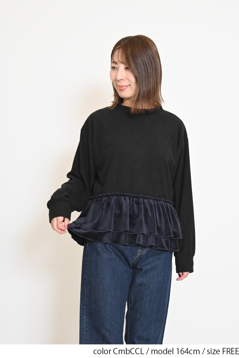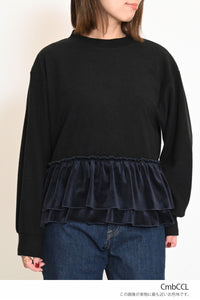 シンプルな表起毛カットソーに、ベロア素材のフリルをあしらい、1枚で旬なレイヤード風スタイルを叶えます。