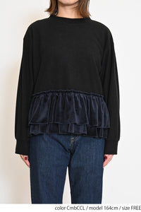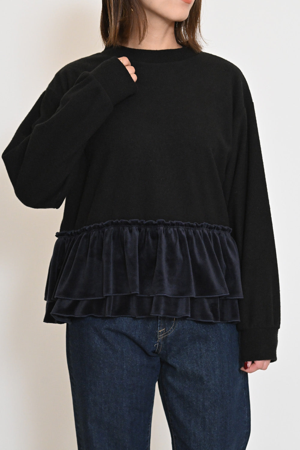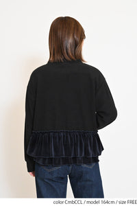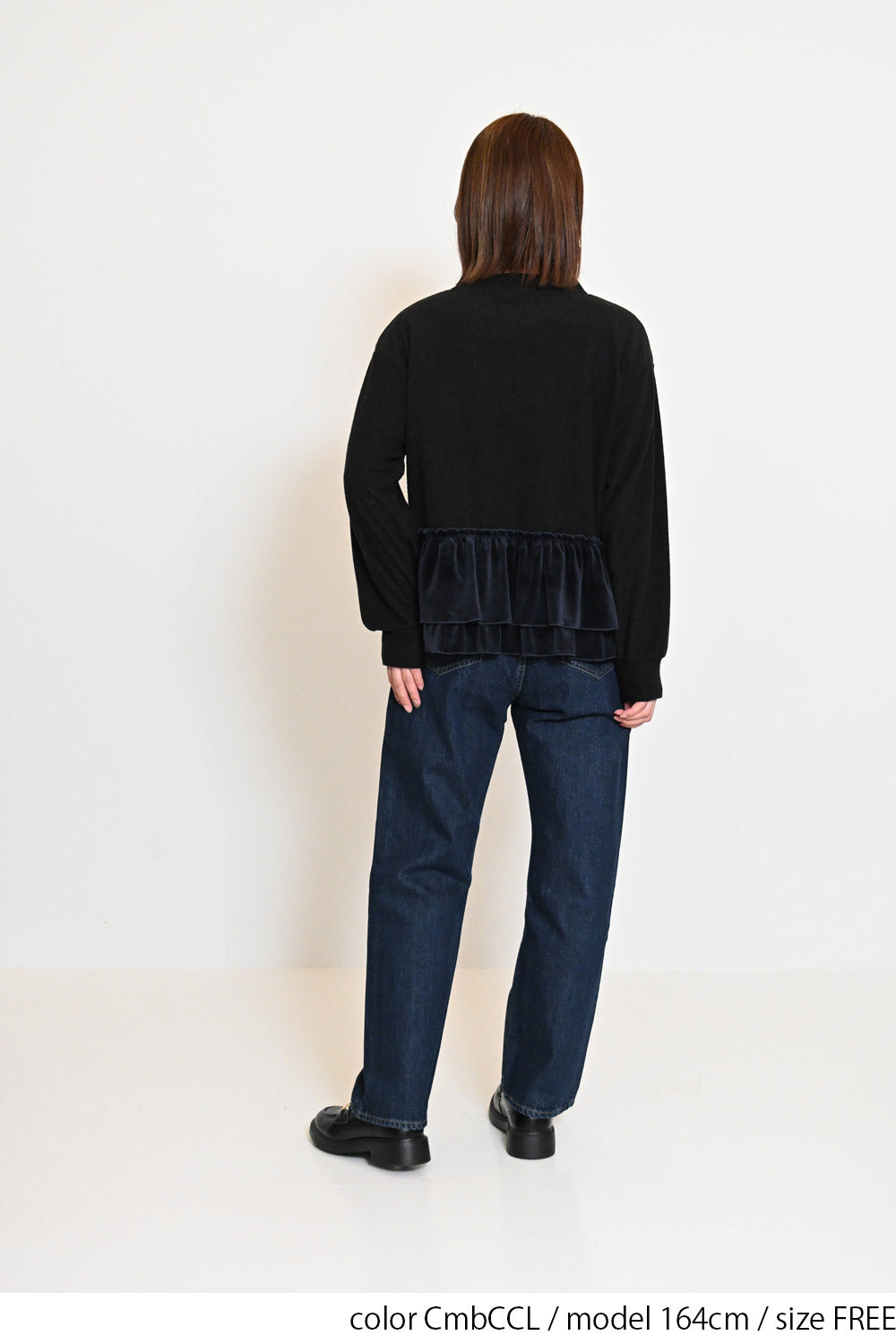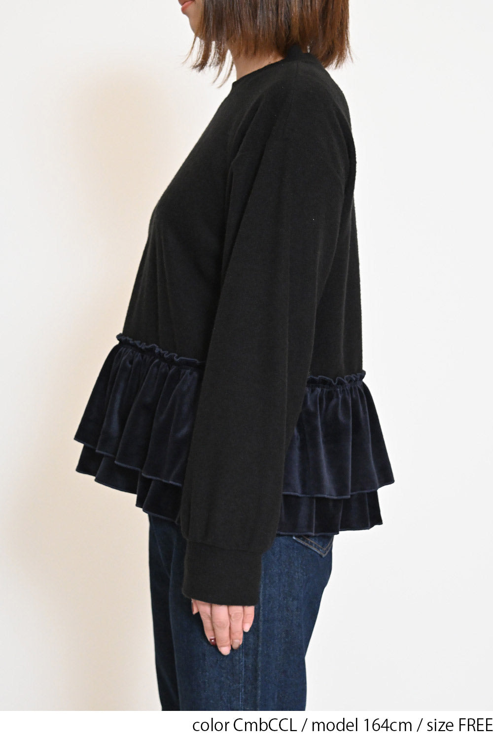 シンプルな表起毛カットソーに、ベロア素材のフリルをあしらい、1枚で旬なレイヤード風スタイルを叶えます。
