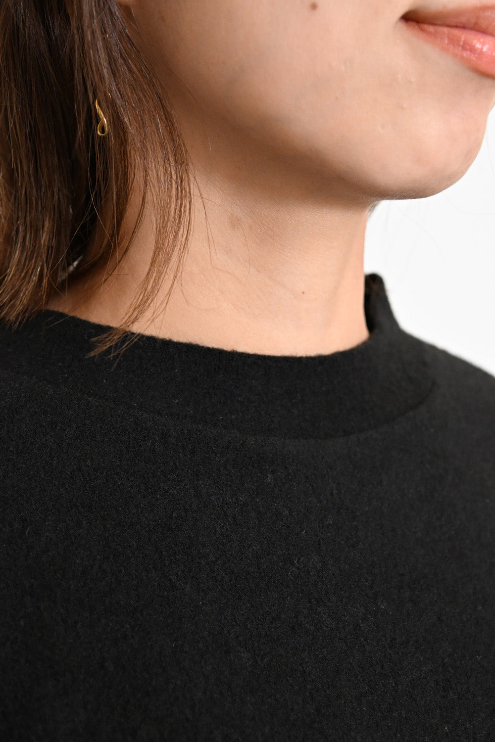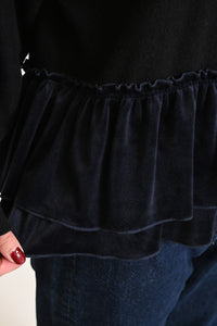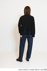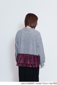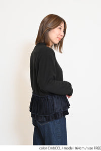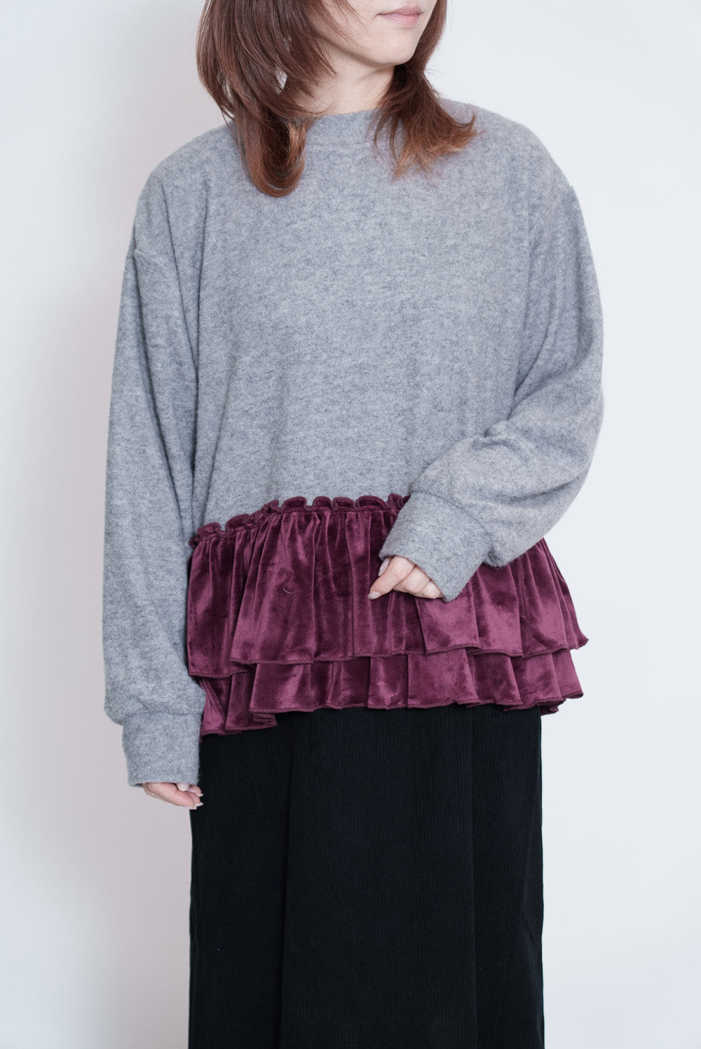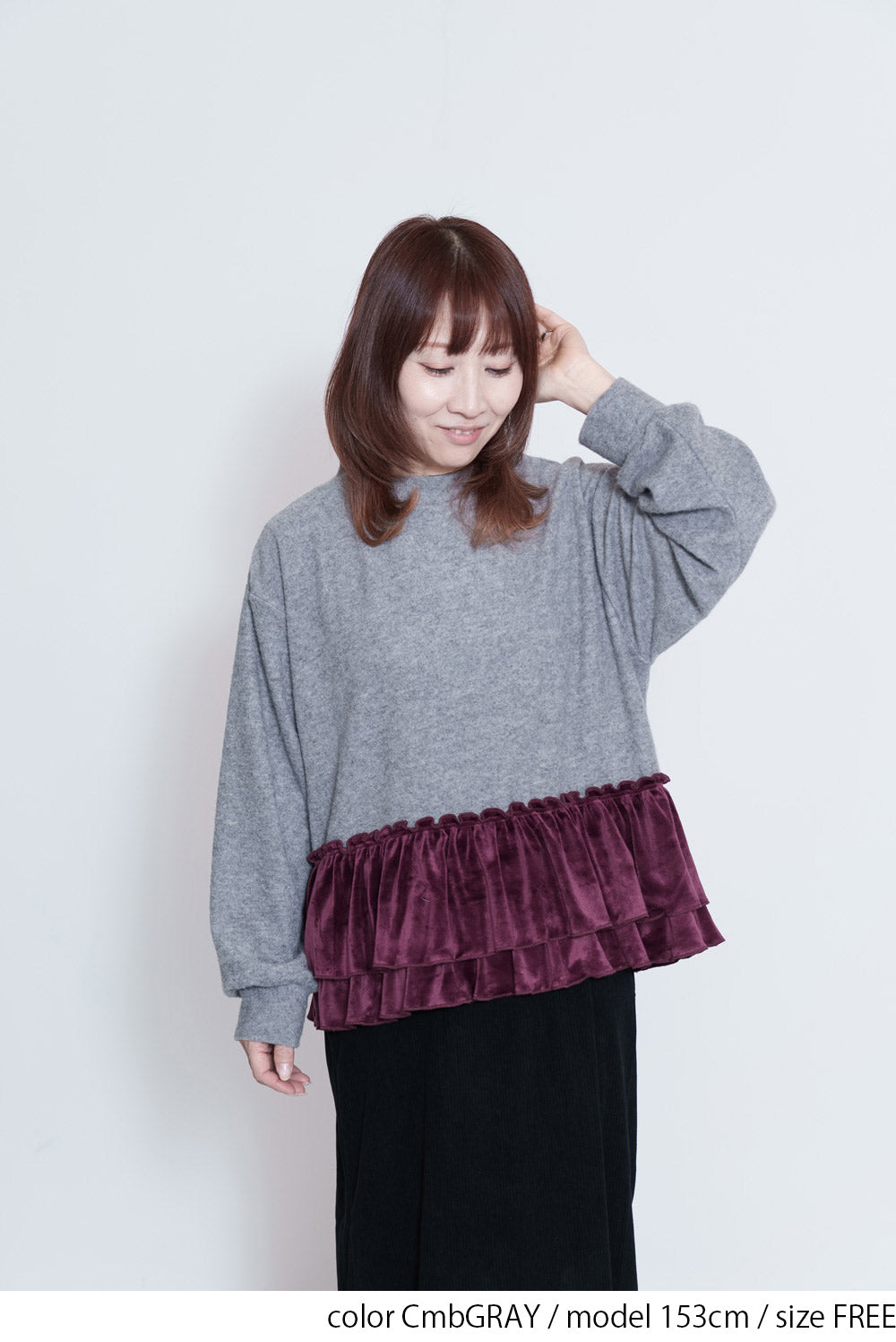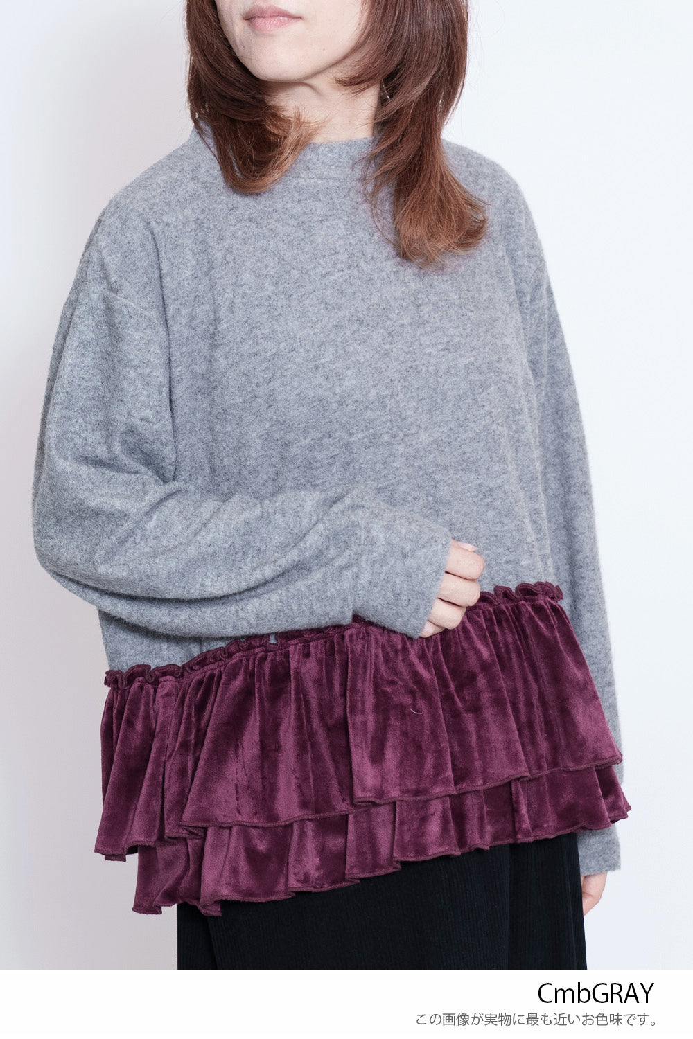 シンプルな表起毛カットソーに、ベロア素材のフリルをあしらい、1枚で旬なレイヤード風スタイルを叶えます。