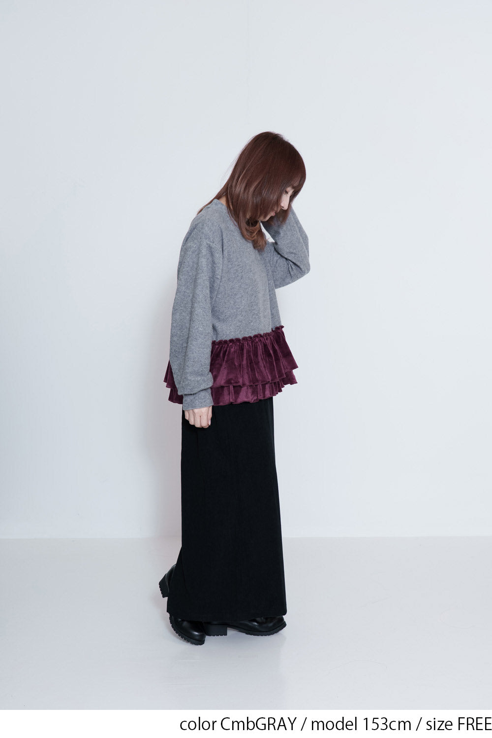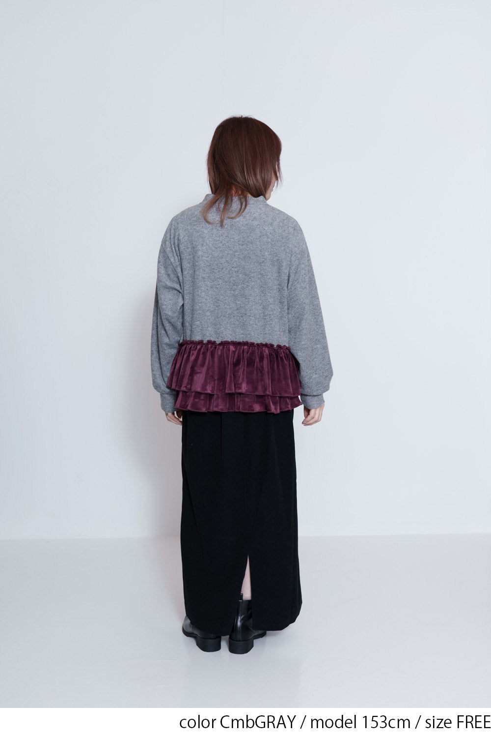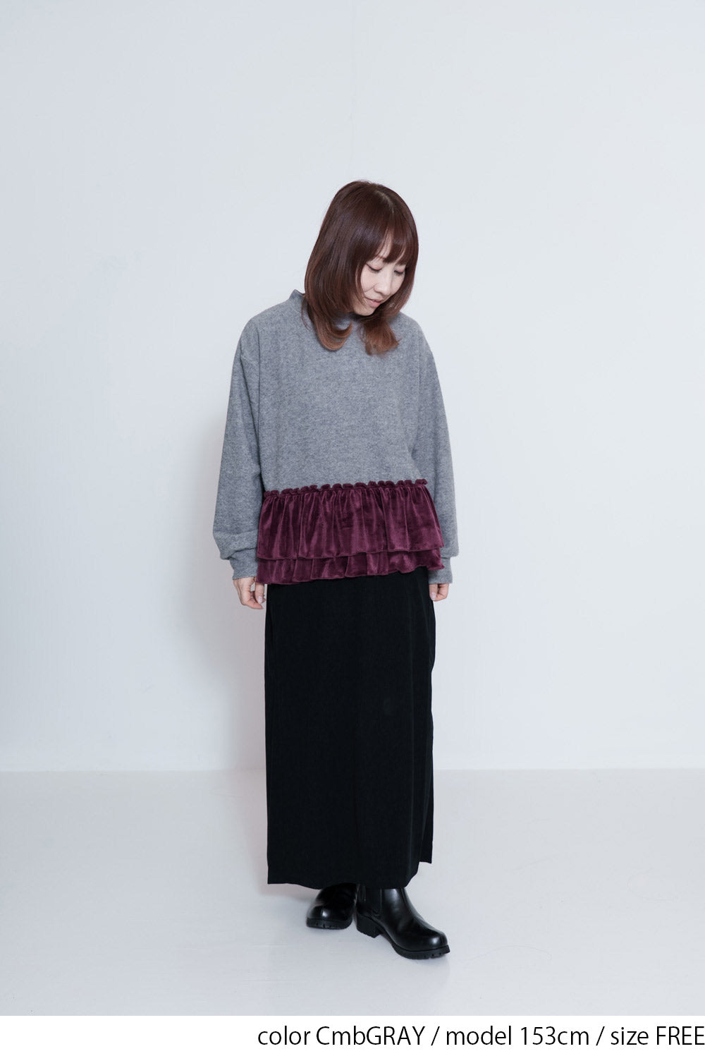 裾のフリル部分は光沢感のあるベロア素材を使用し、コーデに上品なアクセントをプラス。