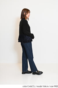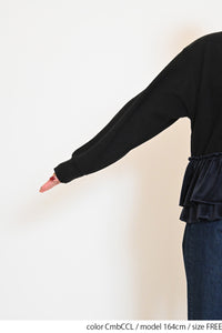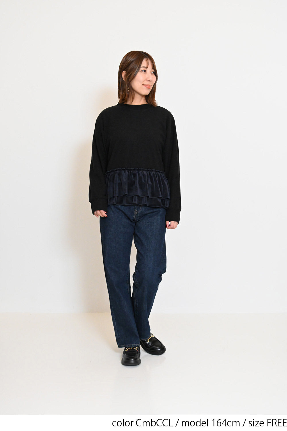 ショート丈スウェットやニットを重ね着すれば、裾からフリルが除くレイヤードスタイルが簡単に楽しめます。